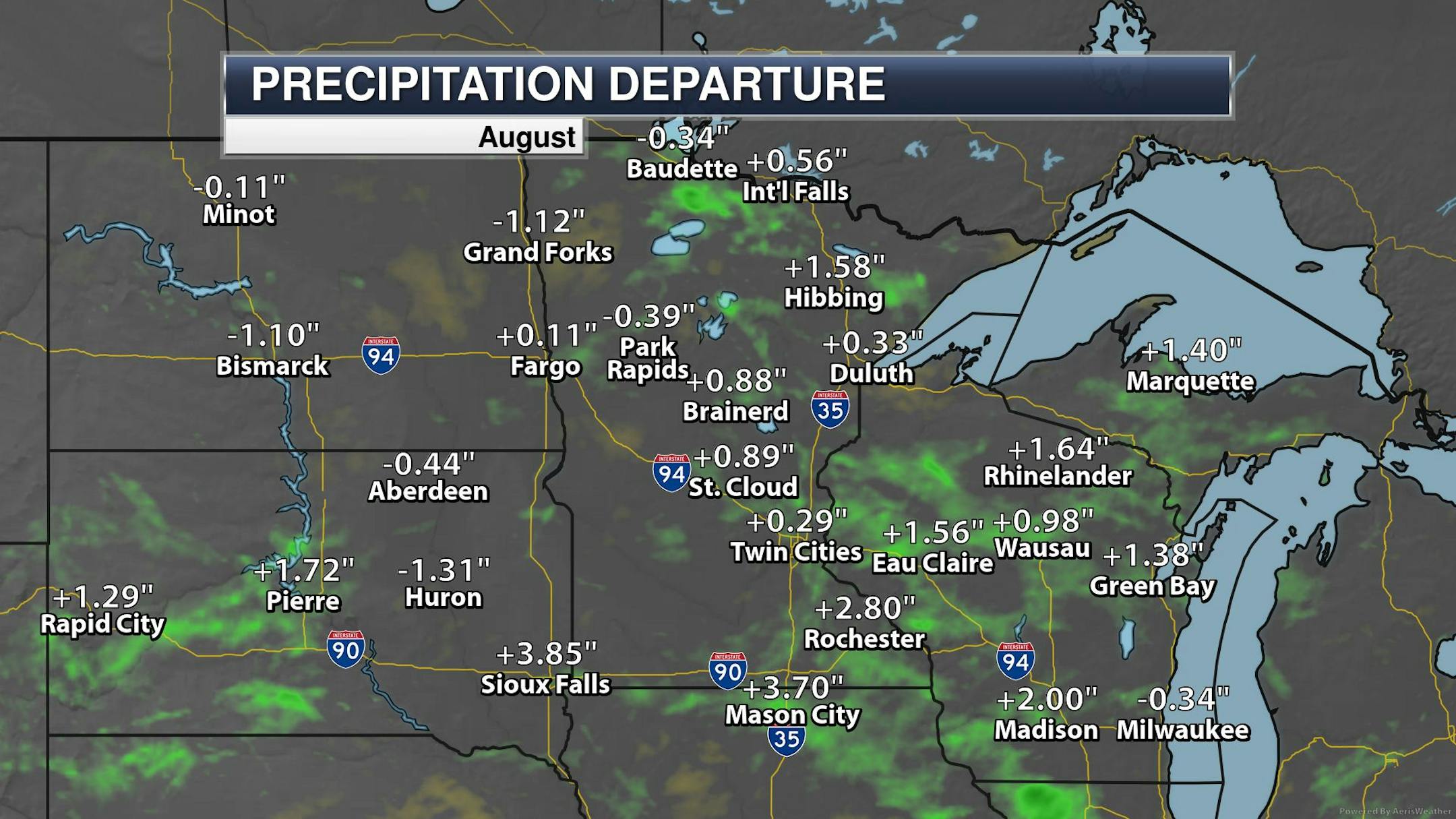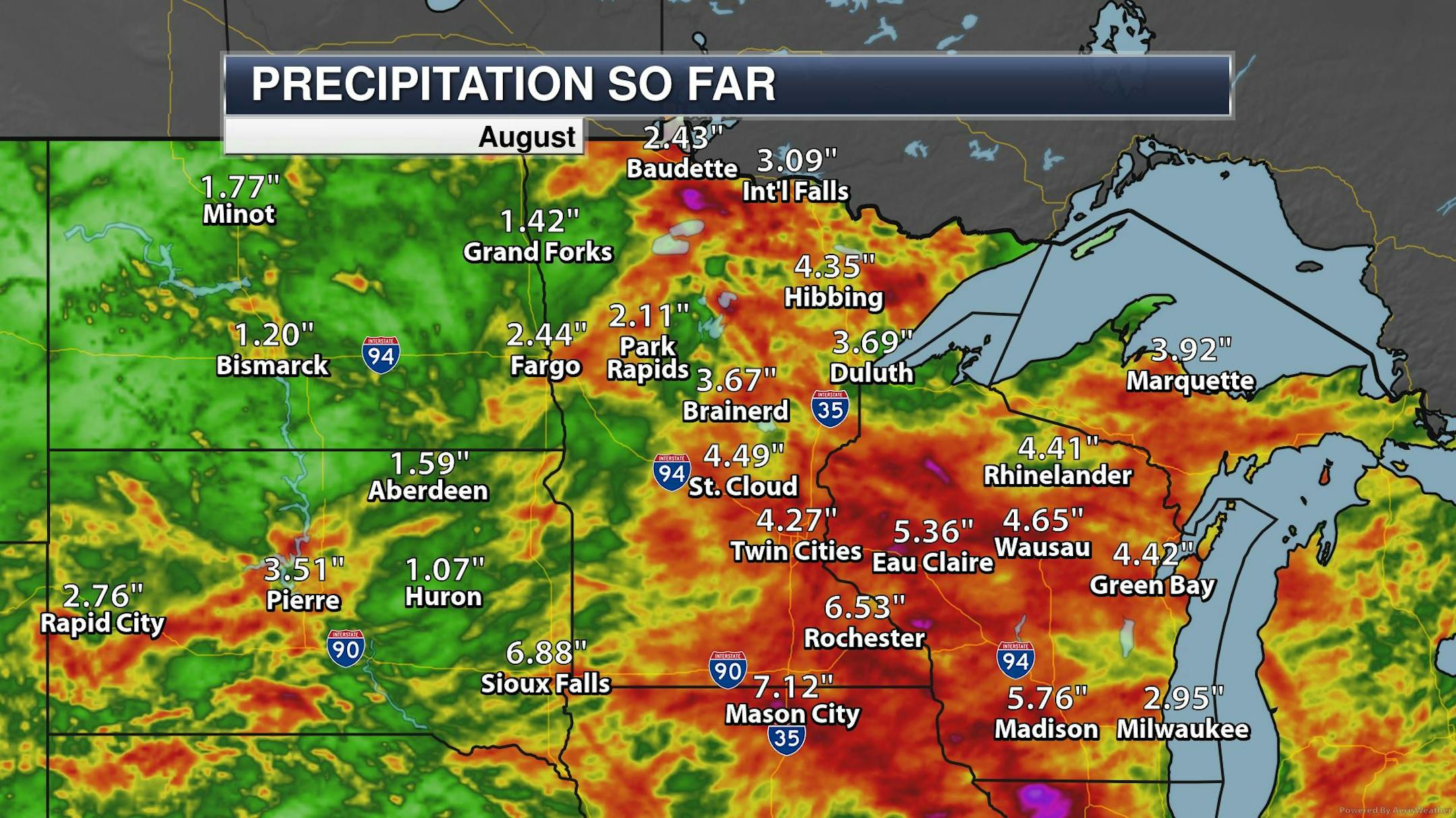 August ends on Wednesday with no additional rainfall expected through the end of the week. With that being said, here's a look at how main rain has fallen across the region this month. Some of the heaviest tallies fell south and east of the Twin Cities, where some hefty surpluses are in place from Eau Claire to Rochester to Mason City and Sioux Falls. In fact, Sioux Falls and Mason City will likely see their 8th wettest August on record.