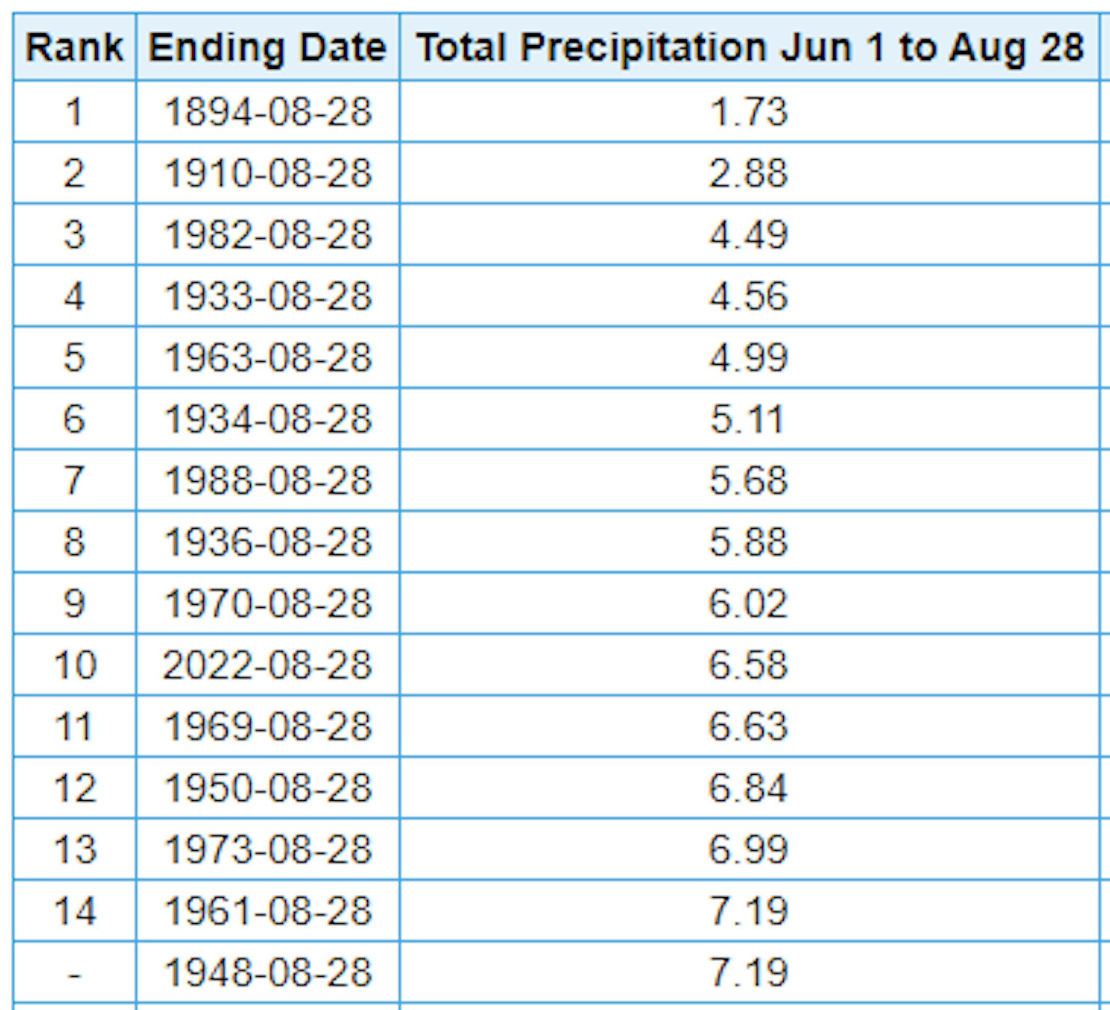 Here are the 15 driest summer's on record at MSP. Note that this summer (since June 1st) has been the 10th driest, last year was the 15th driest. If MSP doesn't see any additional rainfall through the rest of August, this would be the 9th driest summer on record.