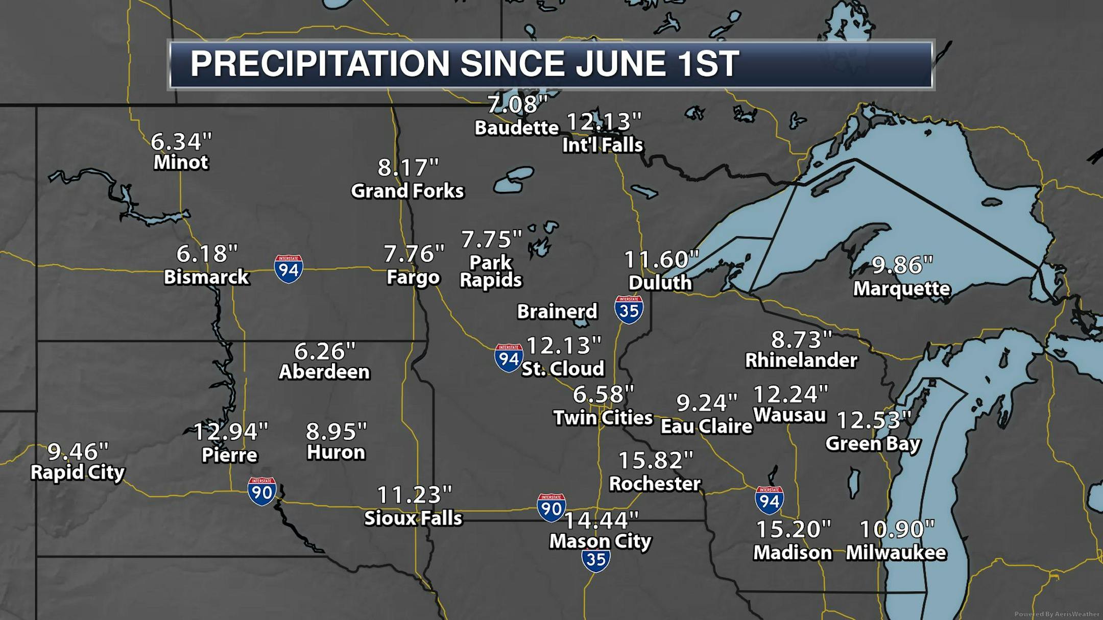 Here's how much rain has fallen across the region so far this summer (since June 1st) and it really has been hit or miss. Pierre, SD has seen more that a foot of rain, which will likely be the 5th wettest summer on record there. Meanwhile, the Twin Cities is nearly 6 inches below average, which will likely be its 9th driest summer on record.