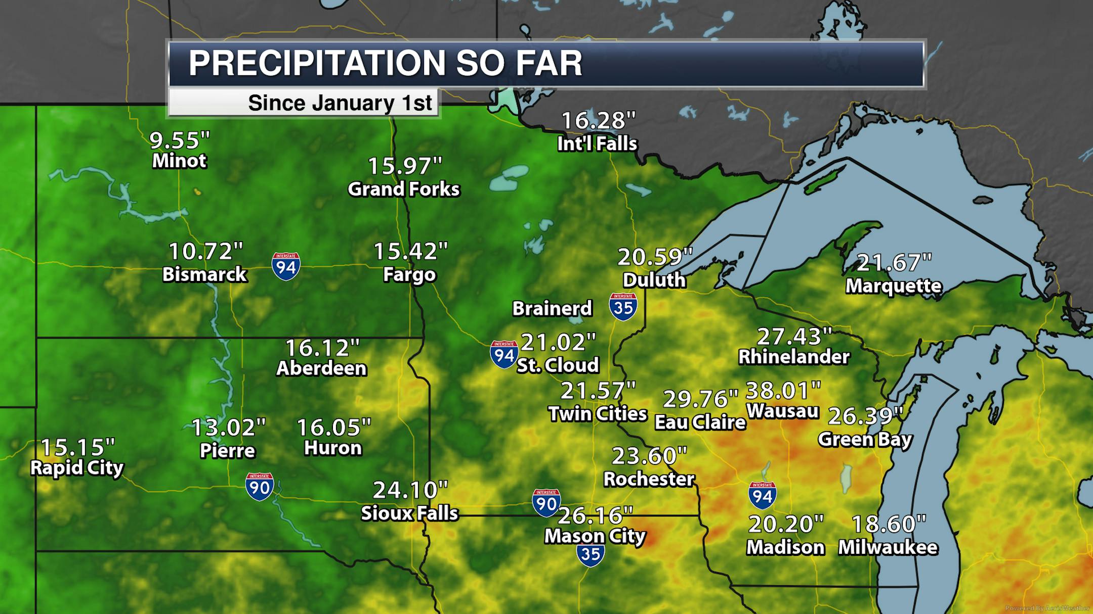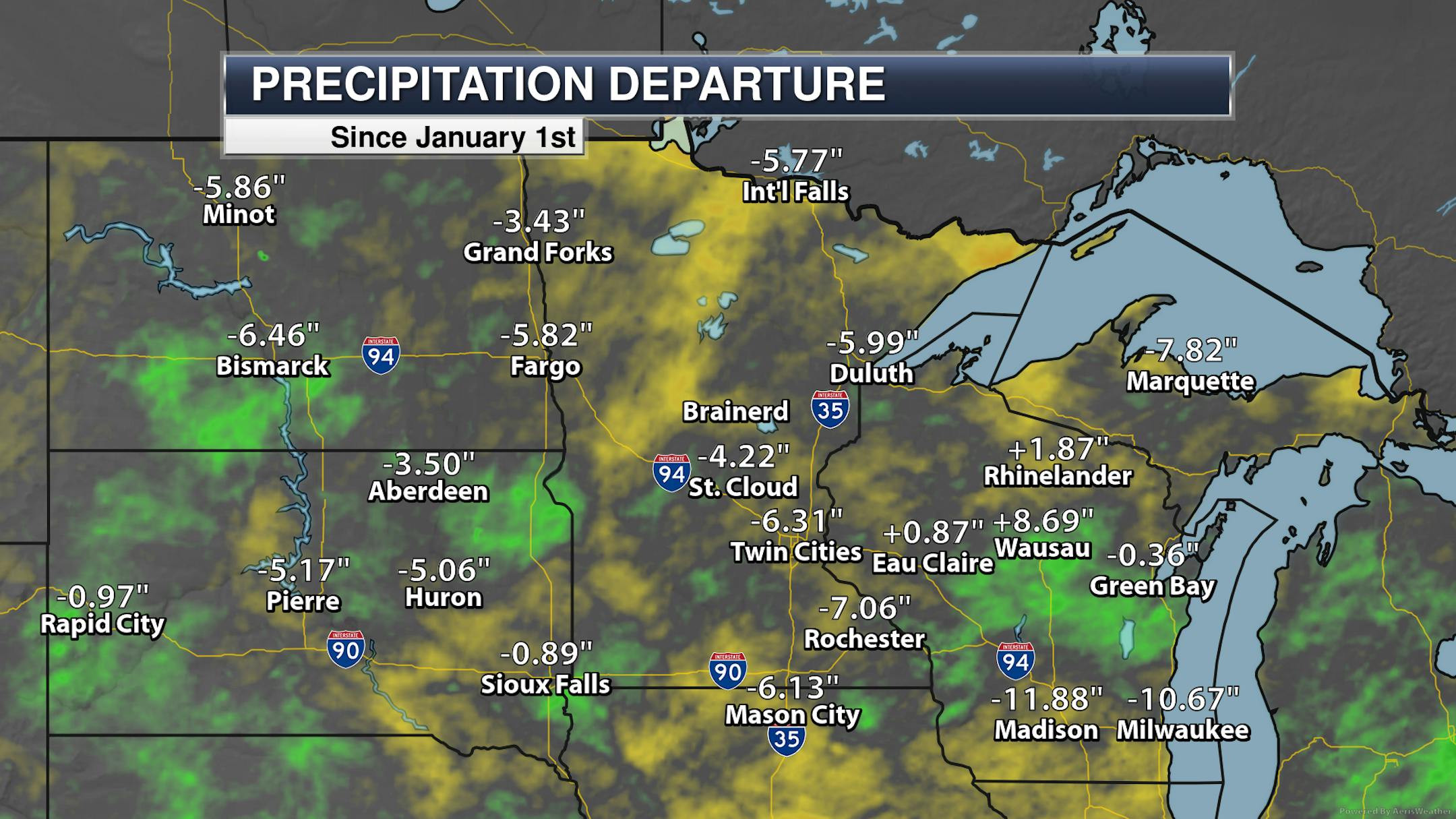 Even with the above-average rainfall in some locations this autumn, we are still running far below average in most locations for the year due to our dry summer. Both the Twin Cities and Rochester are over a half a foot below average, with Duluth just knocking on the door of joining that club. Then you take a look at Wausau where they are over 8" above average!