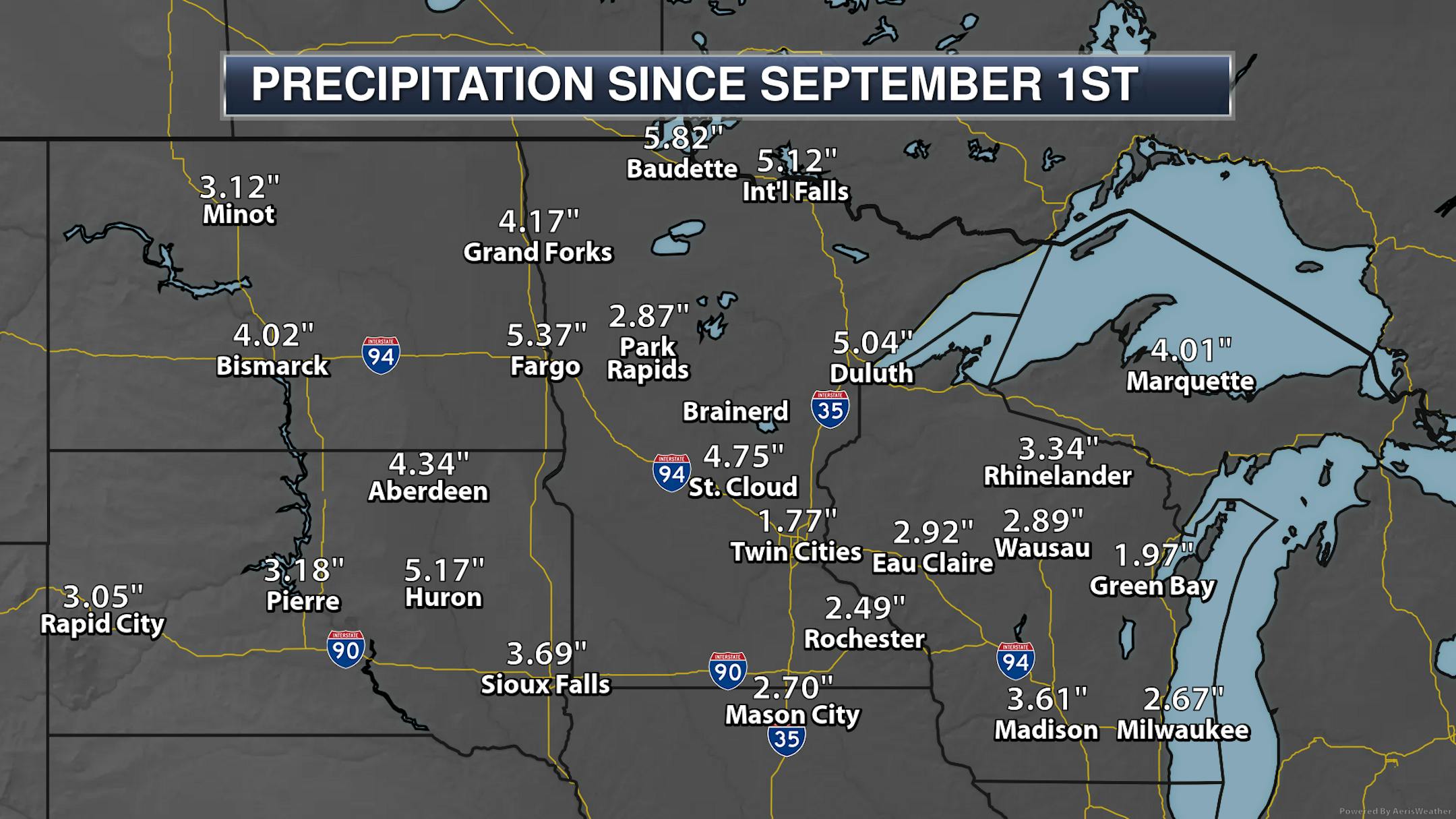 We've seen a mixed bag of precipitation across the state since the beginning of meteorological autumn back on September 1st, with 4-5"+ for areas like St. Cloud, Duluth, International Falls, and Baudette, but less than two inches for the metro. Over half of the rain that has fallen since September 1st fell before Labor Day at MSP. Meanwhile, even with just over 5" of rain at Duluth so far this season they're still 0.18" below average.