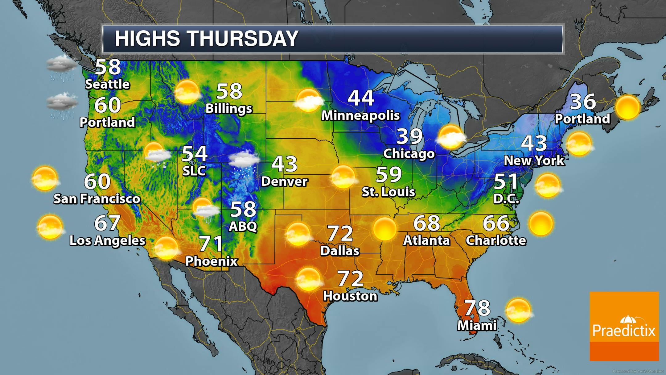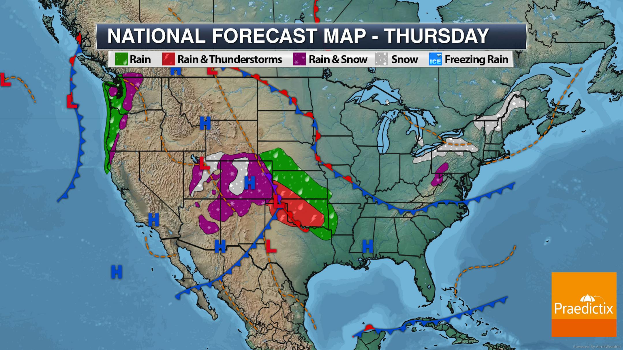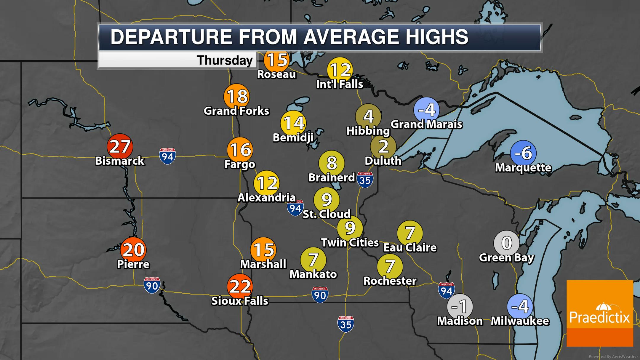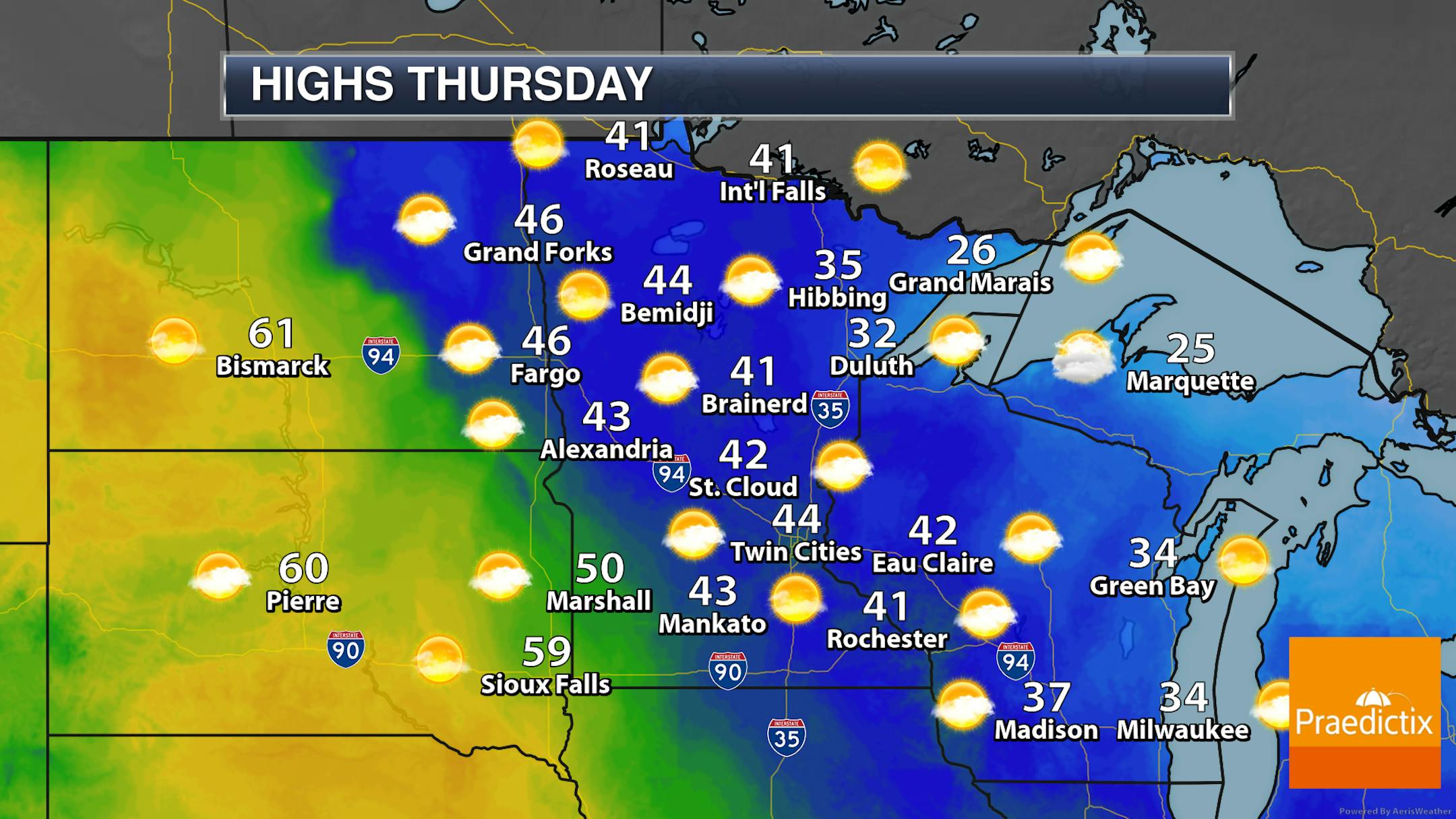 Another day of melting snow is expected across most of the state Thursday, with a mix of sun and clouds in place. Highs will mainly be in the 40s statewide. There will be some exceptions, though. Areas of the Arrowhead and North Shore will only reach the 20s and 30s for highs with winds off of Lake Superior. Down in southwestern Minnesota, we will likely see some 50s.