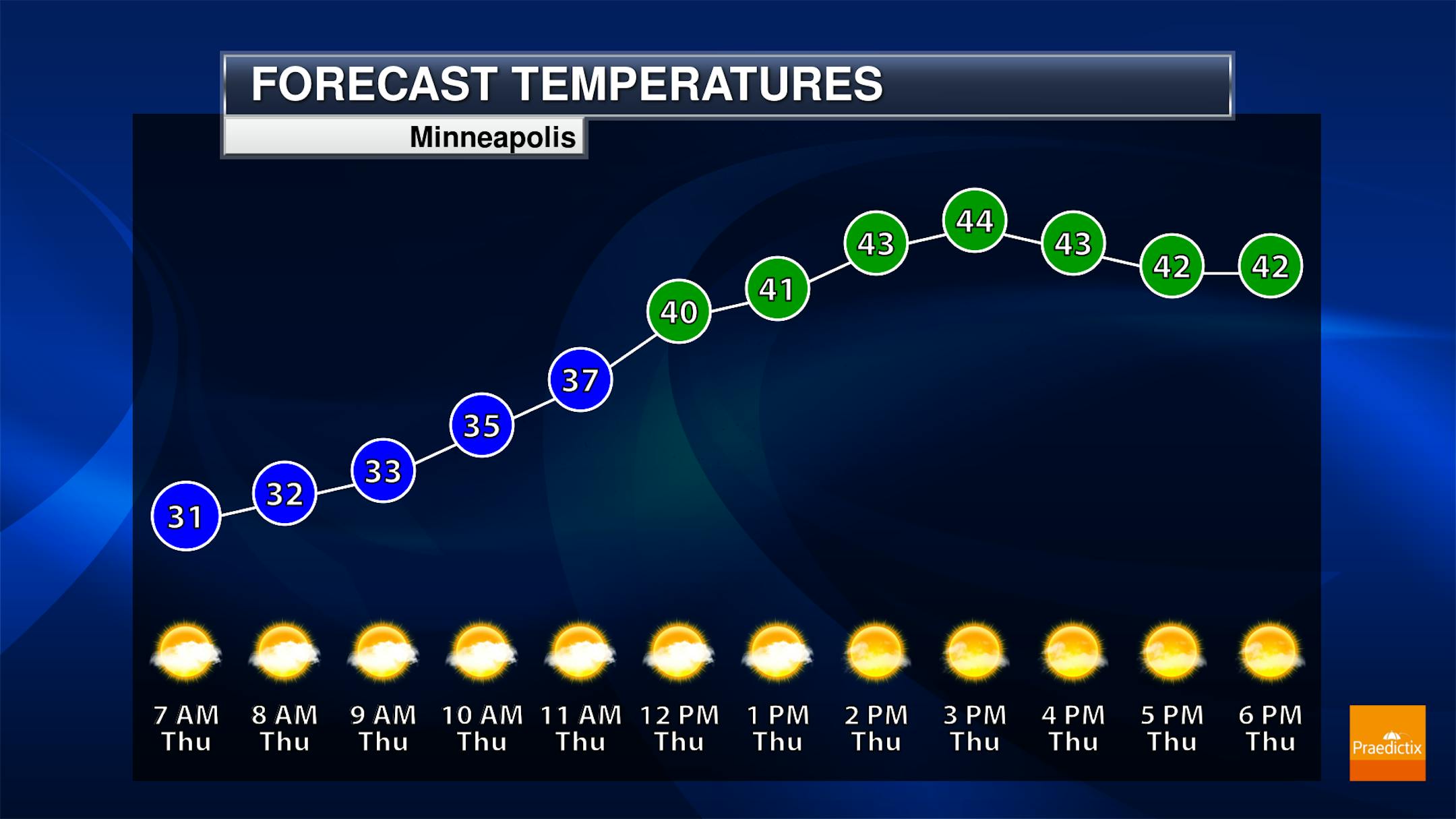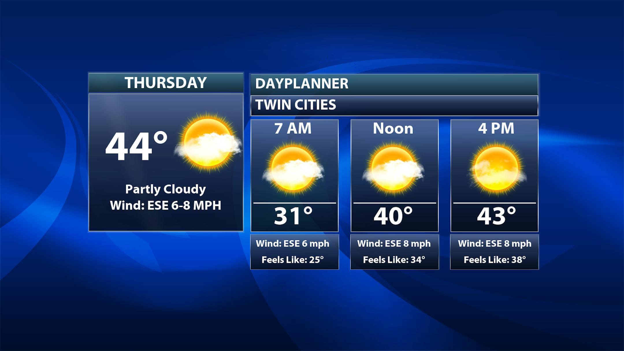 Another quiet, warm day of weather is expected Thursday in the Twin Cities. We could start off with some fog across the region due to our melting snowpack and lighter winds. However, a mix of sun and clouds are expected with temperatures climbing from the upper 20s in the morning to the mid (potentially upper) 40s in the afternoon.
