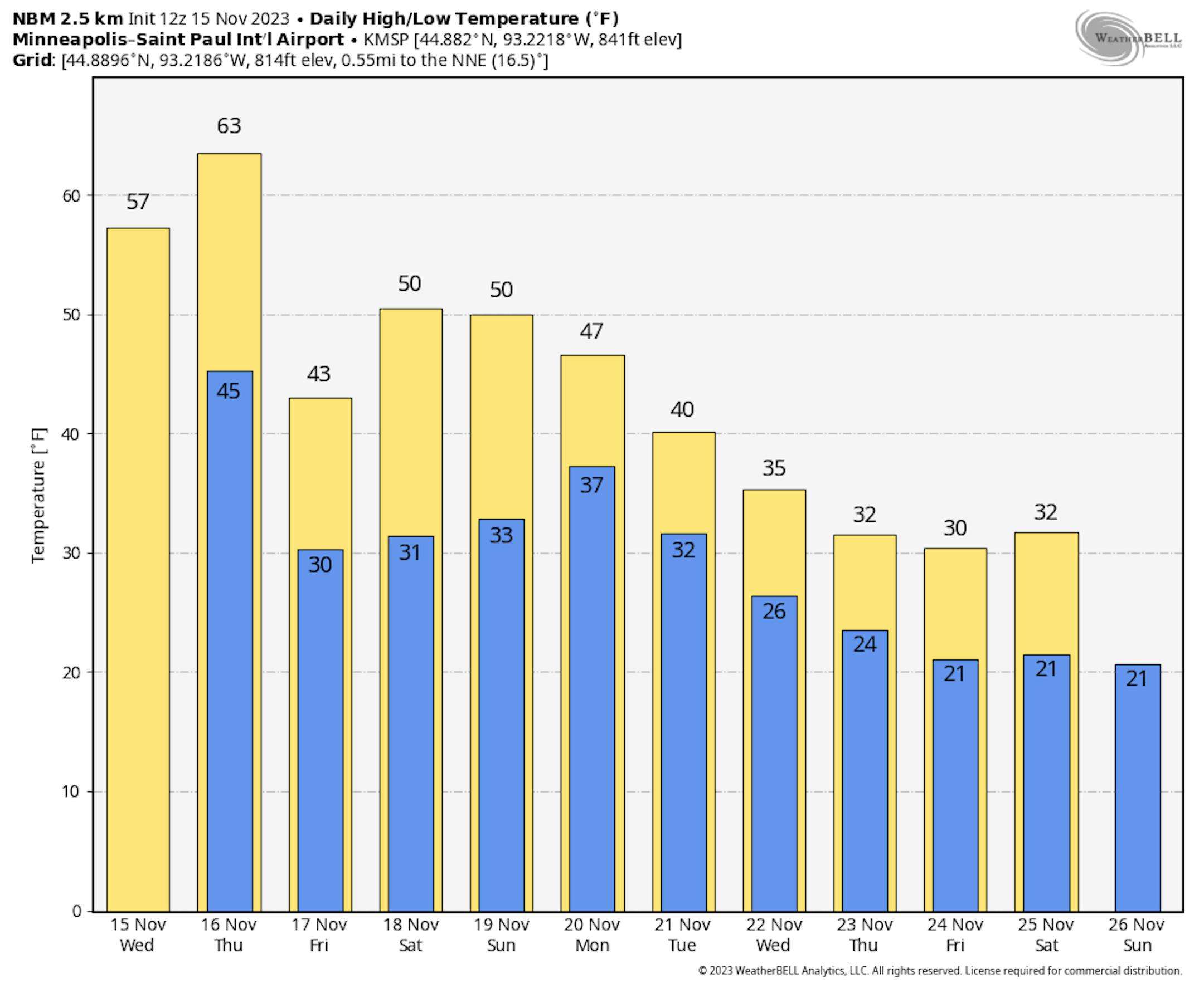 Wasn't Tuesday an excellent mid-November day across the region (despite the gusty winds)? MSP Airport made it to 66F for a high, and while it fell short of the 71F record from 1990, it was the second warmest November 14th on record. The only record high across the state Tuesday was up in International Falls where it reached 58F, beating the previous record of 56F from 1953.