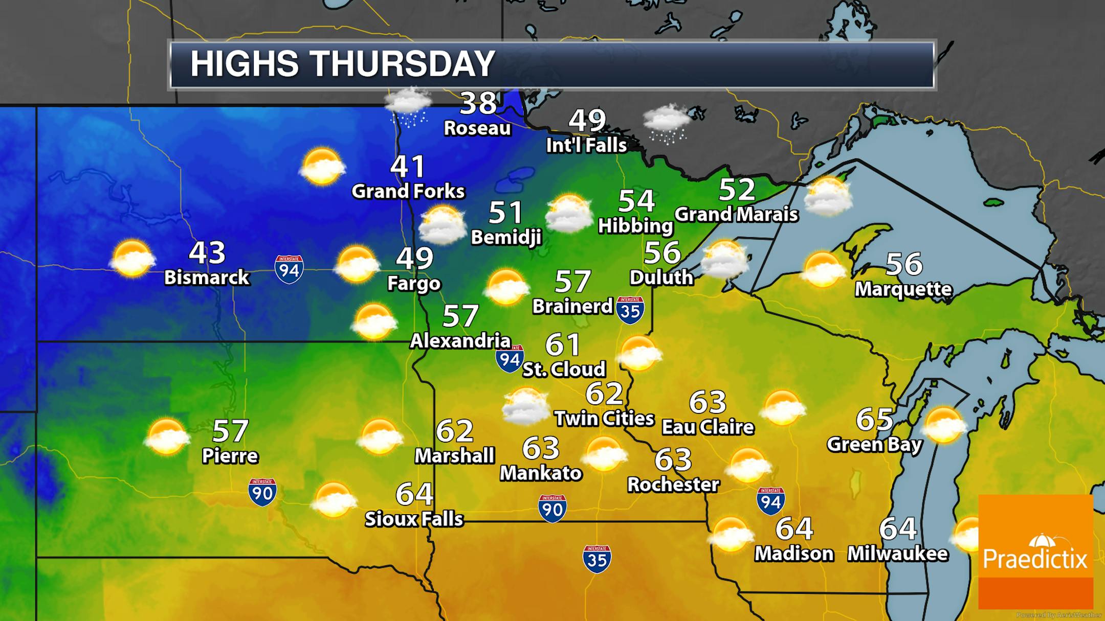 As a system rolls through the state on Thursday, most areas will remain dry. The best chance of precipitation will be across far northern Minnesota (where a mix or some snowflakes are possible) and late in the day in southeastern Minnesota (in the form of rain). With a cold front driving through the state, areas out ahead of it will be able to climb into the 60s. However, areas behind it for most of the day up in northwestern Minnesota will be stuck in the 30s and 40s.