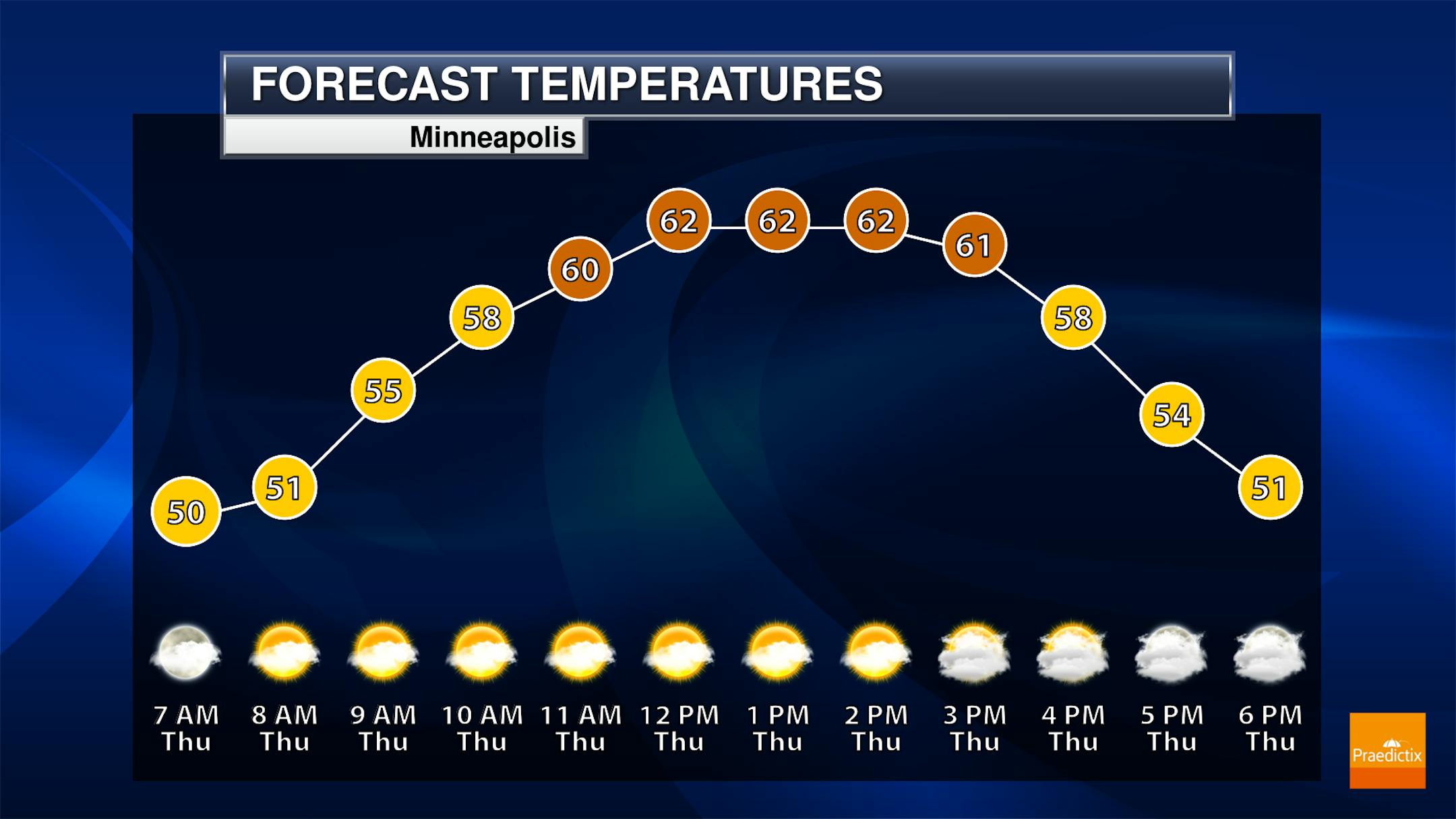 We're tracking a system moving across the state on Thursday. The Twin Cities will be out ahead of it through the midday/early afternoon hours, allowing temperatures to climb into the low 60s for highs along with strong gusty winds. Once we get behind it - closer to sundown - temperatures will start to fall. We'll also see increasing cloud cover, however, it is likely to remain dry in the metro.
