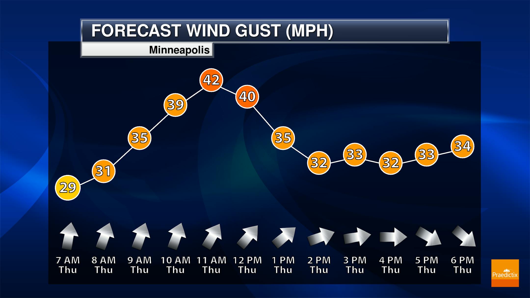 It'll be a windy Thursday across the region as well, with gusts peaking around 40 mph in the midday hours right before the frontal boundary moves through in the metro. That'll switch the winds from out of the south to eventually the northwest by the evening hours.