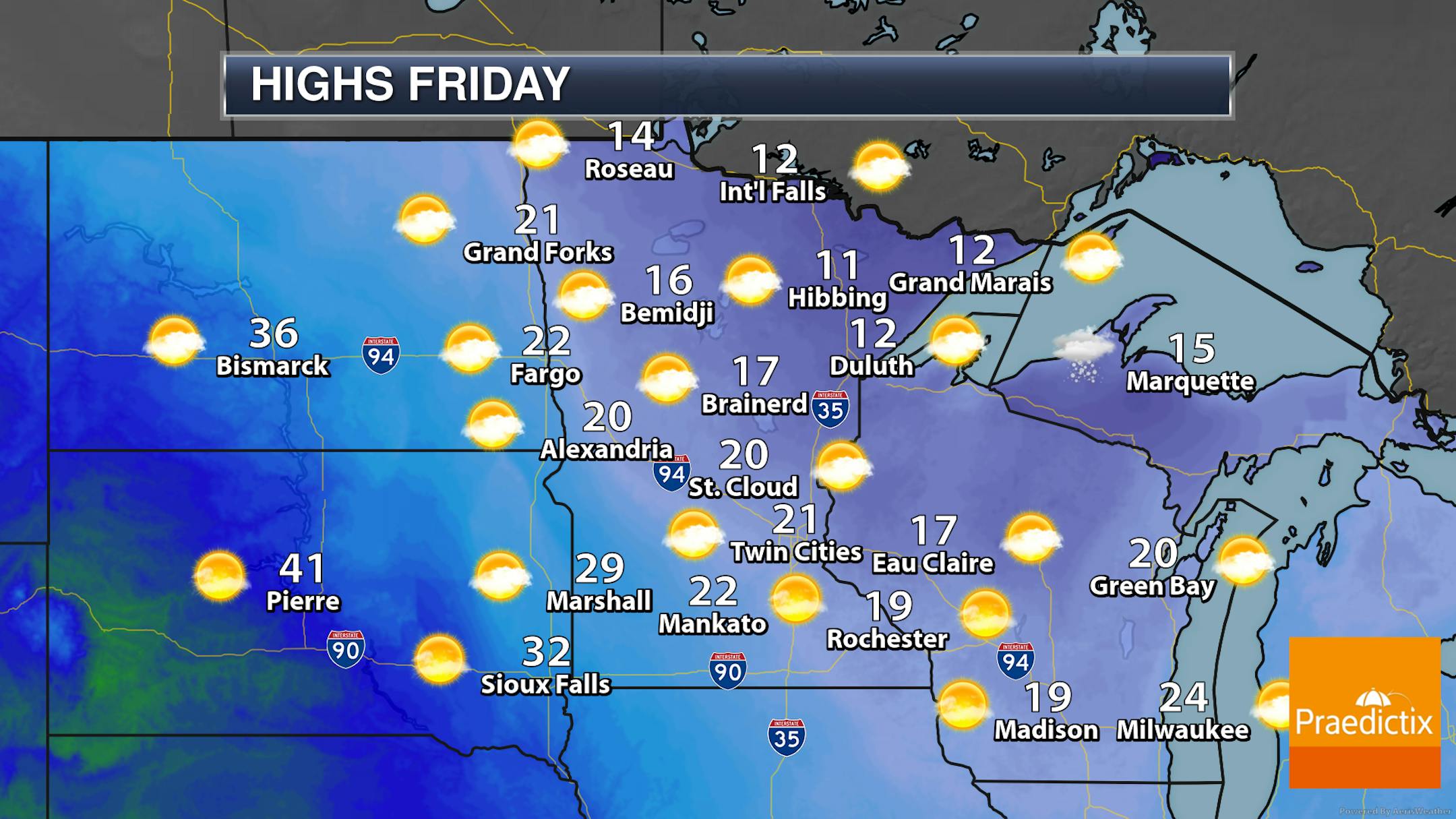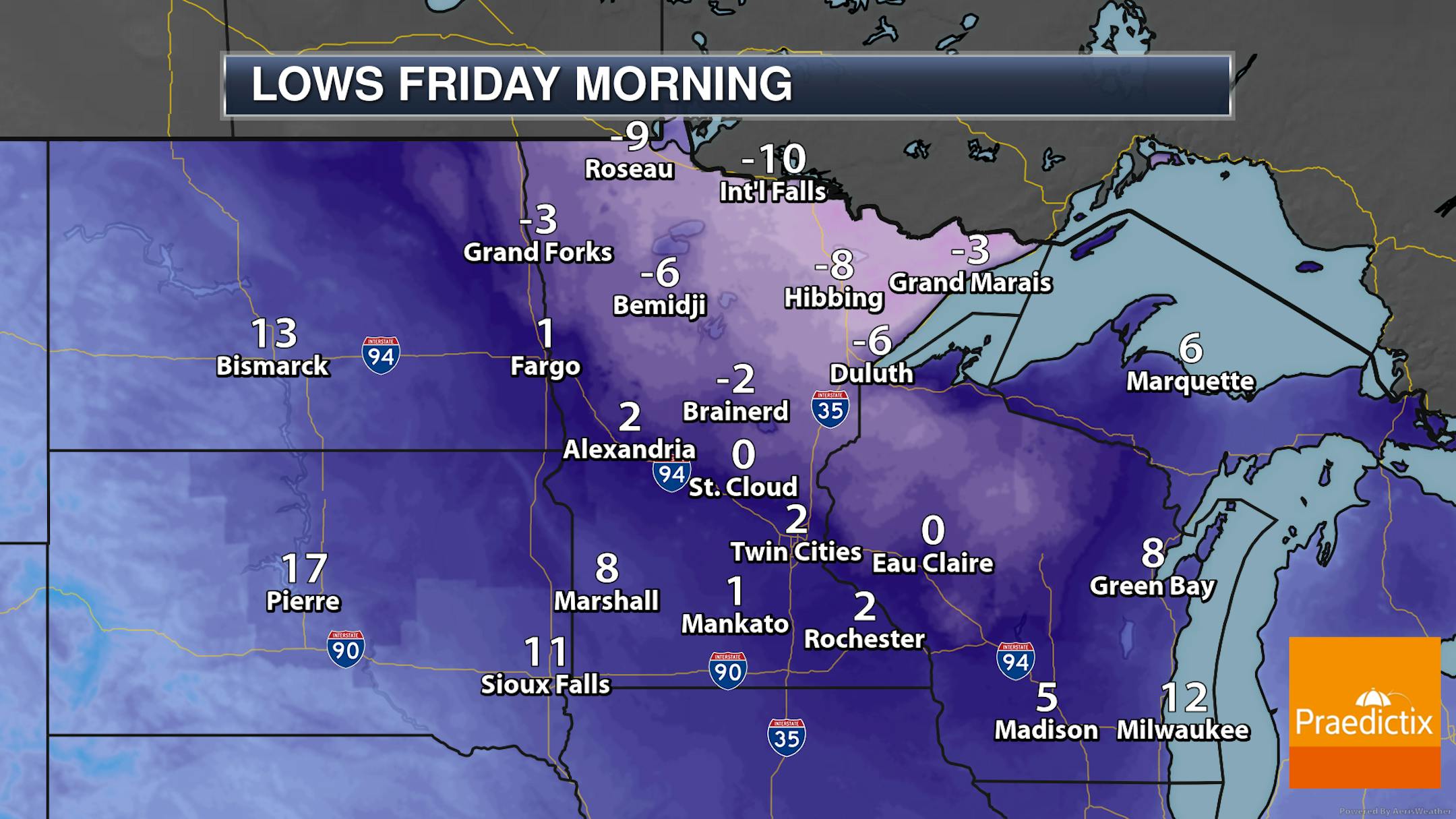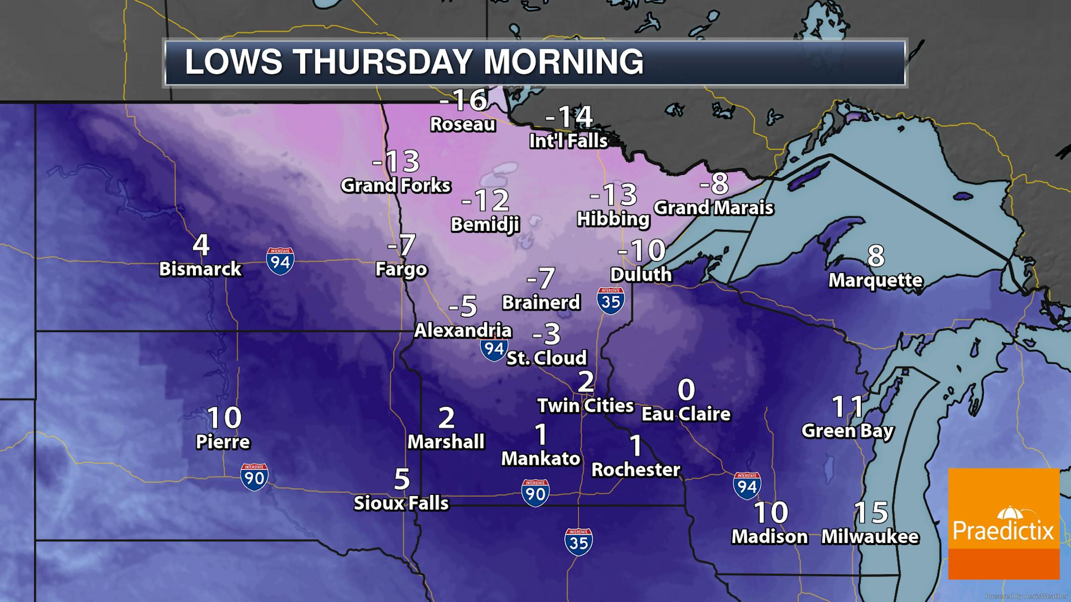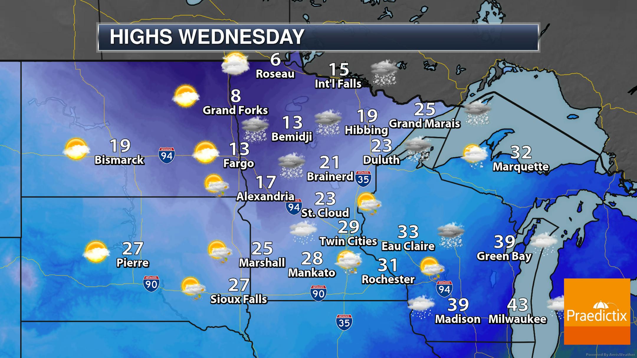 So we already talked about the snow chance heading into the middle of the week. Now it's time to talk about the "Arctic cold" part of the Arctic cold front. Highs in the Twin Cities Wednesday will be set early in the day as temperatures will drop during the daylight hours. Highs across portions of northwestern Minnesota won't make it out of the single digits, and in some far-most northwestern areas daytime highs may struggle to reach positive numbers.