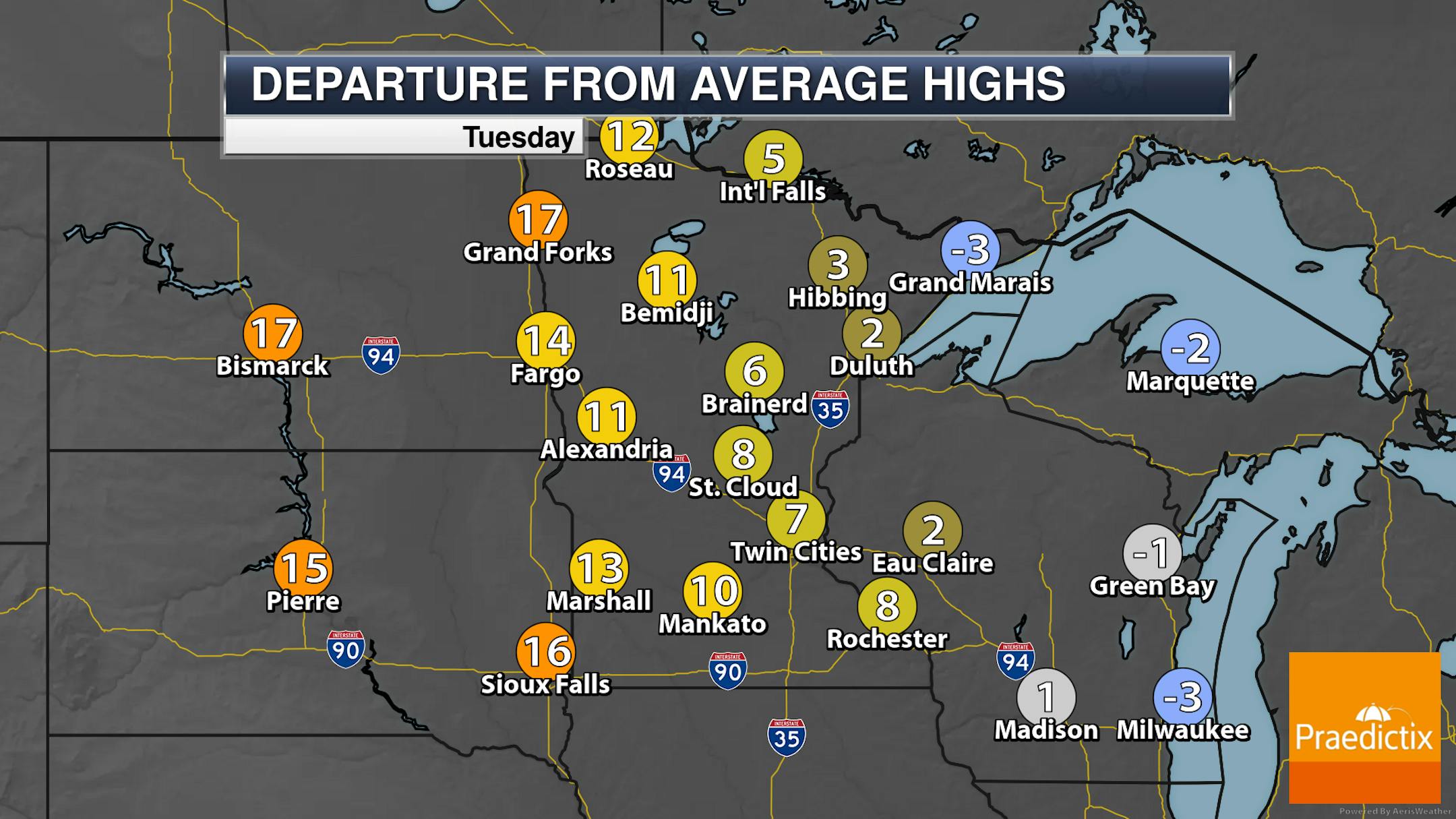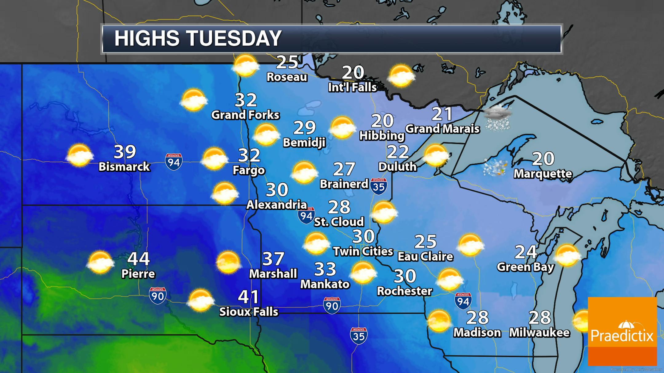 While a few snow showers will be possible early Tuesday morning in the Arrowhead, most of the state will see quiet weather with a mix of sun and clouds. Highs range from the 20s up north to near 40F down by Sioux Falls.