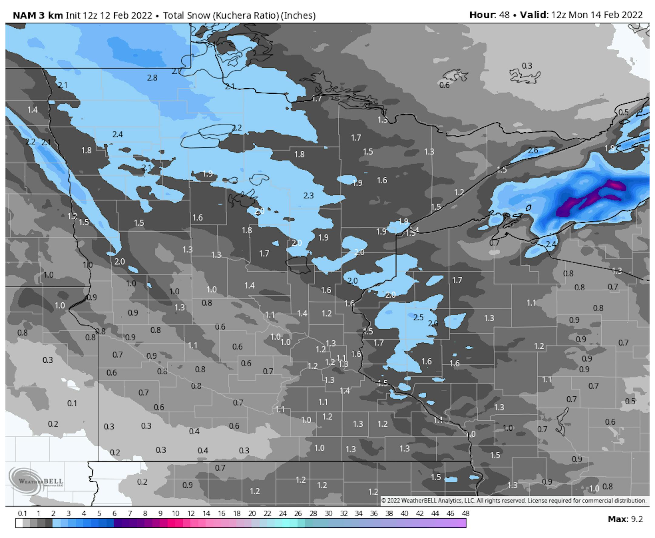 Here's the snowfall potential through AM Monday, which shows some minor coatings possible along and north of the I-94 corridor. There could be 1" to 2" of snow north of the metro, which could make for some slippery road conditions overnight and into Monday morning.