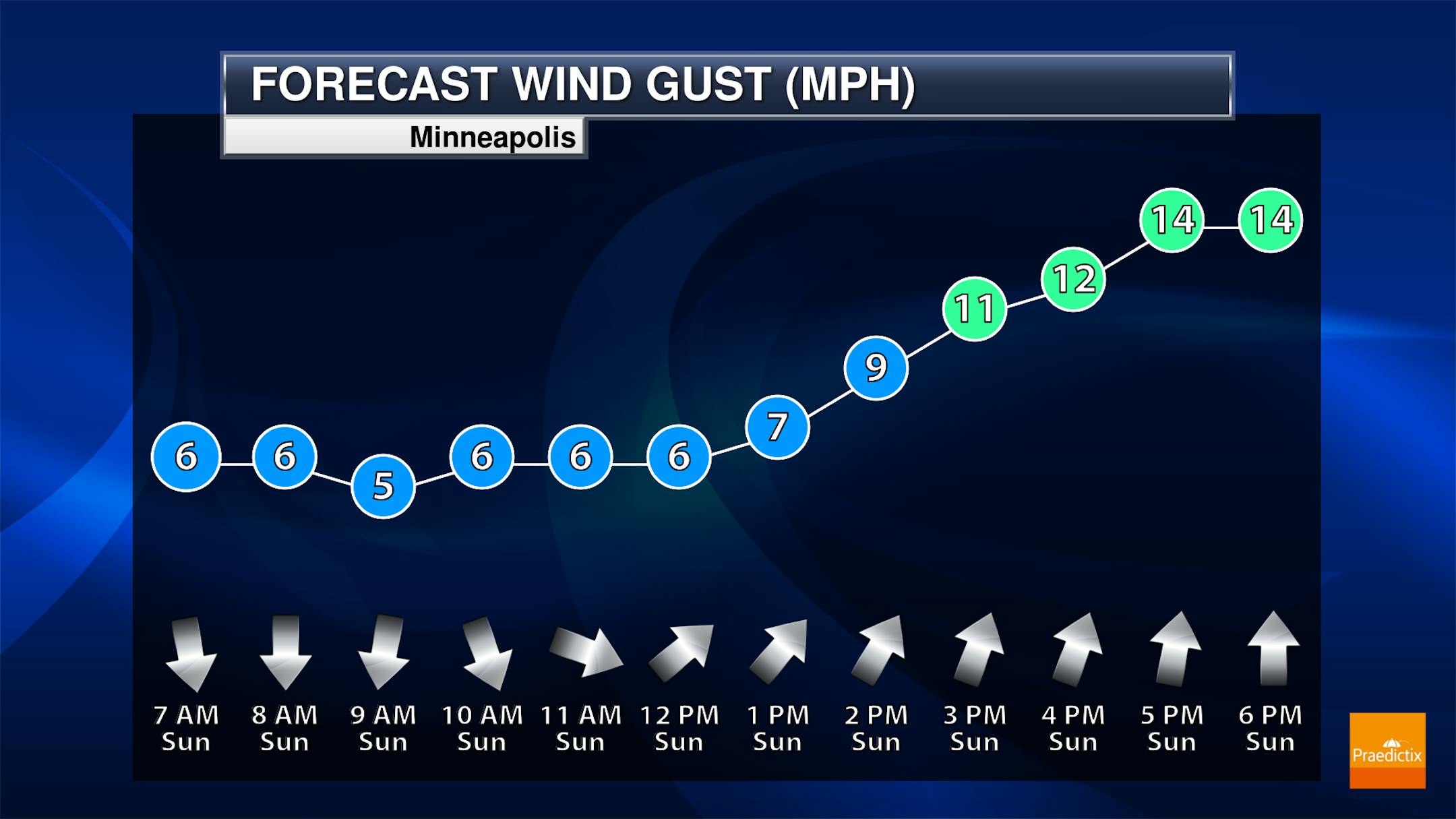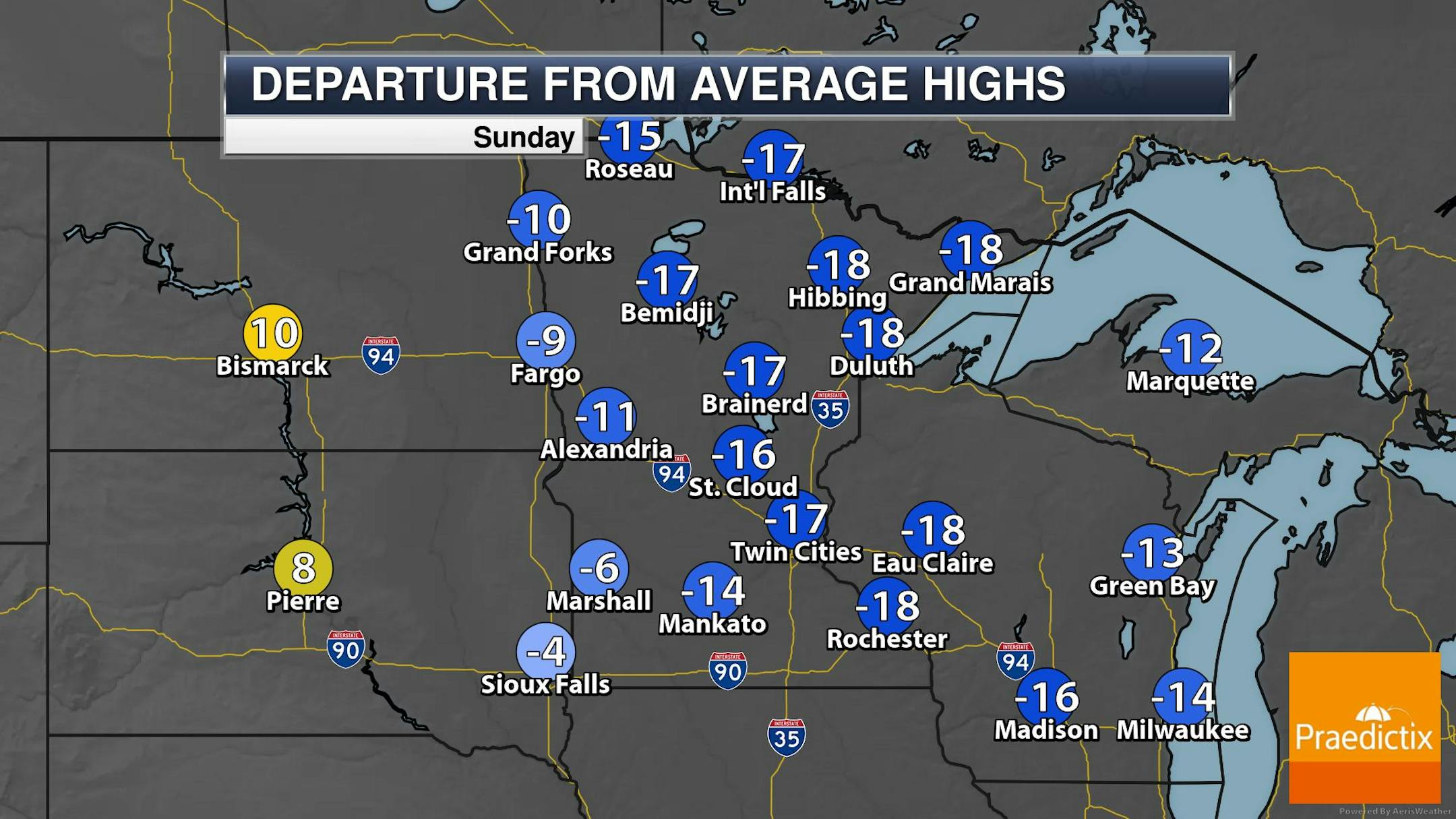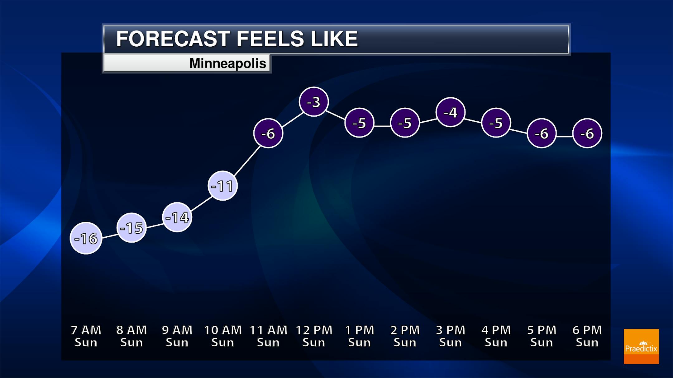 Feels like temps for Minneapolis on Sunday will be much colder in the morning with readings in the teens below zero. Feels like temps during the afternoon will only warm into the single digits below zero, so it'll be a cold mid-February day!