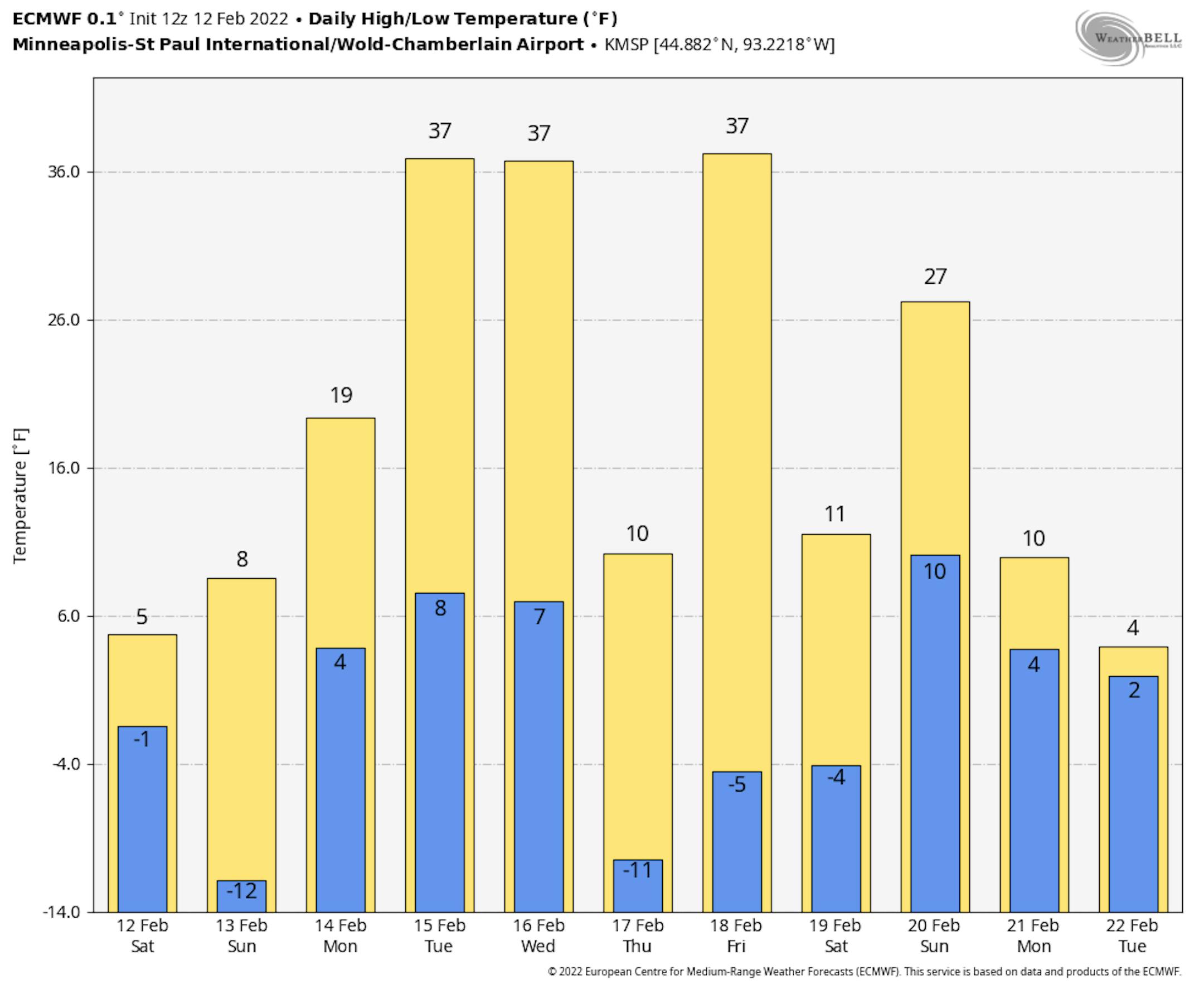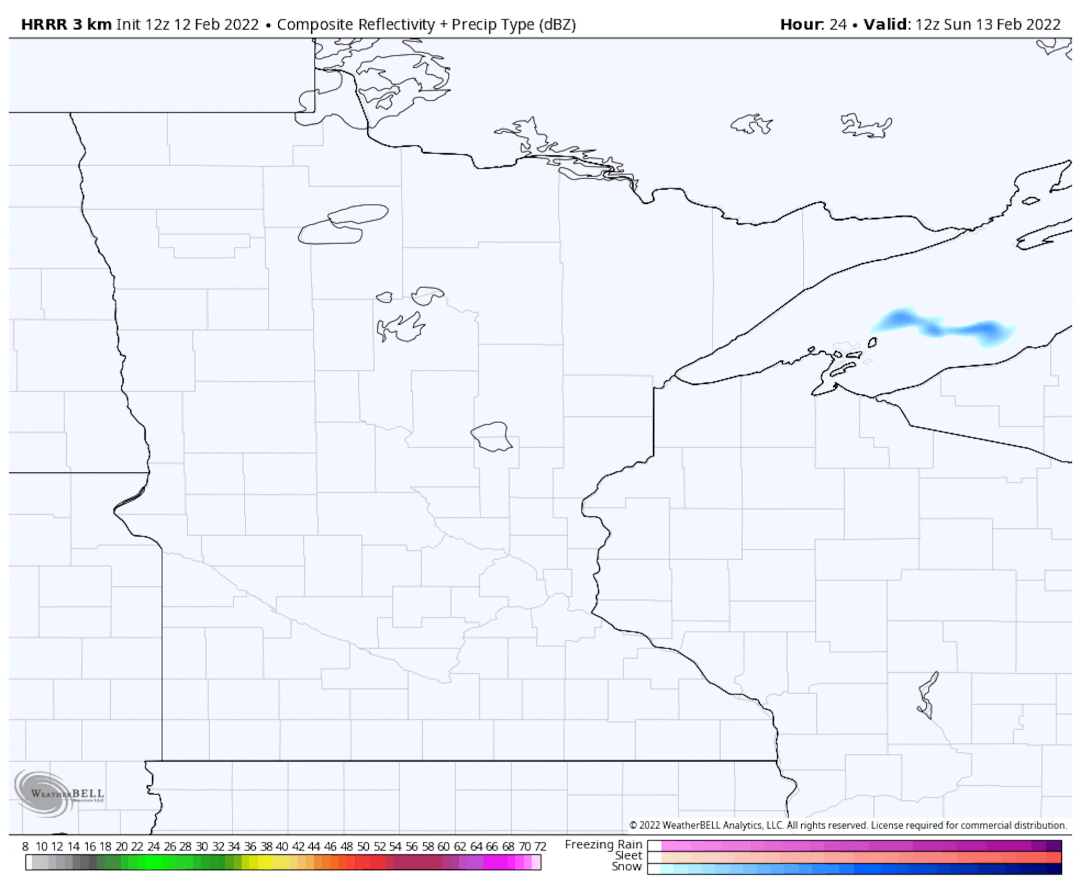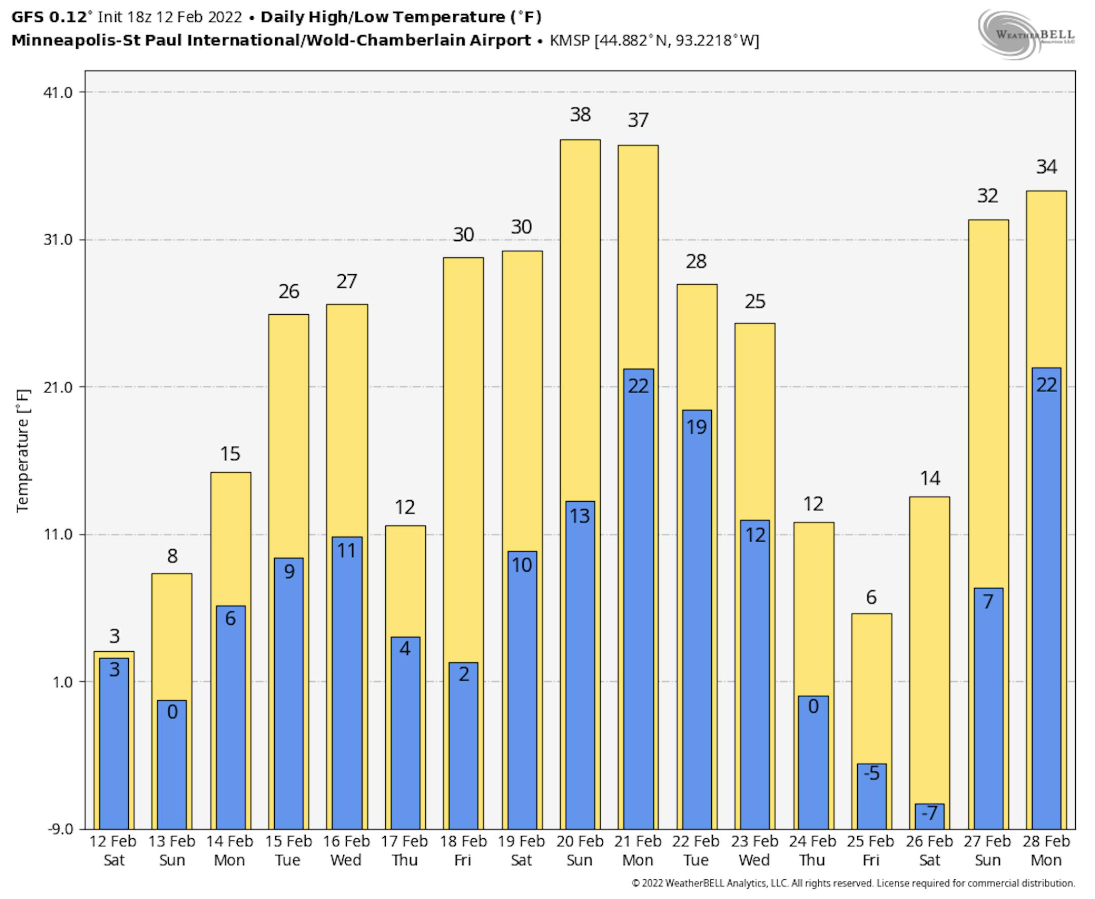 Feels like temps for Minneapolis on Sunday will be much colder in the morning with readings in the teens below zero. Feels like temps during the afternoon will only warm into the single digits below zero, so it'll be a cold mid-February day!