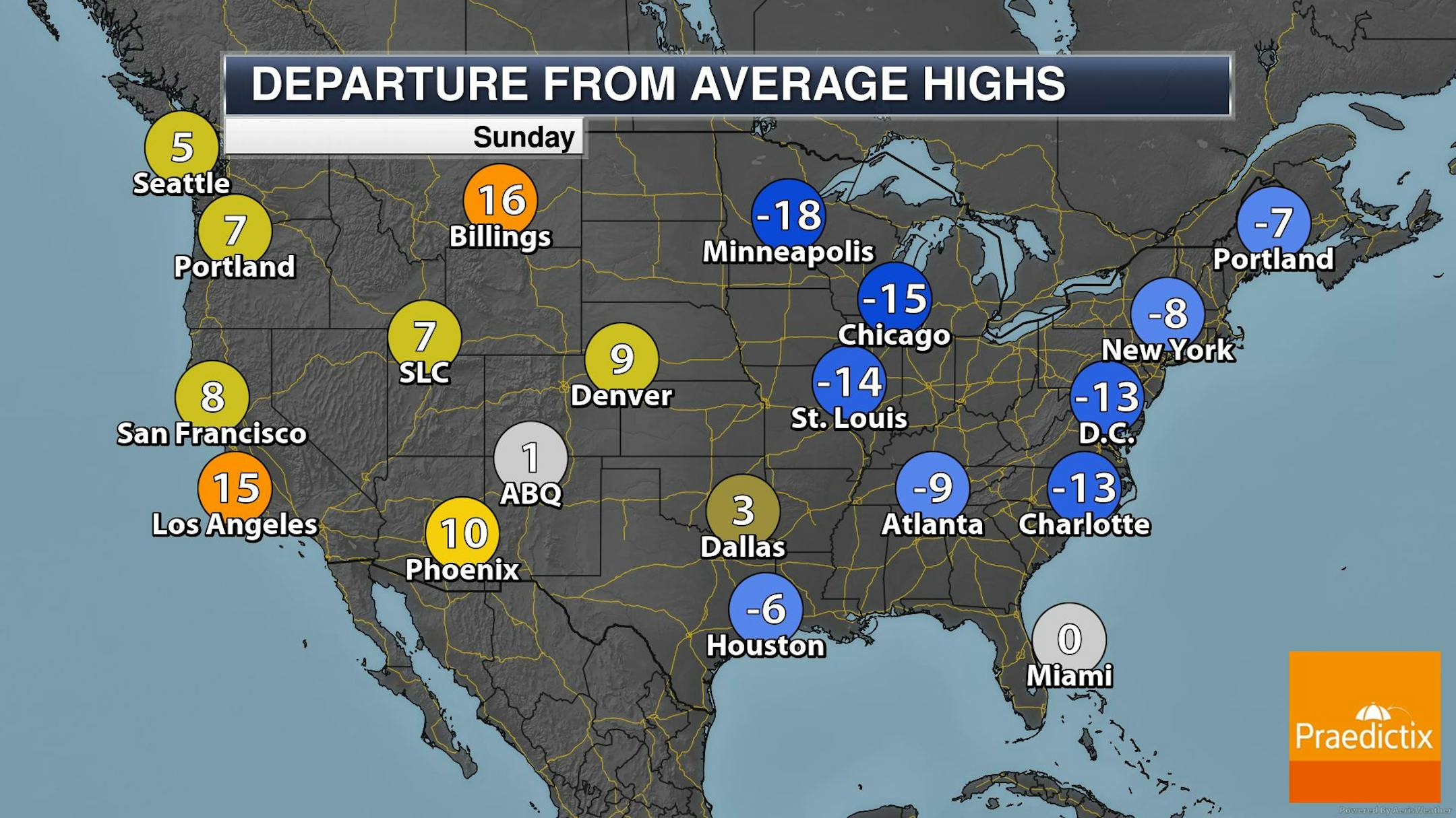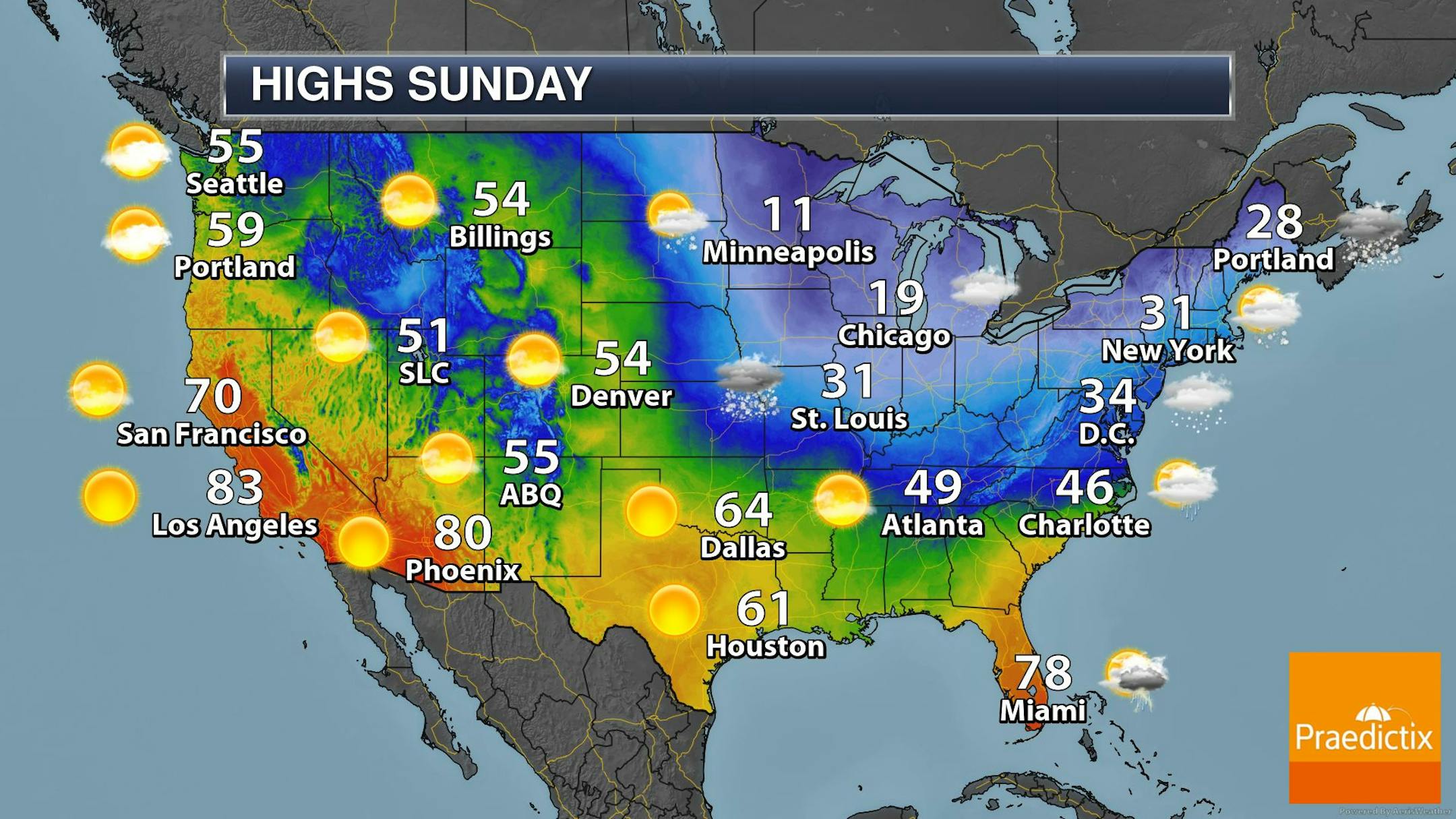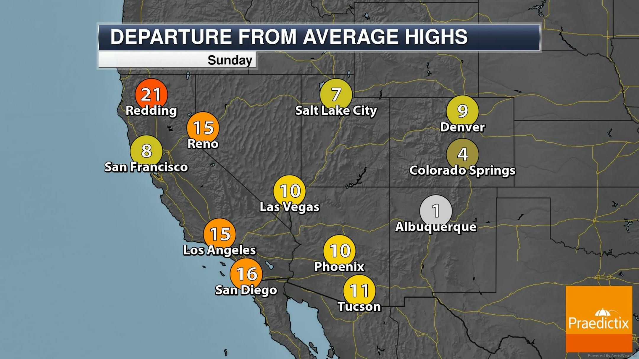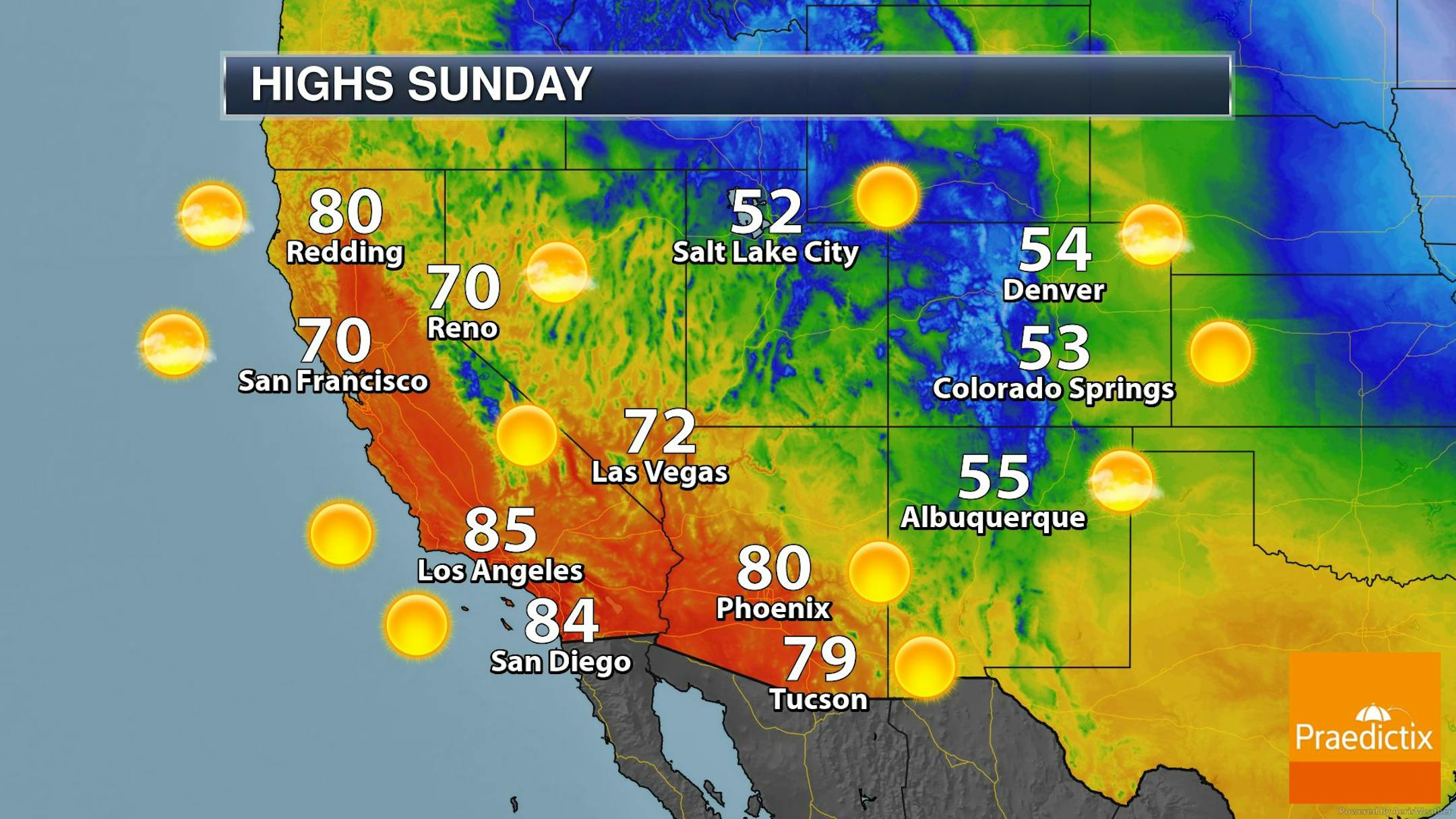 Here's the weather outlook across the Southwest for Sunday, where sunny skies and warm temps will be in place. Temps will be running nearly +10F to +20F above average with record highs possible for some in California. Los Angeles could warm into the mid 80s, which could potentially be the warmest Super Bowl on record.