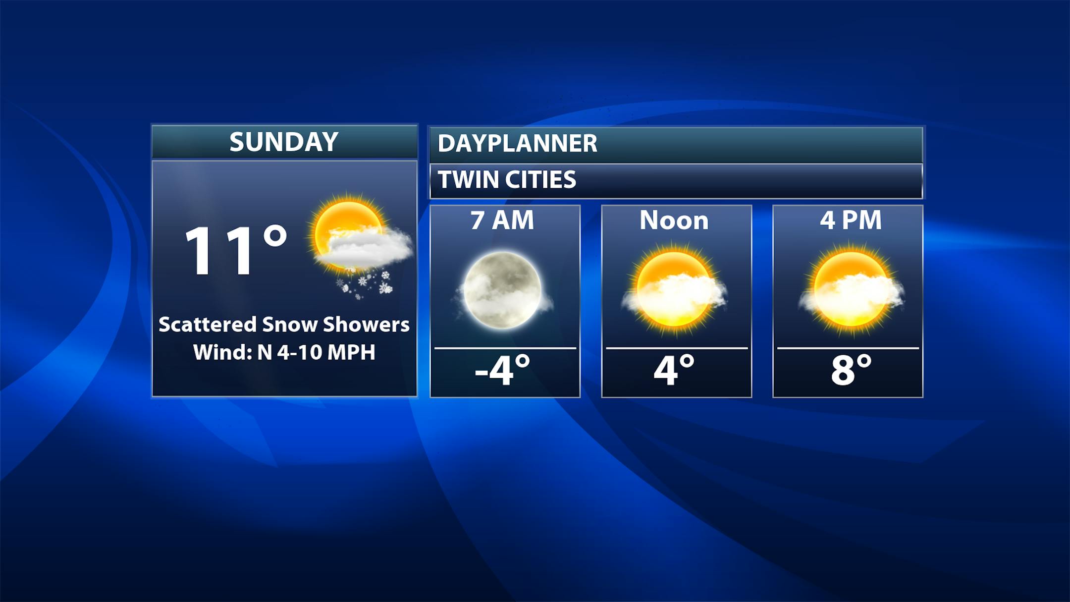 The weather outlook for Minneapolis on Sunday shows icy sunshine in place during the morning hours, but clouds will quickly thicken during the second half of the day with light snow developing after sunset.