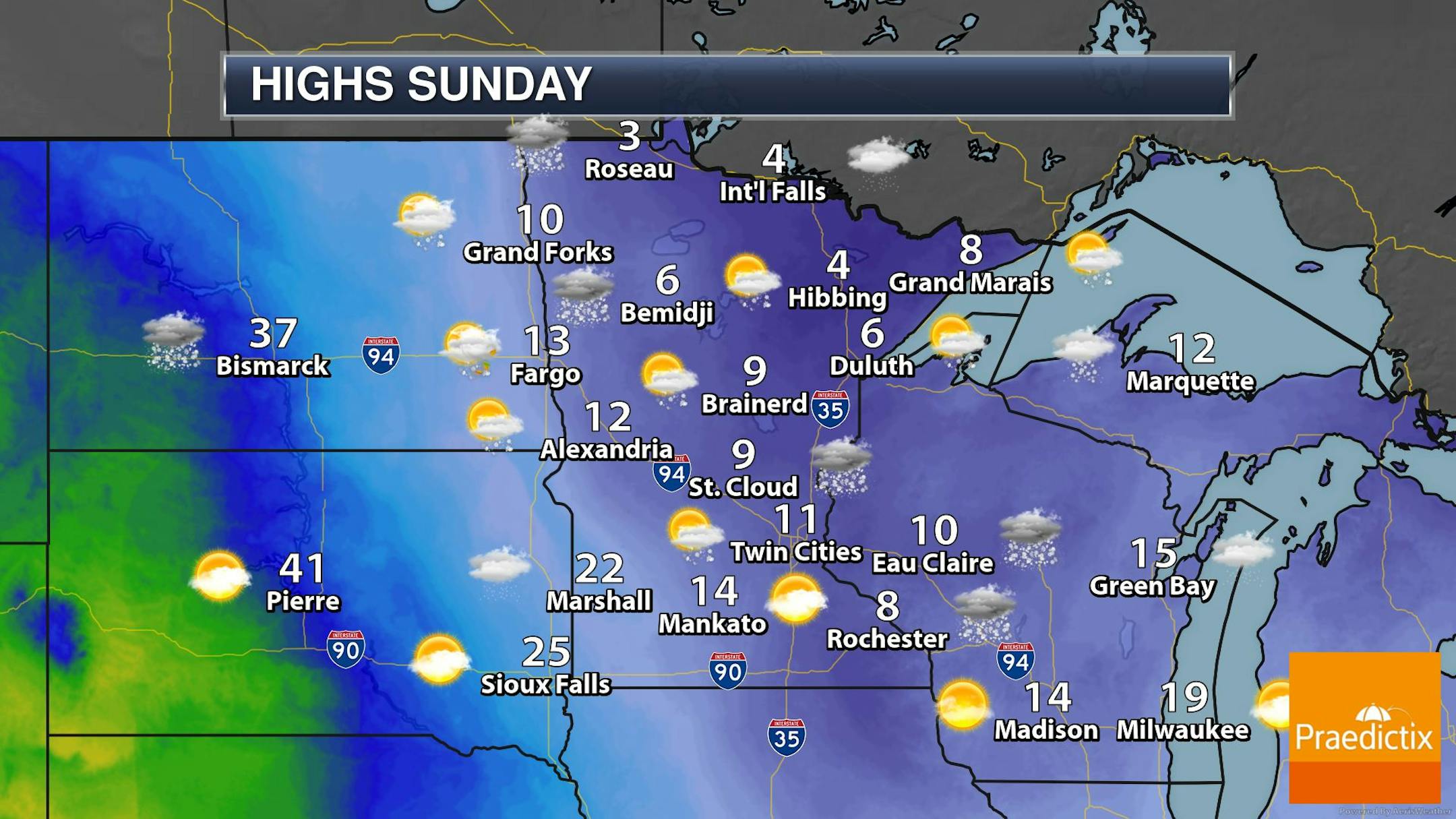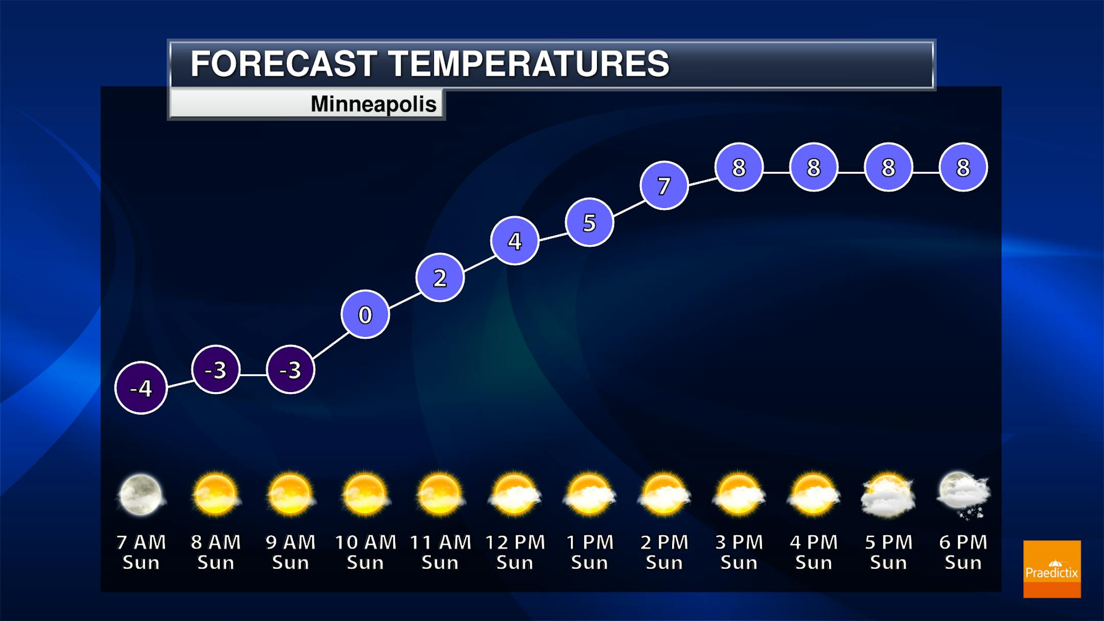 The hourly temps for Minneapolis on Sunday show temps starting in the single digits below zero with highs warming into the single digits above zero. Sunny skies will persist in the morning with clouds thickening through the second half of the day. Light snow will develop after sunset and will continue through the evening hours.