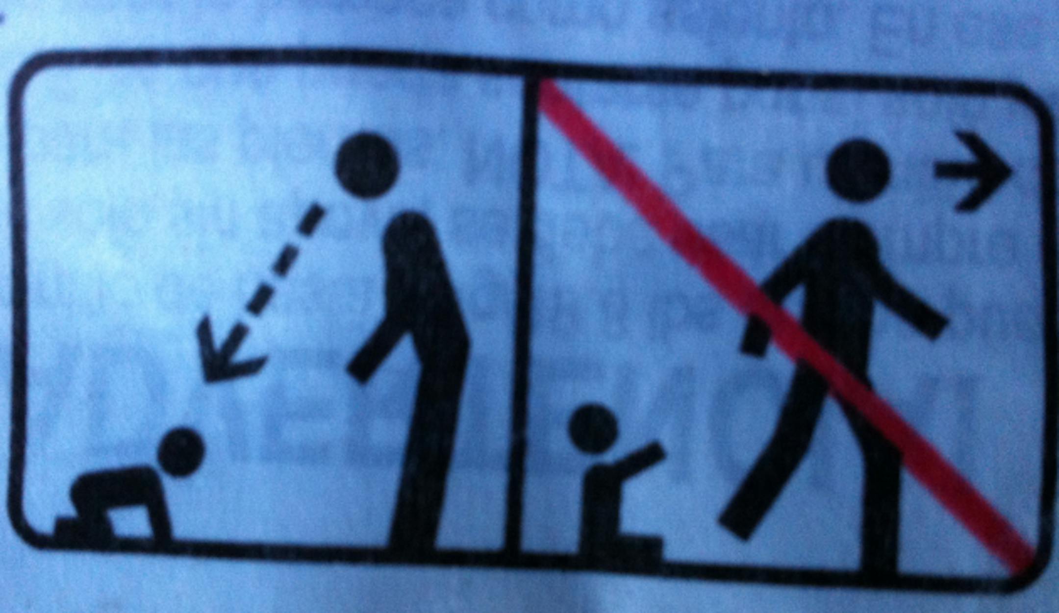 My favorite is the warning on her bouncy chair, a pictograph of what to do (stay with your child while she's in the chair) and what not to do (walk away when your child's calling out to you, as though rudeness itself could be fatal).