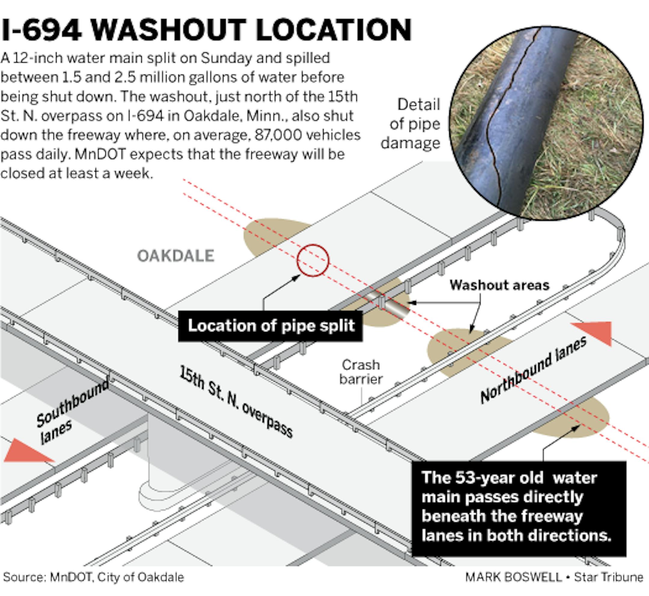 Just north of the 15th street bridge, construction crews will be repairing a section of I-694 between 10th and 34th streets for several days. It was closed because of erosion caused by a busted main pipe. A water main break in Oakdale early Sunday morning caused a large washout under Interstate 694, and motorists will face a major detour . (The Minnesota Star Tribune)