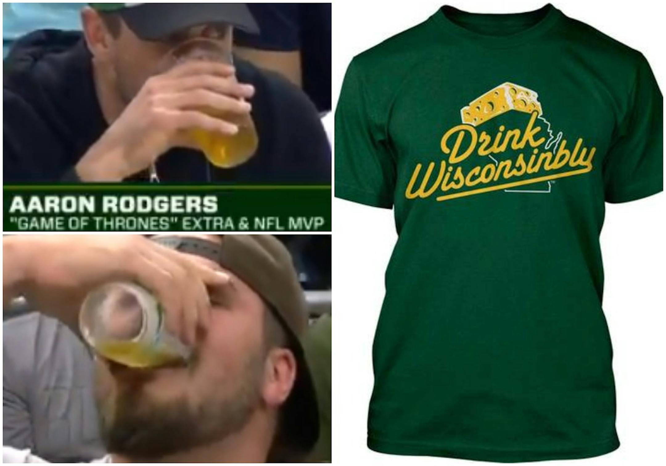 The camera then cuts to Rodgers — bonus points for identifying him as a "Game of Thrones extra and NFL MVP" — who starts with a beer that's basically half-full and can't finish it before setting it down.