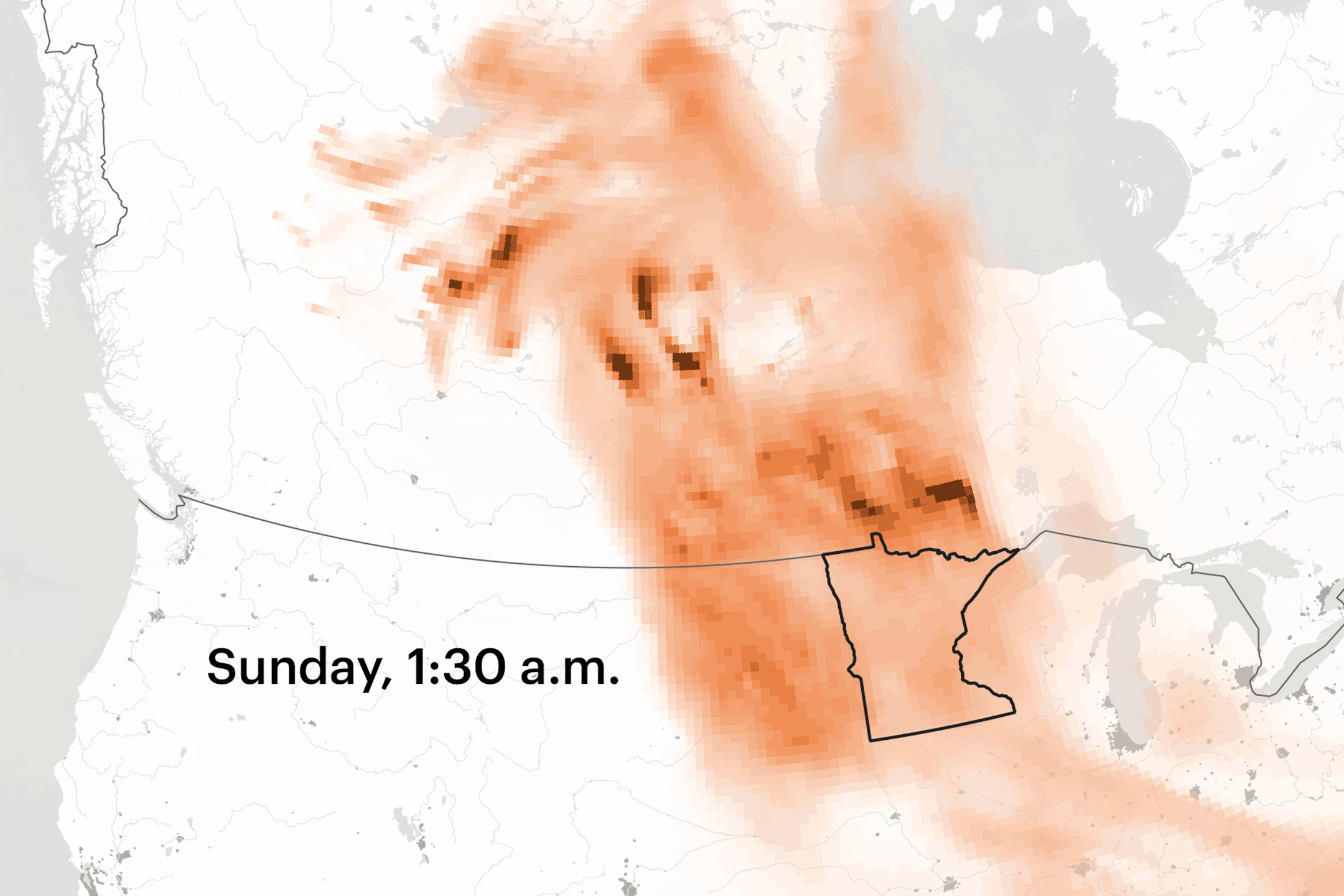 A cold front pushed the smoke southward early Tuesday morning, where it met heavy rainfall from a storm rolling through south-central Minnesota. Heavy concentrations of smoke persisted through the rain, tying the state’s poorest air quality reading on record set in June 2023.
