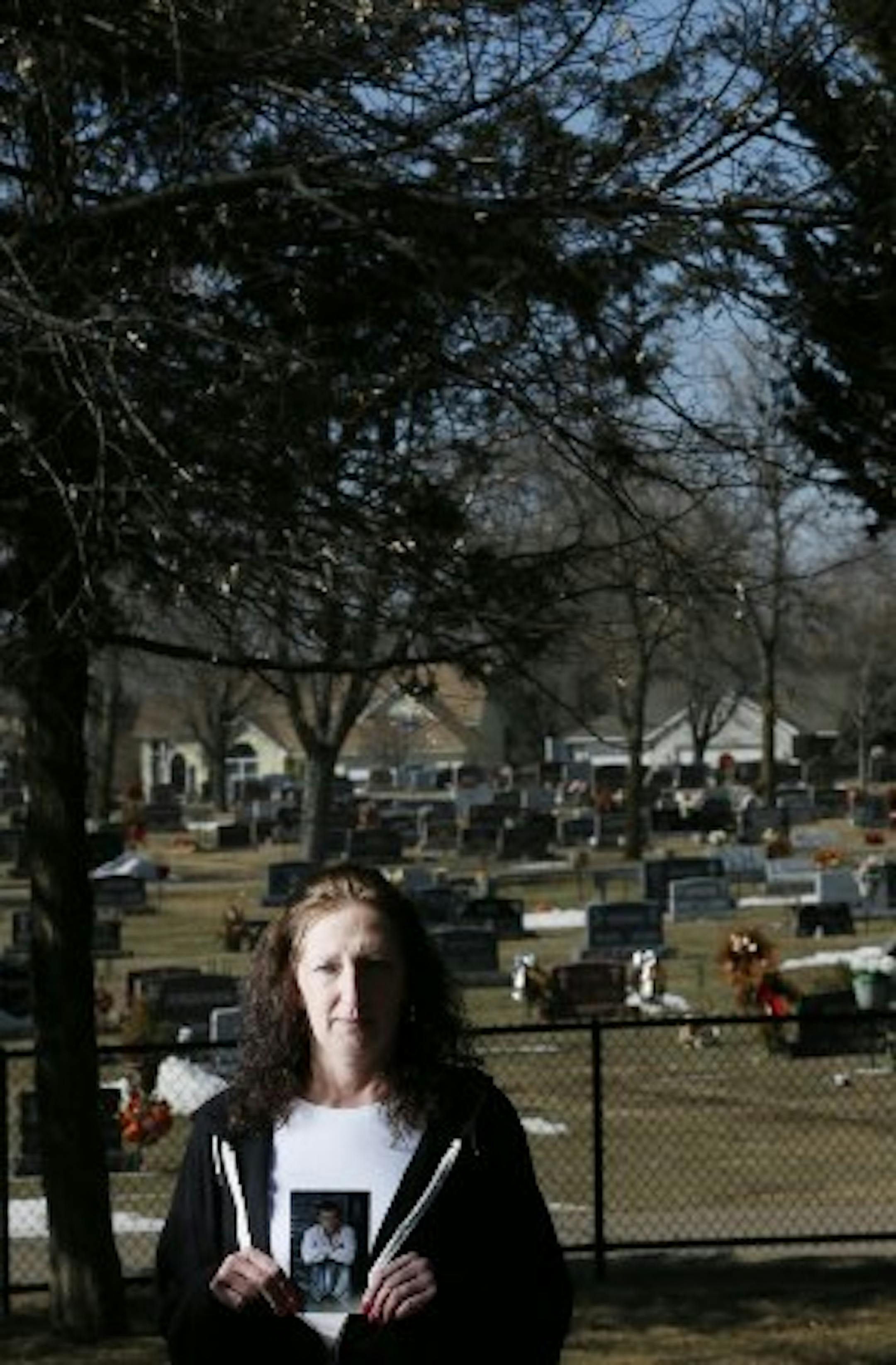 Photo of Tammy Hegi, whose son was shot to death by Hastings police in the cemetery behind her. (Jerry Holt, Star Tribune)