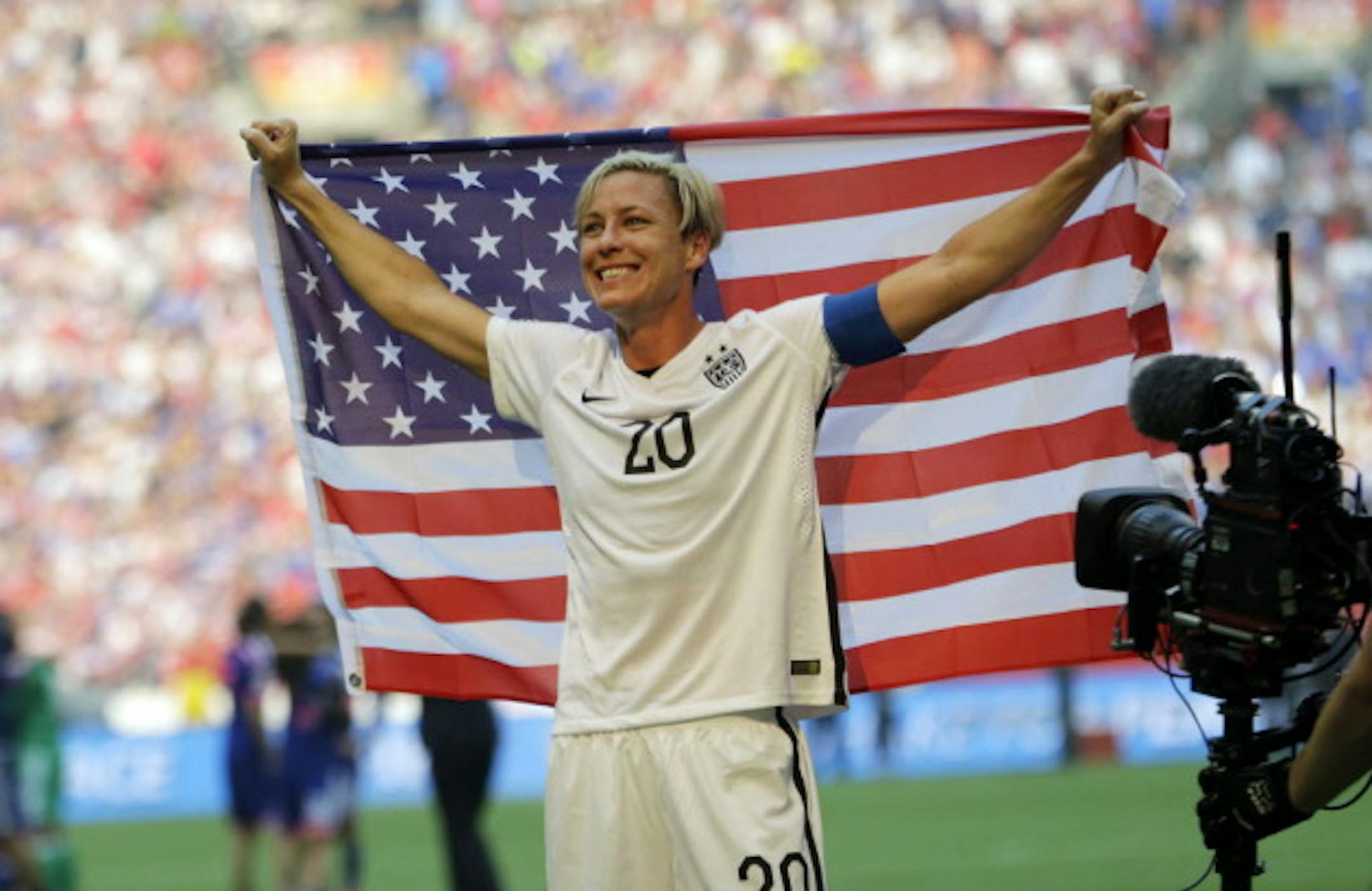 Abby Wambach holds up US flag after United States defeated Japan in FIFA World Cup./ photo by AP