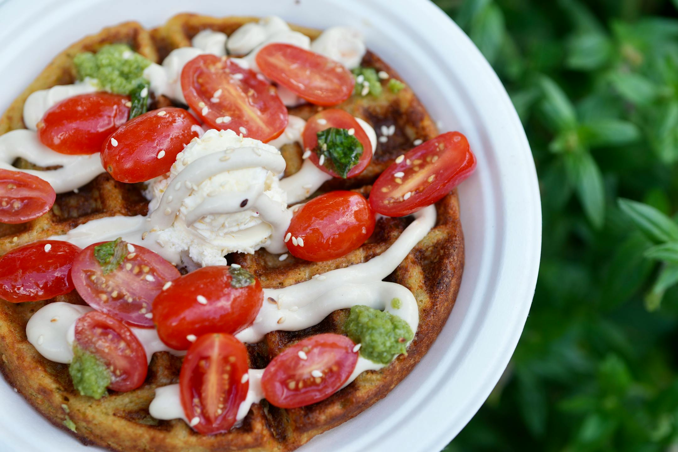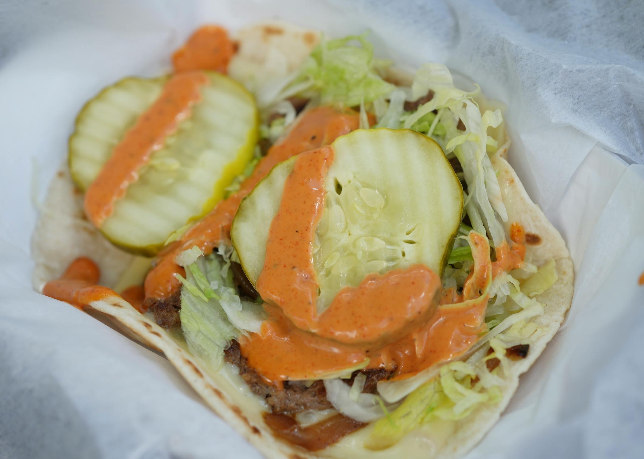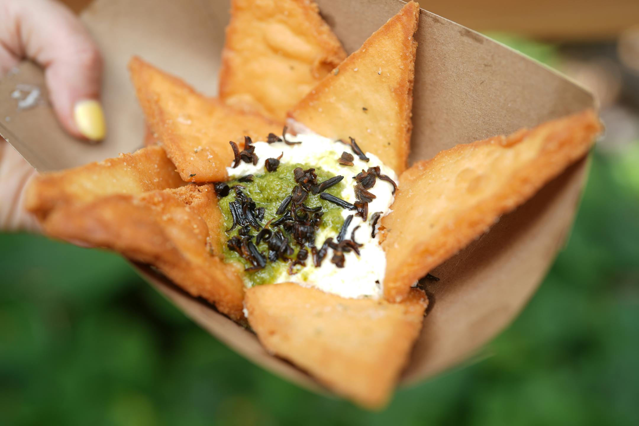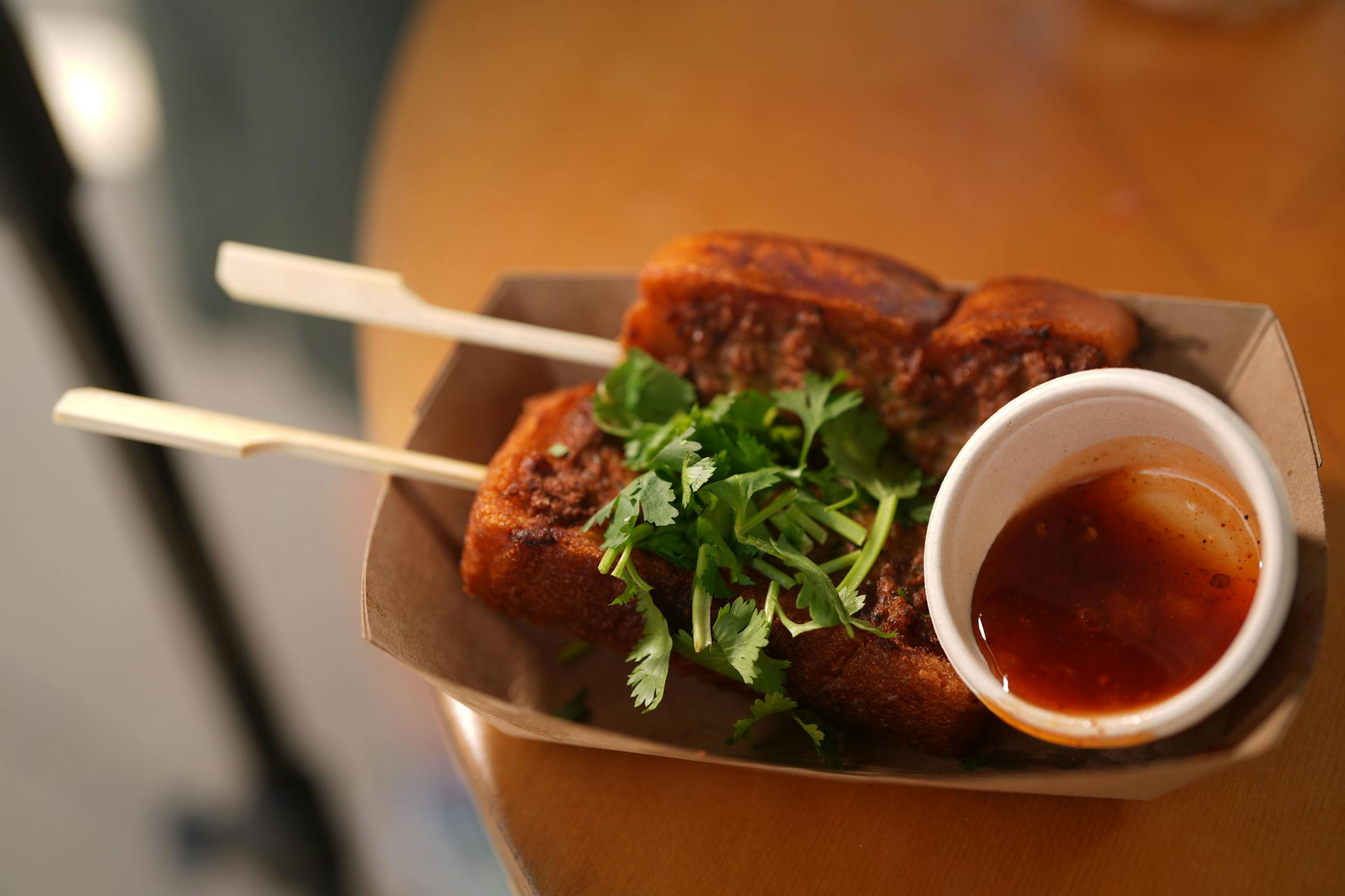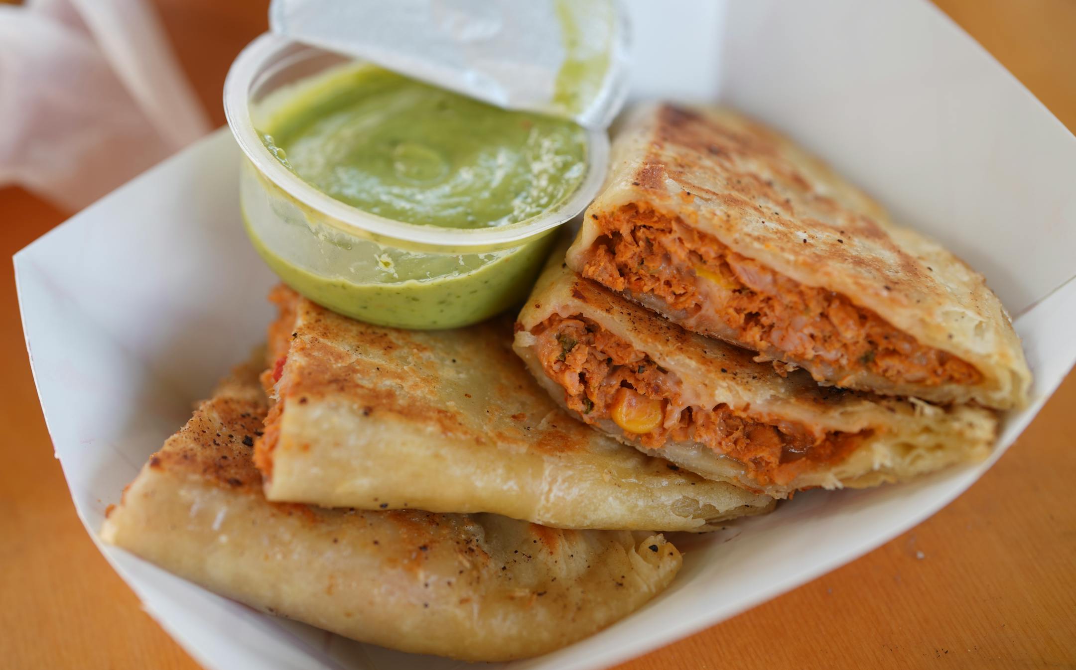 A crispy little master class in building great flavor and texture with a vegan dish. Deftly seasoned with a mix of creamy and chunky beans, the filling and crust are only enhanced by the cilantro and jalapeño basbaas sauce or the red chili-spiked mayo (that was a little less spicy). We loved every bit about these gluten-free bites, including the adorable packaging in which they’re served.