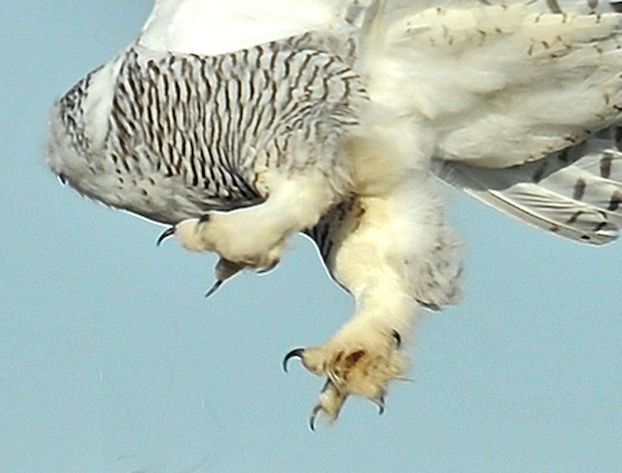 One of the Snowy Owl photos I took in South Dakota a couple of weeks ago shows the bird as it launched off its perch. The legs are extended with the push, and the talons on its feet are clearly visible. The second photo shows the feet of a Great Horned Owl I found several years ago dead on a trail in the woods near Lutsen. (It had been shot-gunned in the back.)