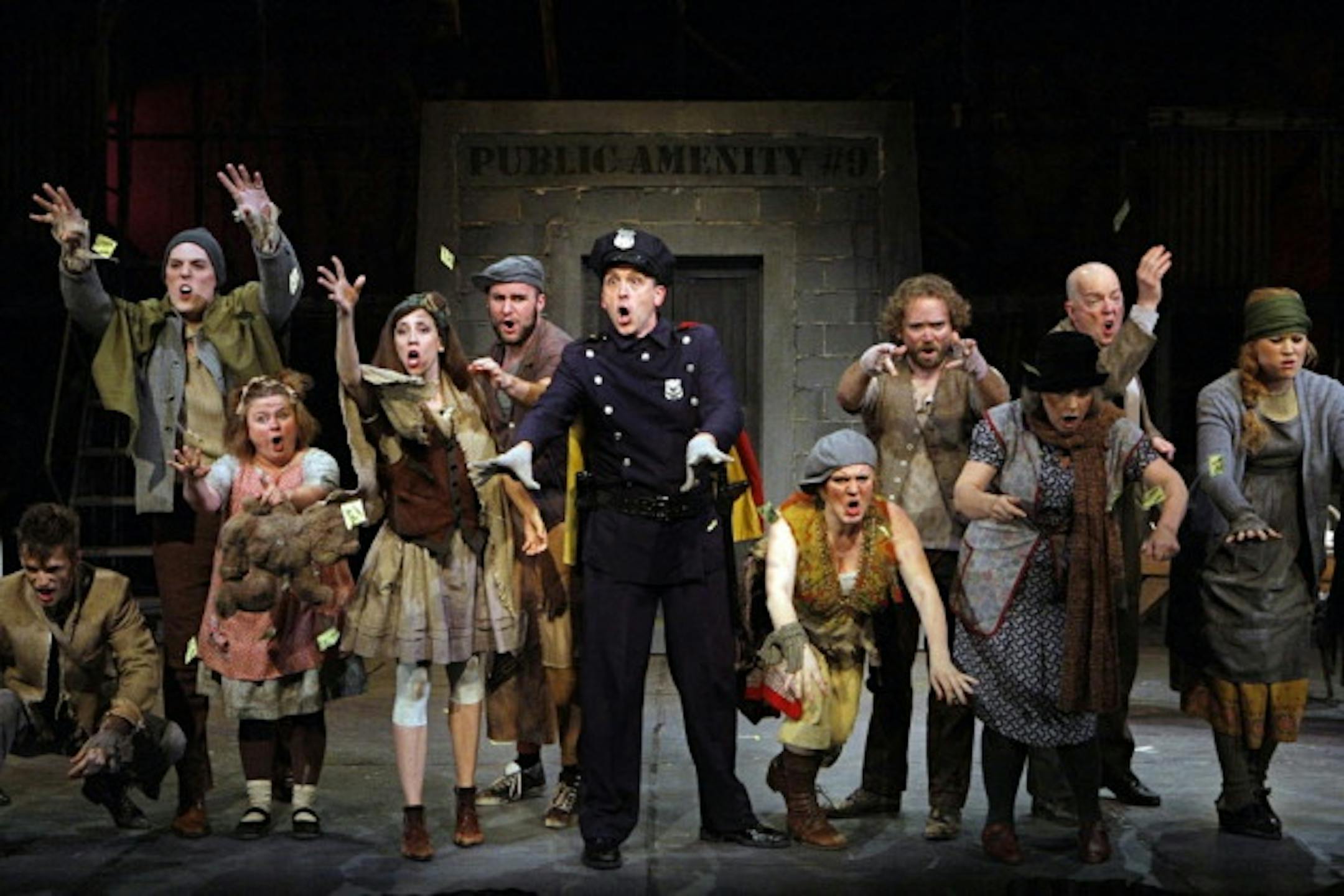 Bradley Greenwald, center, leads the cast of "Urinetown" at the Jungle. Photo/Michal Daniel. The frightful weather this past weekend brought down the Jungle Theater's high-flying production of "Urinetown." Power went out Friday and three performances (Friday, Saturday and Sunday afternoon) were canceled. The show went on Sunday night and is on track for Tuesday evening.