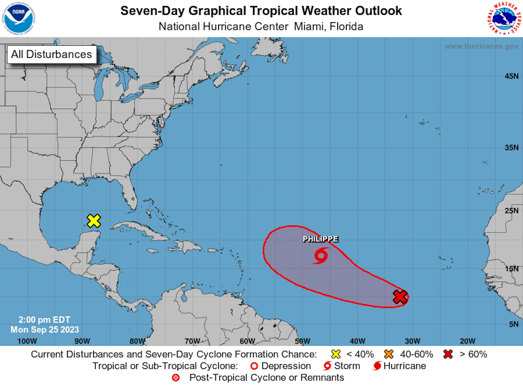 According to NOAA's NHC, Tropical Storm Philippe was active in the central Atlantic, which is the 12th named storm of the 2023 season. There is another wave of energy southeast of Philippe that has a high likelihood of formation over the next few days. There is also another tropical wave north of the Yucatan that also has a chance of tropical formation. Stay tuned...