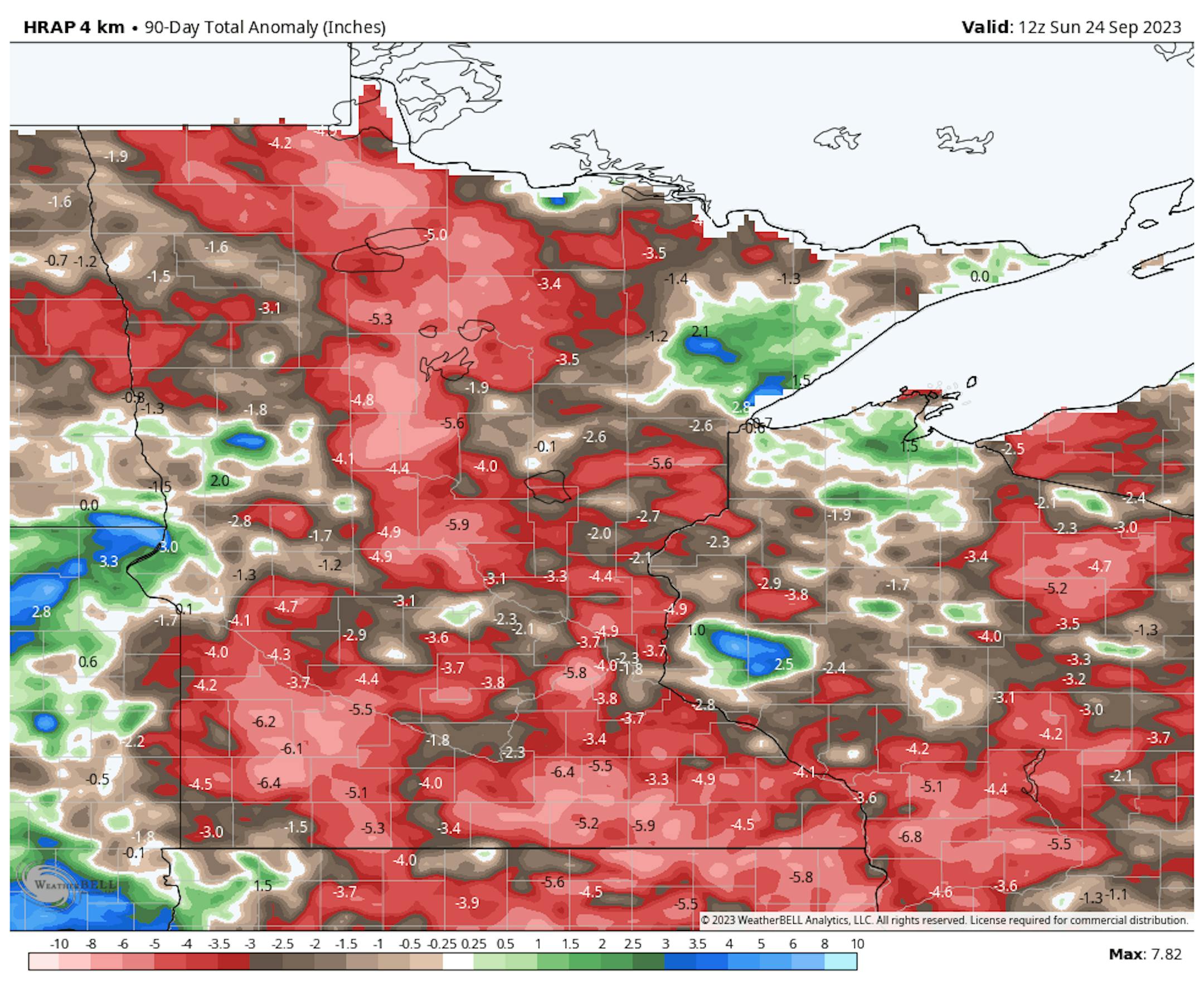 On average, the wettest time of the year is in the summer, with the months of June, July and August seeing nearly 13" of rain at the MSP Airport. If we take a look at the 90 day precipitation anomaly, which dates back to late June, some locations are nearly -3.00" to nearly -7.00" below average (in red/pink). Note that some locations across southeastern Minnesota are nearly -8.00" to -10.00" below average.