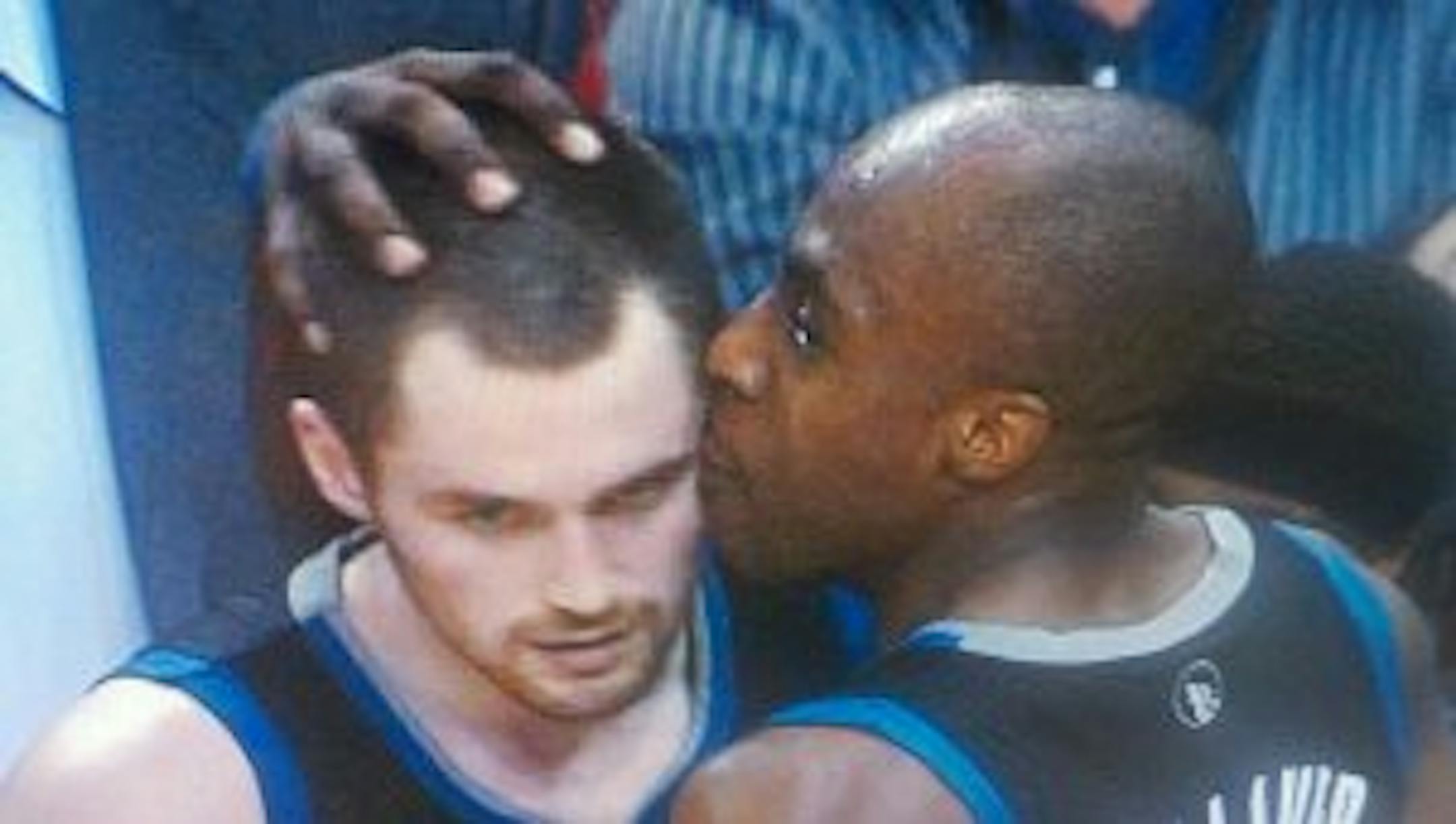 And then, of course, there was Kevin Love -- notching not only his team-record 38th consecutive double-double (also the longest streak in the NBA in forever), but punctuating the night with a pair of HUGE three-pointers. After the second one, which gave the Wolves a five-point lead in the final minute, he got a little peck on the side of the head from Tolliver (still shot grabbed from FSN's broadcast). Love for Love. Isn't that nice?