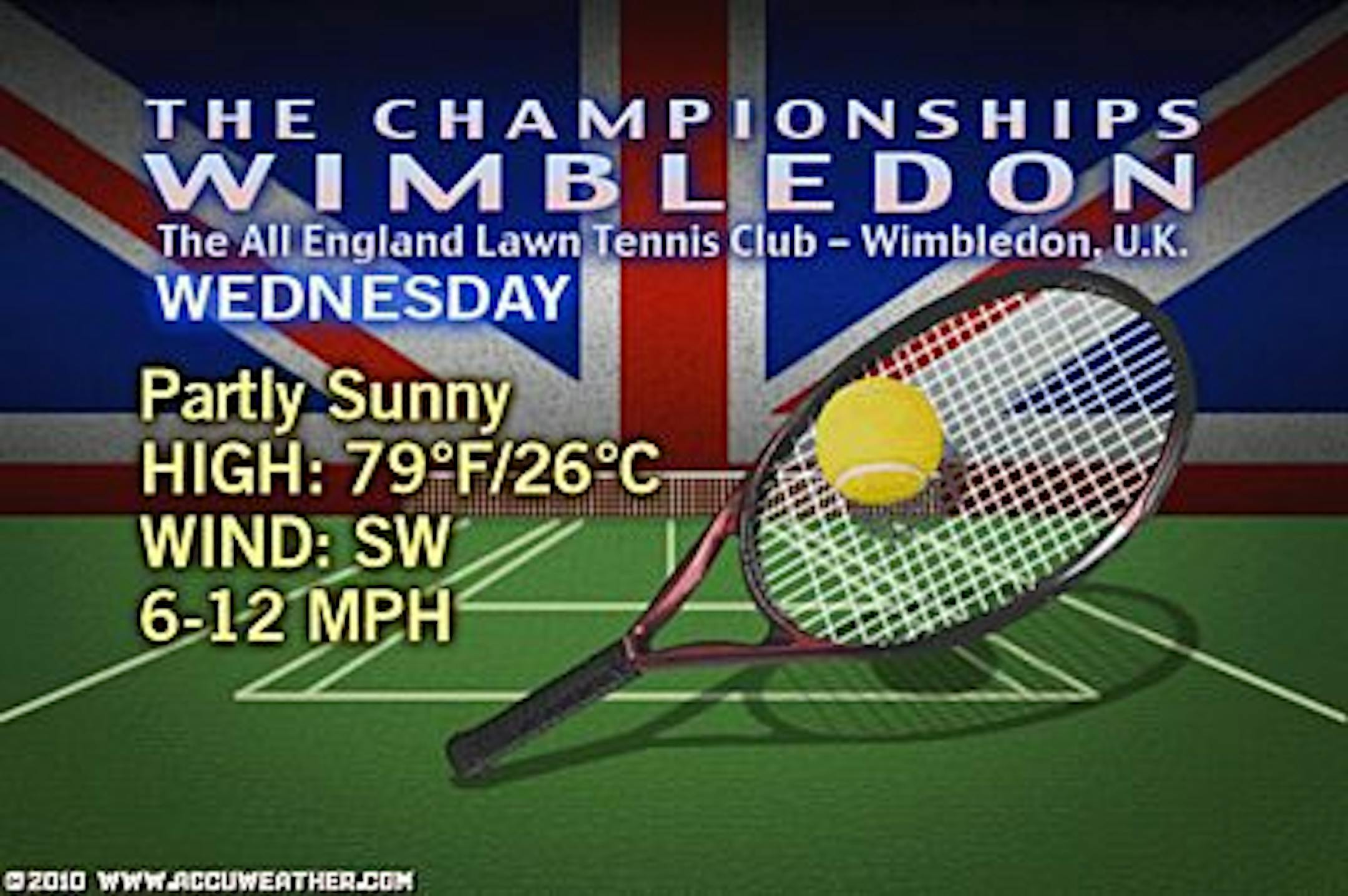 Weather for Wednesday's Wimbledon Championship play at the All England Lawn Tennis Club will feature partly sunny skies, temperatures in the upper 70s F (20s C) and light winds gusting 6-12 mph.