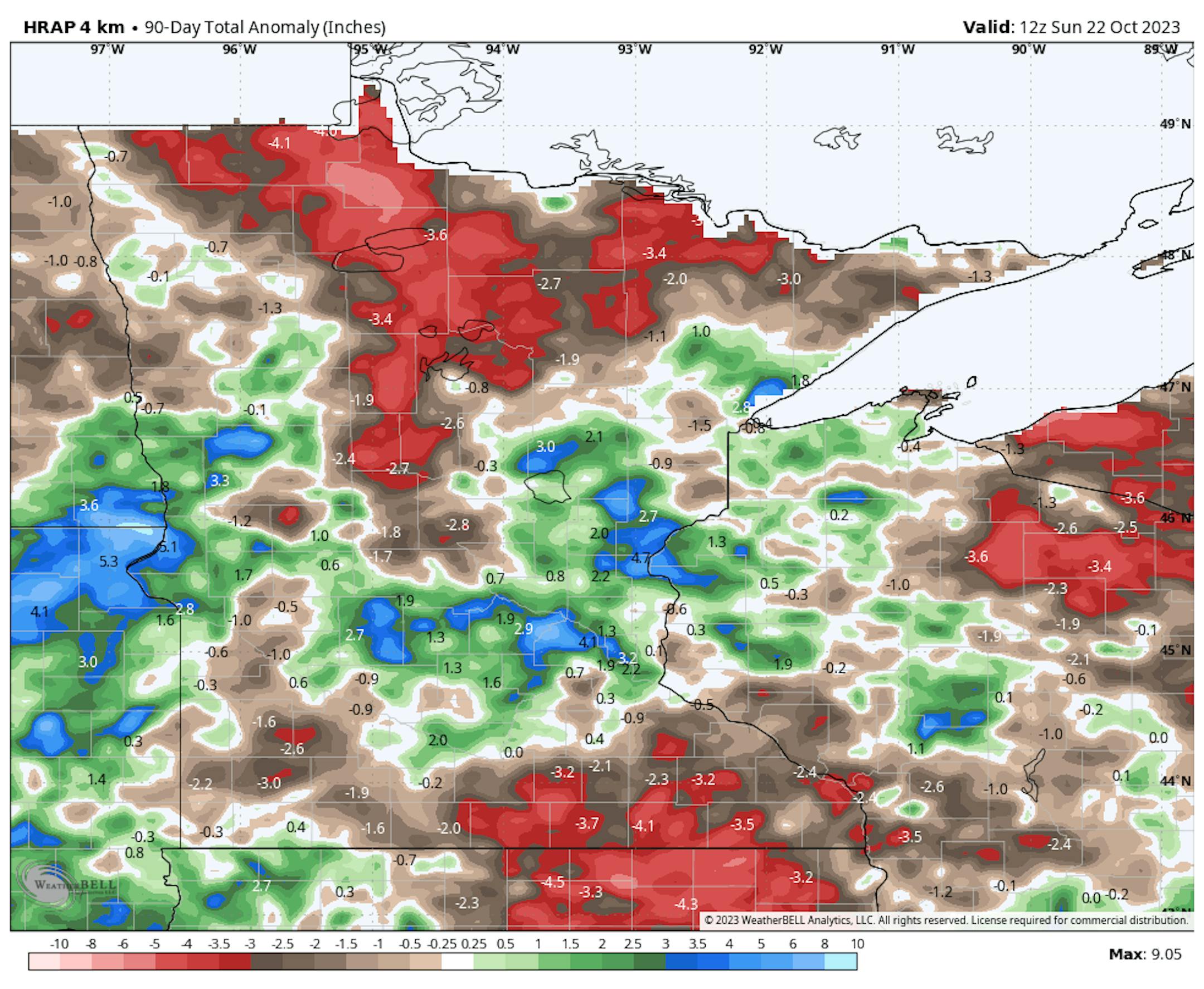Thanks to some recent heavy rains parts of the state are now in a surplus over the last 90 days. Some of the biggest surpluses are showing up in blue in pockets across parts of central Minnesota, including the Twin Cities and into western Wisconsin. It has been a very soggy last 4 weeks.