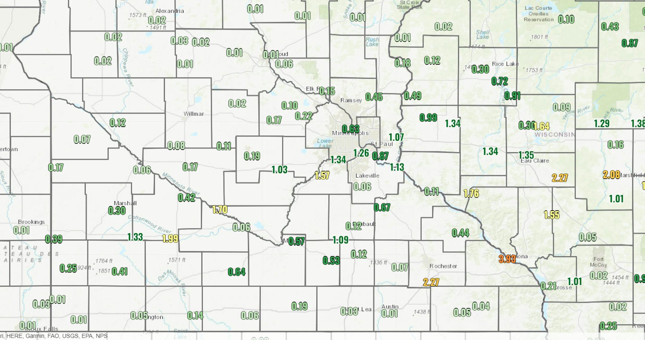 Tuesday also saw heavy rainfall across parts of southern Minnesota, where some 1" plus tallies came in. This won't end the drought across the area, but it will certainly help continue to dent the drought.