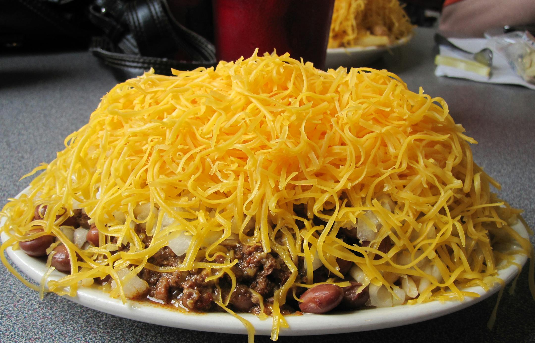 The 5-Way ($5.89) — chili, onions and beans on a mountain of spaghetti topped with a mop of shredded cheddar — initially seemed watery and bland. But the sweet cinnamon taste grew on me.