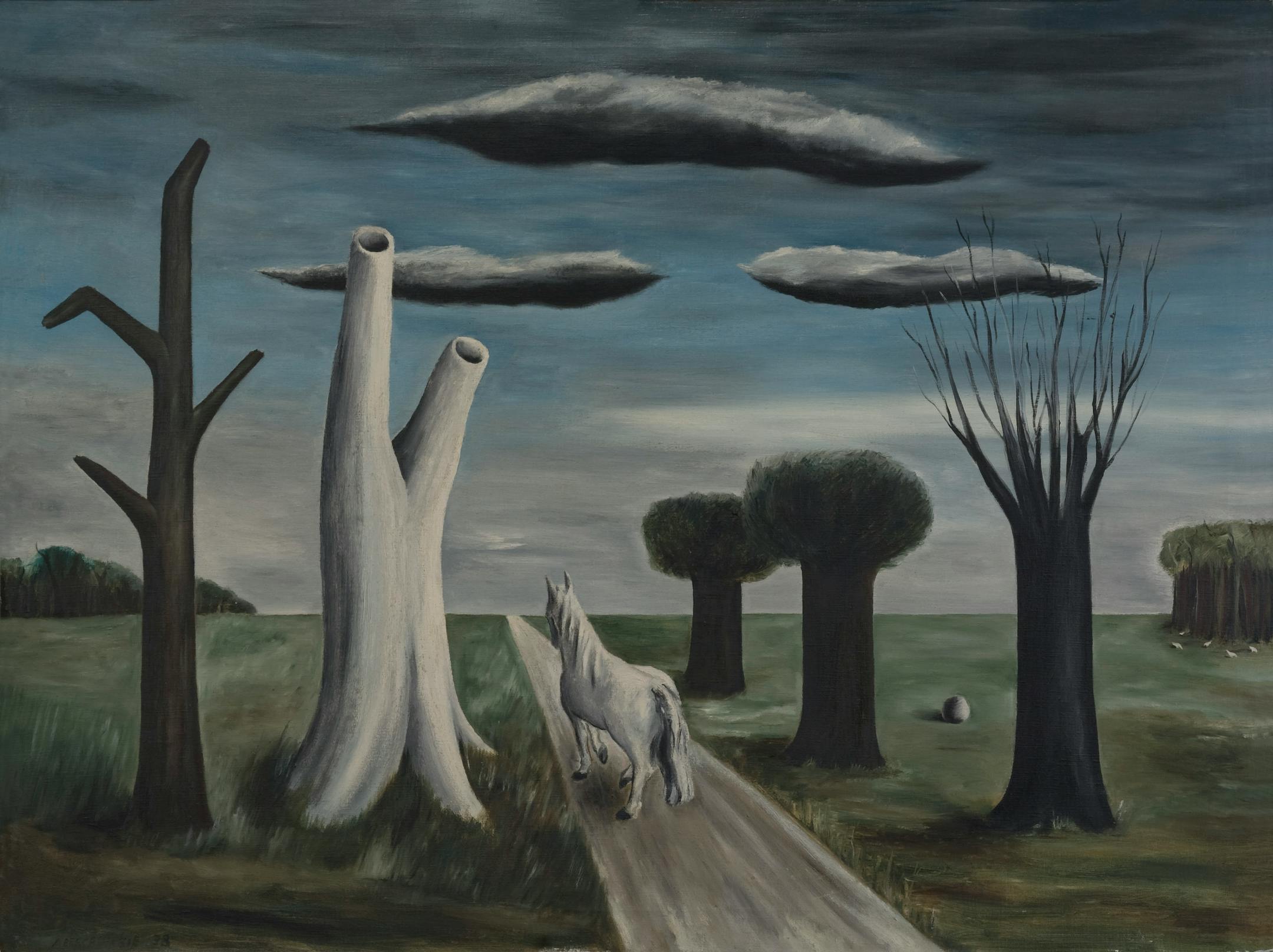The surrealism is over-the-top in Robert Van Rosen's stick man in a crazed hospital ward, and derivative in Shirley Julian's Dali-esque lithographs. But there's a bright whimsy to Julia Thecla's gouache of two ballerinas on tiptoe upon mountain peaks, their upstretched arms encircling the clouds. And Gertrude Abercrombie's white objects -- whether a horse or a hat plume -- glow with great effect in her dim, mysterious landscapes.