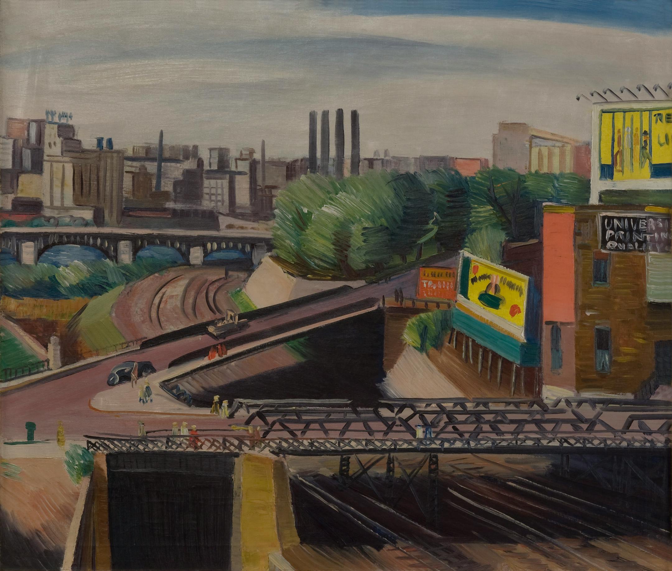 In the industry section, Erle Loran's breezy-clean flour mills would seem more at home in California, where he later went to build his career. Thomas Hart Benton influenced Mac Le Sueur's swirling vision of an abandoned mine flown over by crows and Lucia Wiley's dynamic oil-on-board images of the logging industry. Don't overlook Wiley's small gem, a colorfully stylized gouache impression of Ojibwe Indians gathering wild rice.