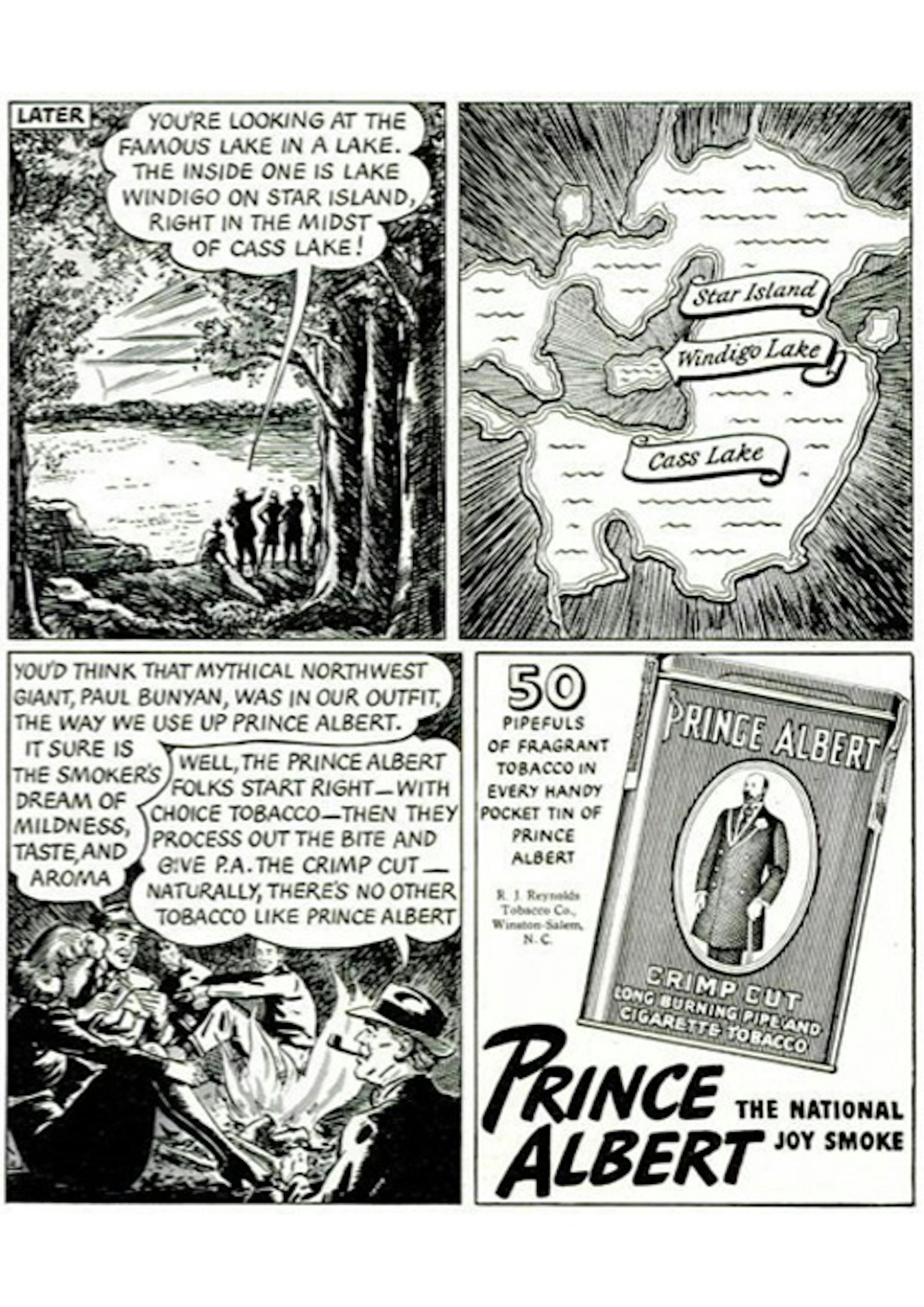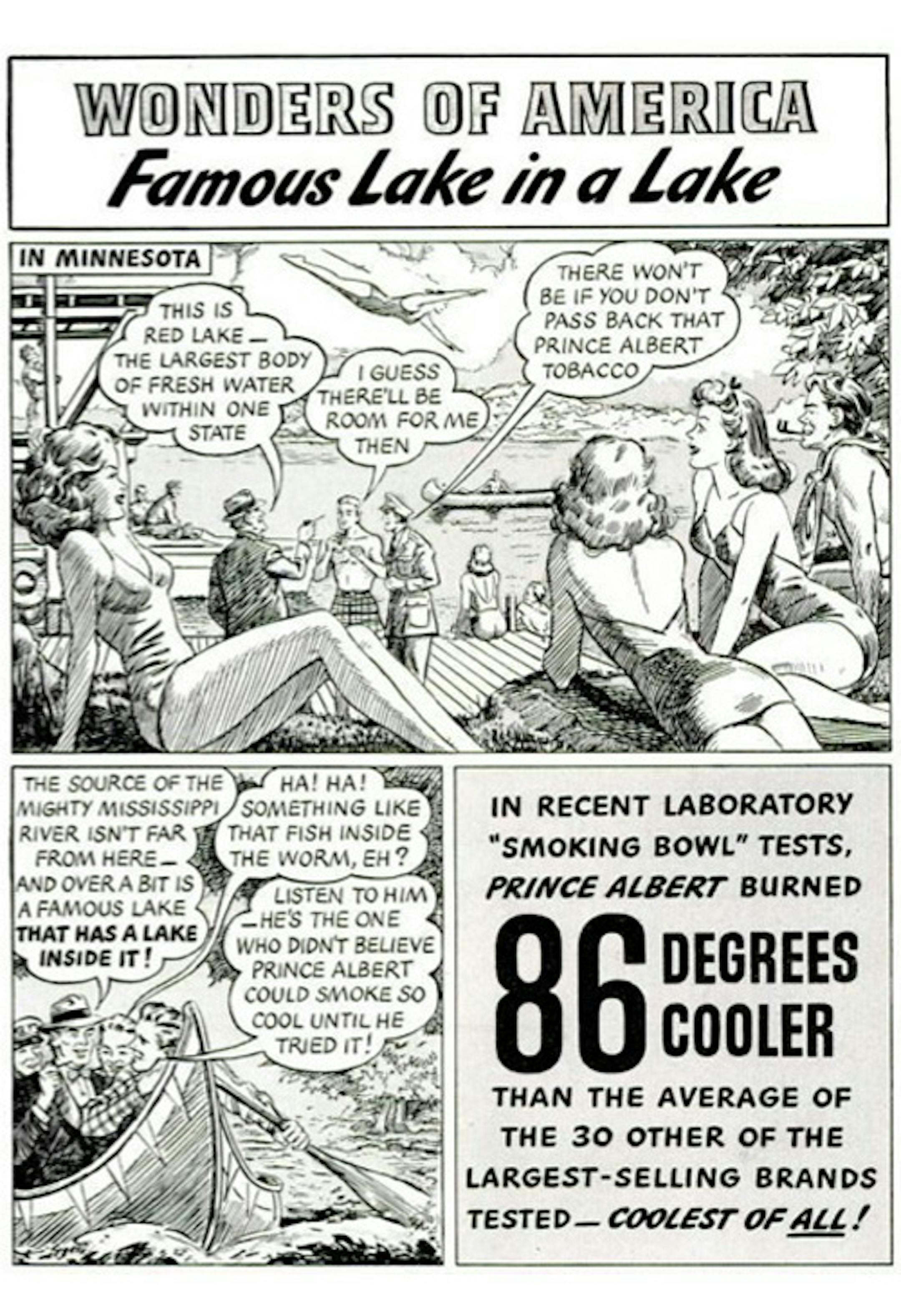 Prince Albert's 1940s ad campaign went to Minnesota, for some reason. It's notable for the first panel, which presents what people apparently thought the state was like. For heaven's sake, did that diver have FAA clearance?
