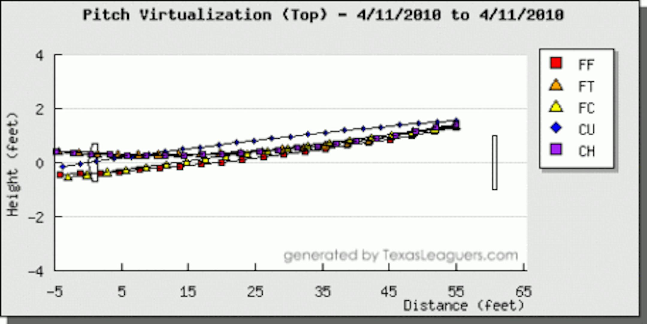 As you can deduce from the graph above (which is a shot of his average pitch locations) of last night's game, Blackburn worked the Yankee lineup consistently at or just off of the corners of the strike zone. Combined with changing speeds regularly, this kept a strong lineup off-balanced for the duration of the game. Compare that graph to the following graph depicting Blackburn's locations against the Chicago White Sox on April 11th: