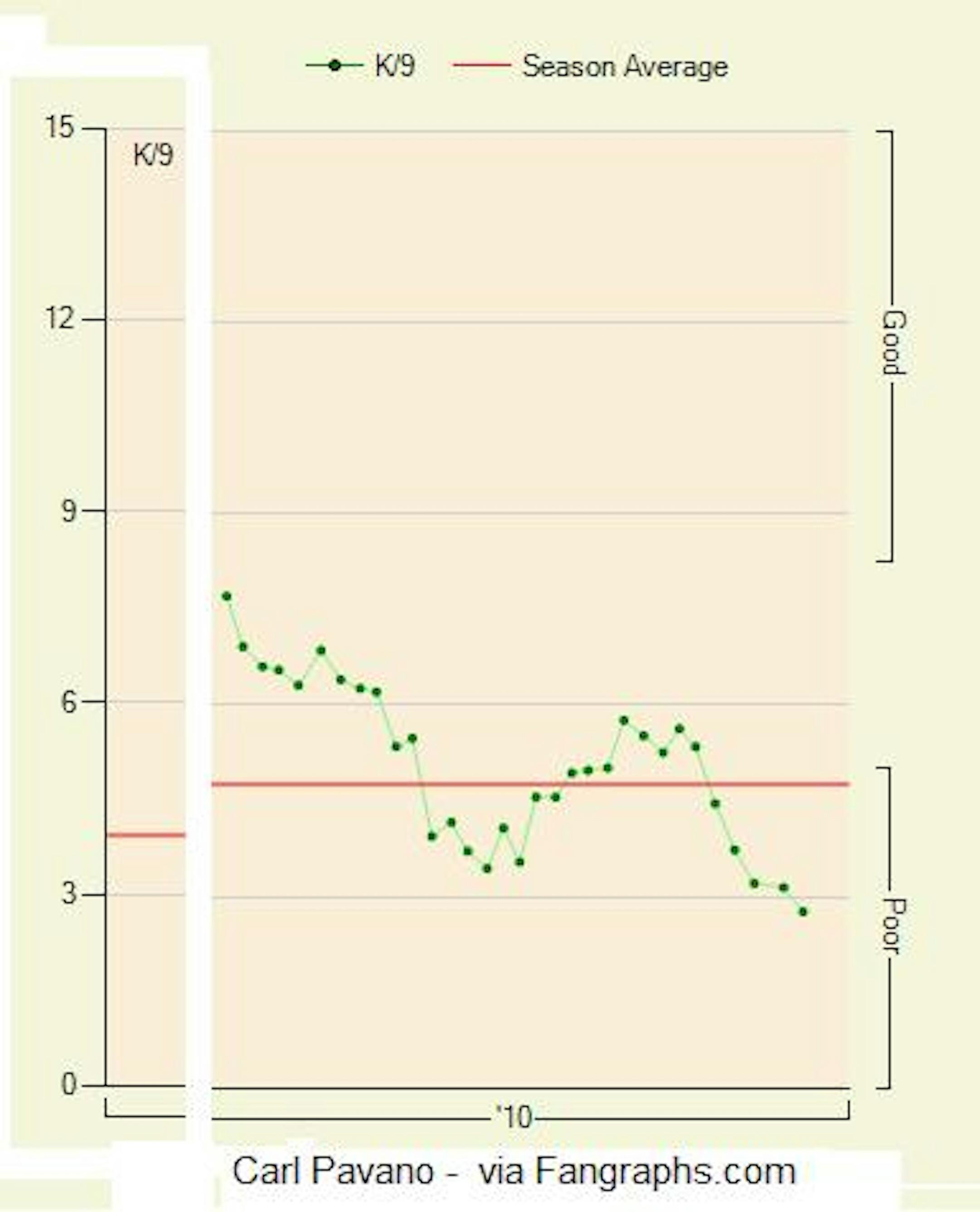 Highest Out-of-Zone Swing% 2009-2010 Carl Pavano 34.1% Shaun Marcum 32.9% Roy Halladay 32.5% Dan Haren 32.1% Francisco Liriano 32.1% (via Fangraphs.com) Unlike some of the other names on that list, Pavano rarely induces the same amount of missed bats, instead relying on generating weaker contact then putting himself at the whim of the defense behind him. It is this tactic which makes some analysts question where his output will be in 2011. In 2010, Pavano posted his lowest career batting average on balls in play (BABIP). As a pitcher that allows a high amount of contact and has an unusually suppressed BABIP not typical of his recent track record, the laws of regression suggest that he will see his BABIP return towards the league-average or his career-norm in the ensuing year. If you adhere to this reasoning, it would imply that Pavano is likely headed to a season filled with more hits than his last. Then again, because he was a prolific ground ball pitcher last year, Pavano's BABIP (and ultimately his success) will likely be tied to the performance of his infielders. Even though the Twins have dismantled perhaps one of the league's best defensive middle infields, the replacements in Alexi Casilla and Tsuyoshi Nishioka are projected to be a faster combination than their predecessor, leading one to speculate that they might be able to cut down more ground balls for Pavano than last year. Similarly, the configuration of the home stadium also provides him some insulation. Although Pavano surrendered more hits at home versus on the road in 2010, he gave up fewer detrimental hits. When Target Field played big in 2010, pitchers could throw to contact could and get away with hitting a sizable portion of the plate middle-away without too much backlash as fly balls would simply die in the power alleys. Specifically for Pavano he allowed far fewer homers at Target Field (0.74 HR/9) than he did on the road (1.16 HR/9). While most of the aforementioned indicators are favorable, there are also some signs that Pavano may have hit the wall in late 2010 or worse, have the makings of a potential injury. In early August, Joe Christensen reported that the coaching staff said Pavano had a tired arm. Not long after that, Pavano, who has had a reoccurring sore neck throughout his career, had it flare up but decided to pitch through it. According to LaVelle Neal, this soreness originated in his neck on the right side and extended towards his shoulder area of his throwing arm. Despite downplaying the significance of this discomfort, his results from August on were brutal. After allowing 131 hits in his first 148.2 innings, he finished the year allowing 96 hits in 72.1 innings including seven home runs post-August. In addition to that, Pavano's strikeout rate fell off the table:
