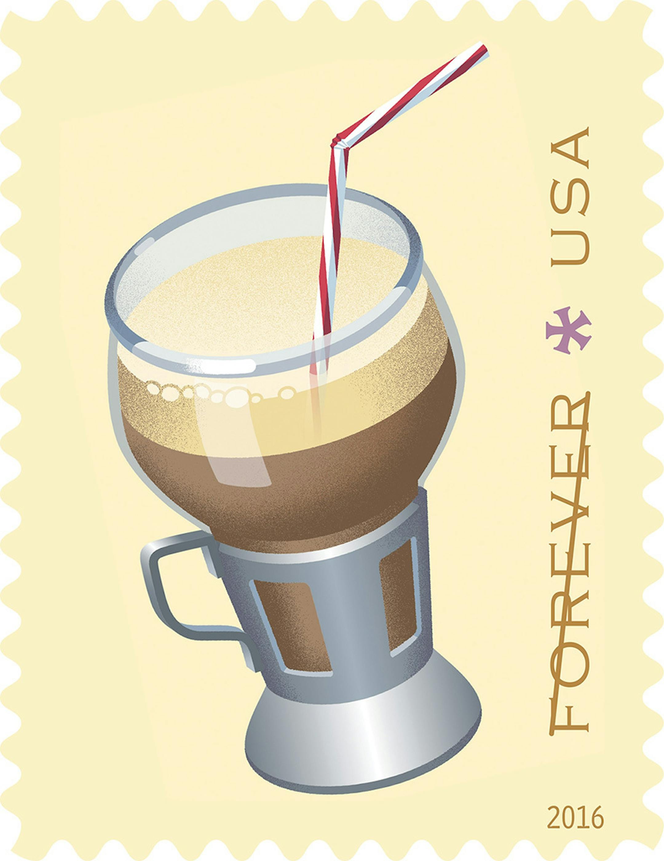 This year, the U.S. Postal Service is celebrating soda fountain favorites, with stamps depicting a double-scoop ice cream cone, an egg cream, a banana split, a root beer float, and a hot fudge sundae. The illustrations, by artist Nancy Stahl of New York City, have geometric silver-toned patterns in the selvage to evoke the chrome trim of a classic soda fountain. It's an homage to the sweet history of mineral water, long touted as having curative properties.