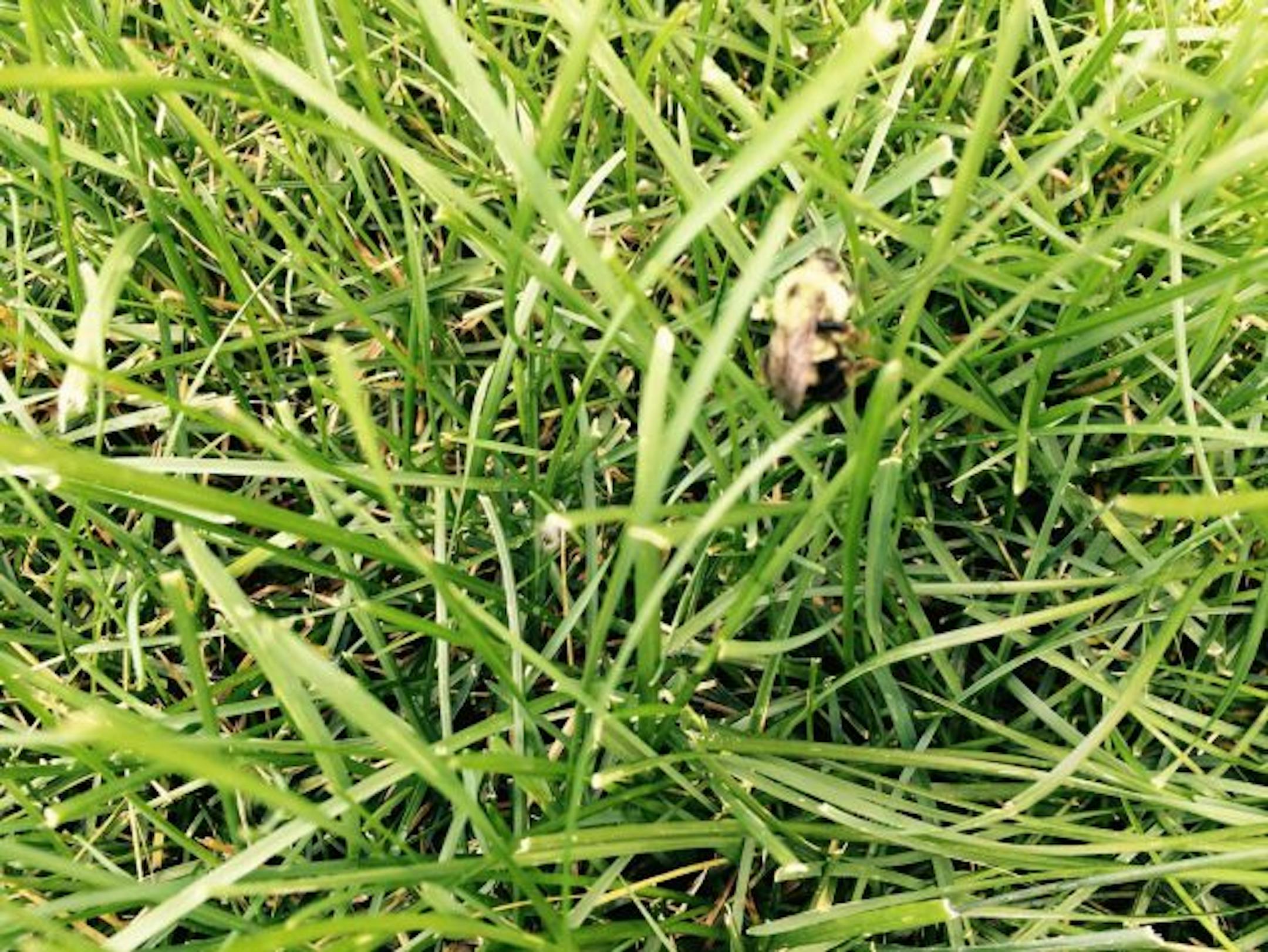 It was a bee, a big fuzzy one, stumbling around in the grass next to the plot I was weeding.