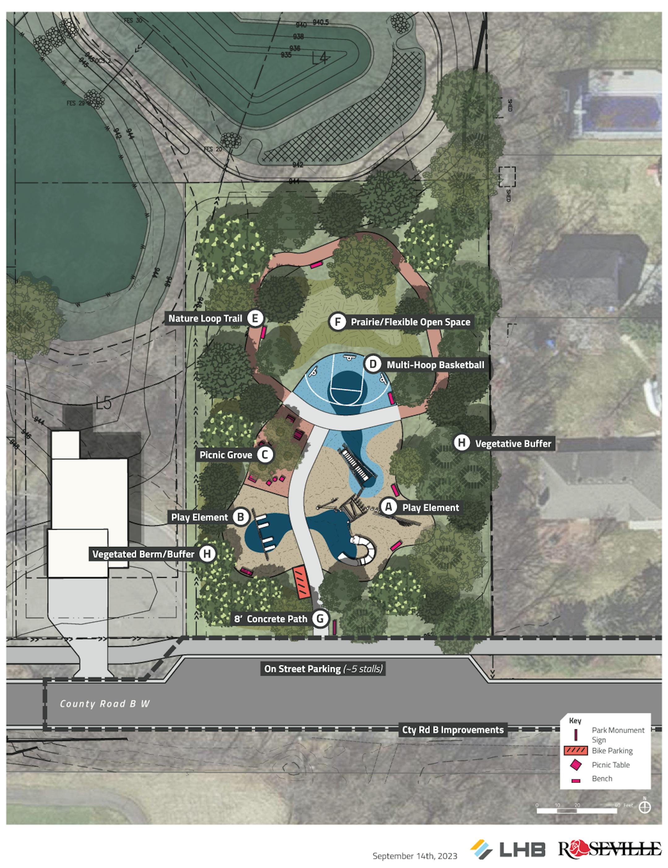 The park will be located at 2381 County Road B, across the street from Midland Hills Golf Course. Approved last fall, the master plan for the park includes a playground, basketball facilities and a picnic grove. The natural amenities include a woodland and prairie plants.