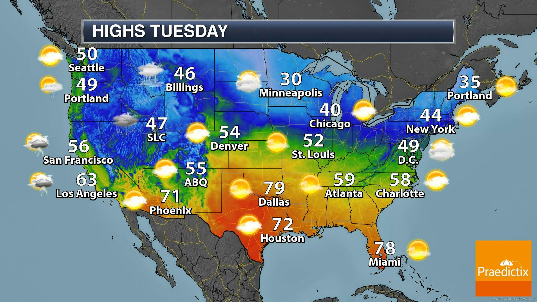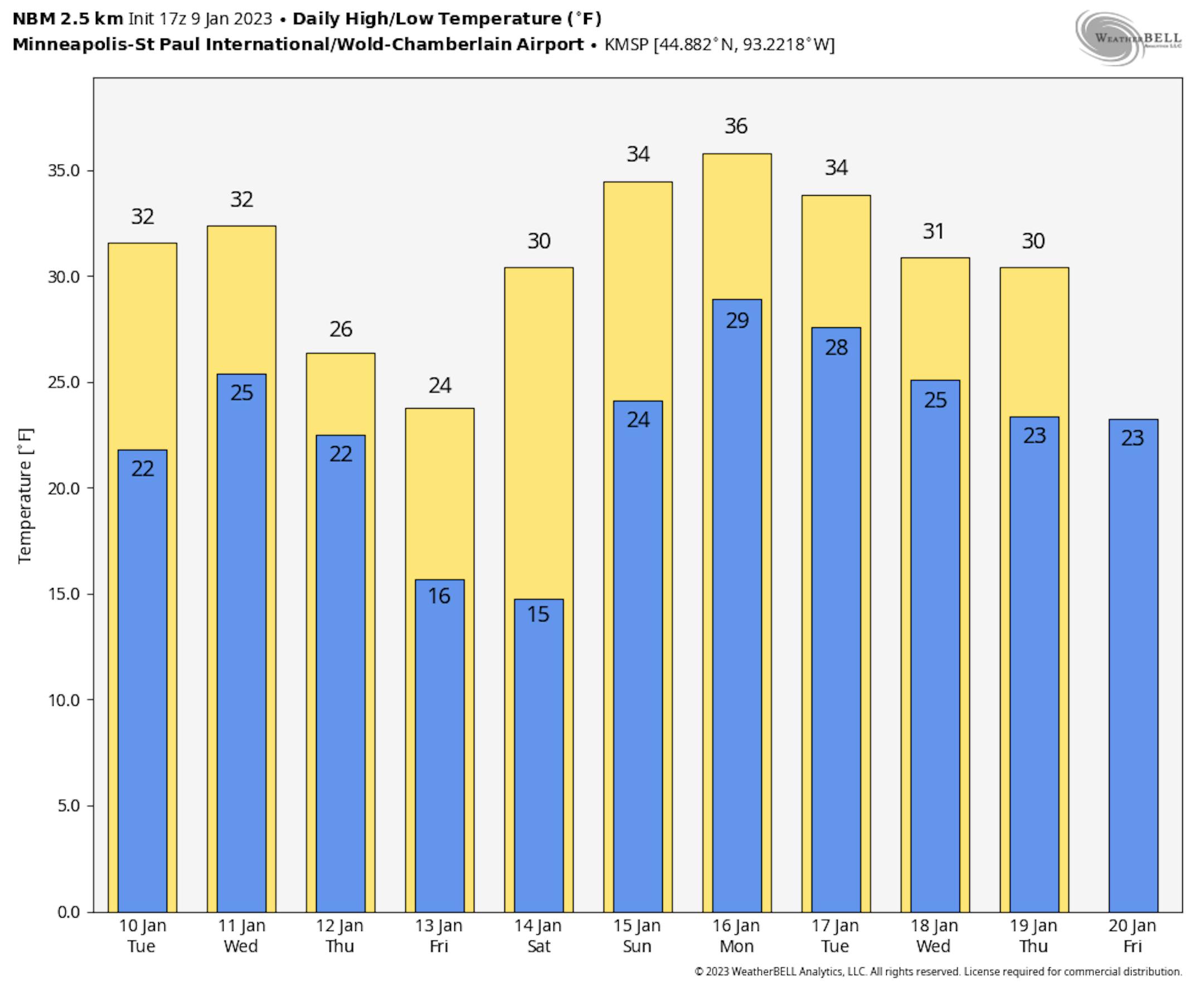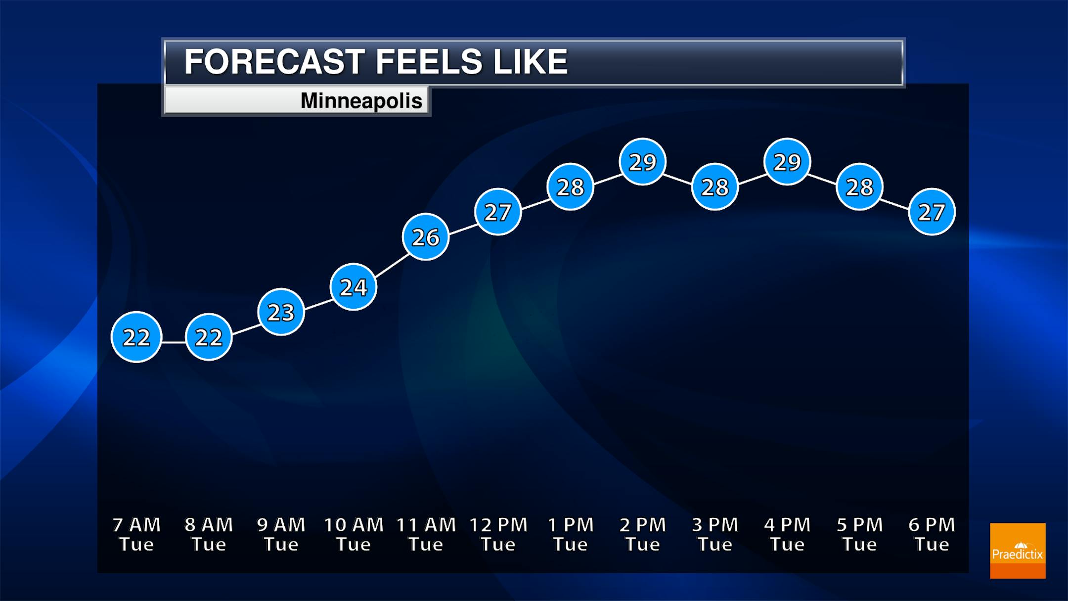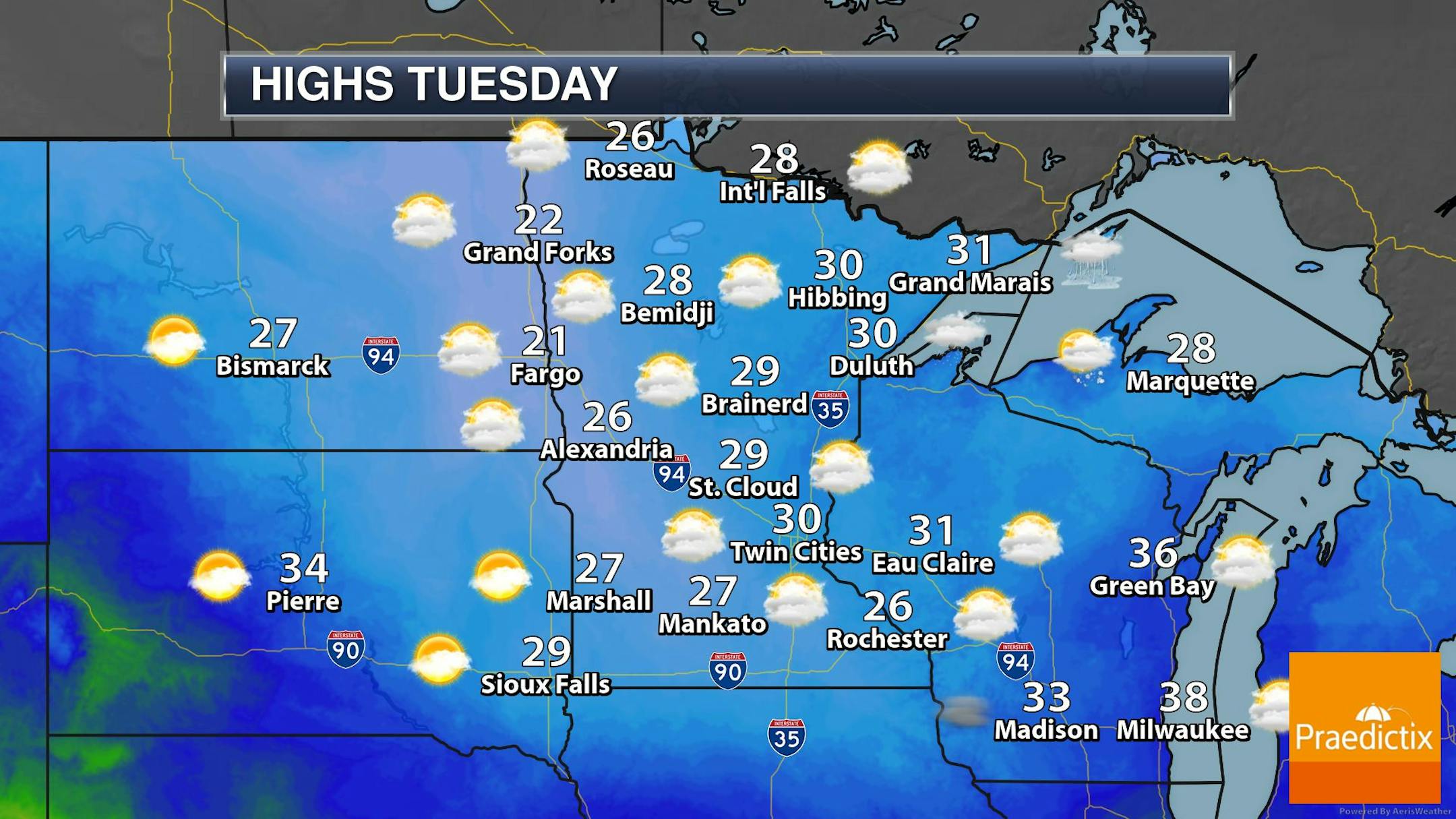 The weather outlook for the Twin Cities on Tuesday, January 8th shows quiet weather in place with a high approaching 30F. Skies will be cloudier with light winds.
