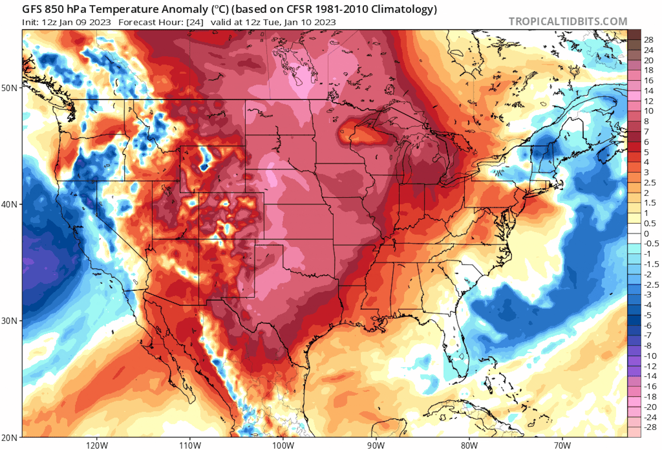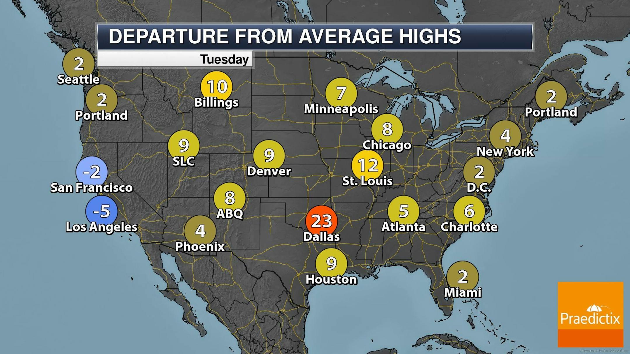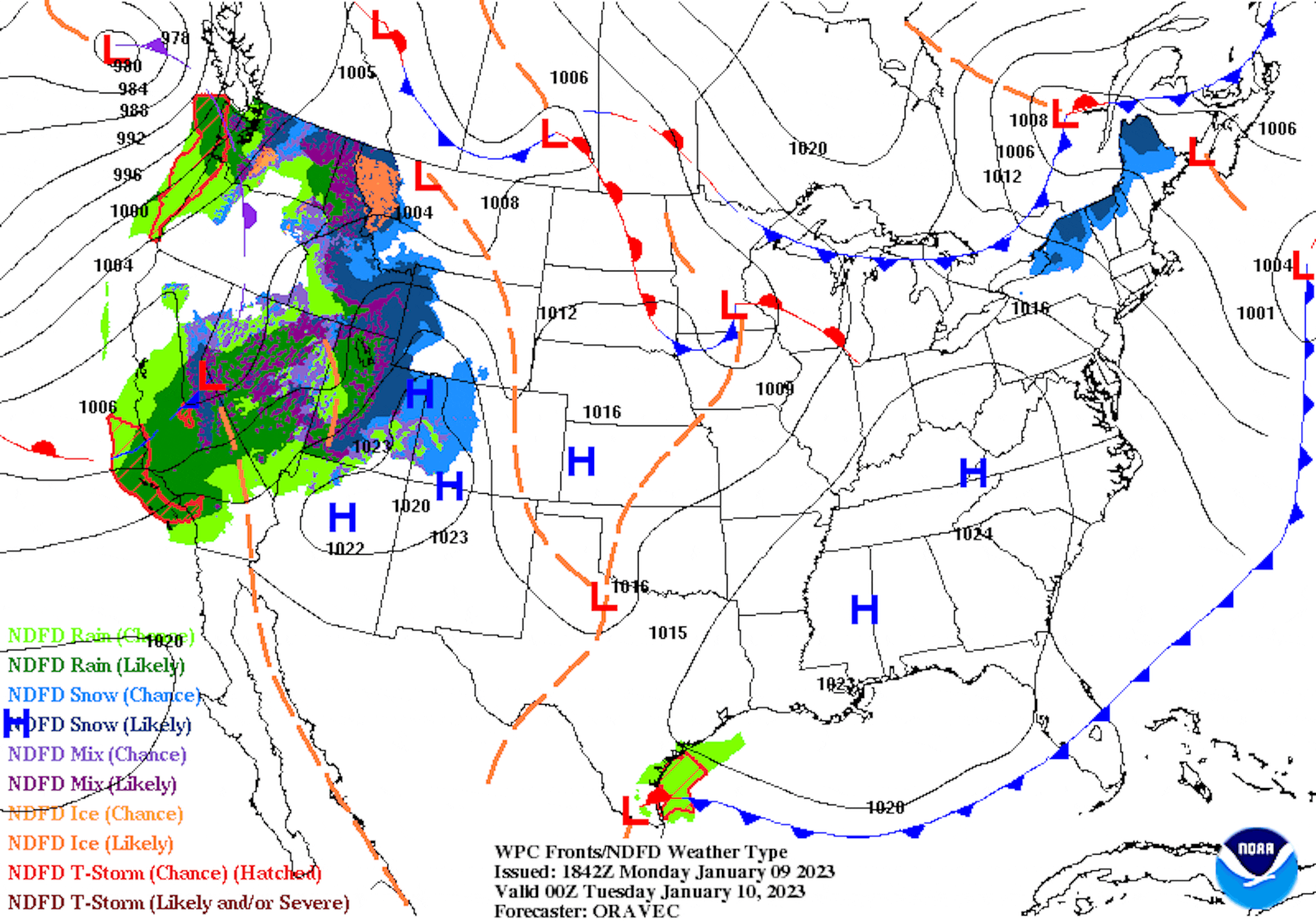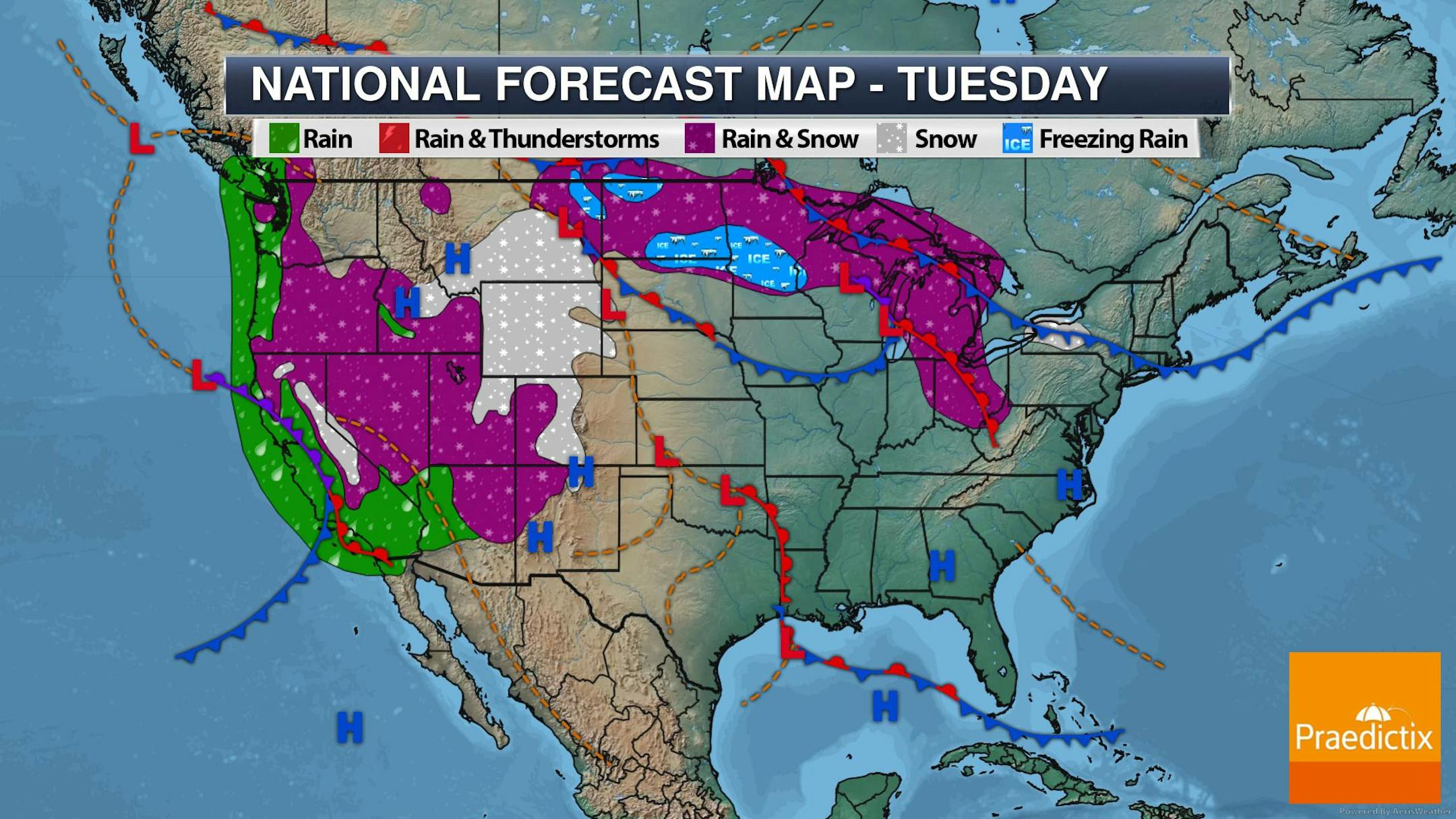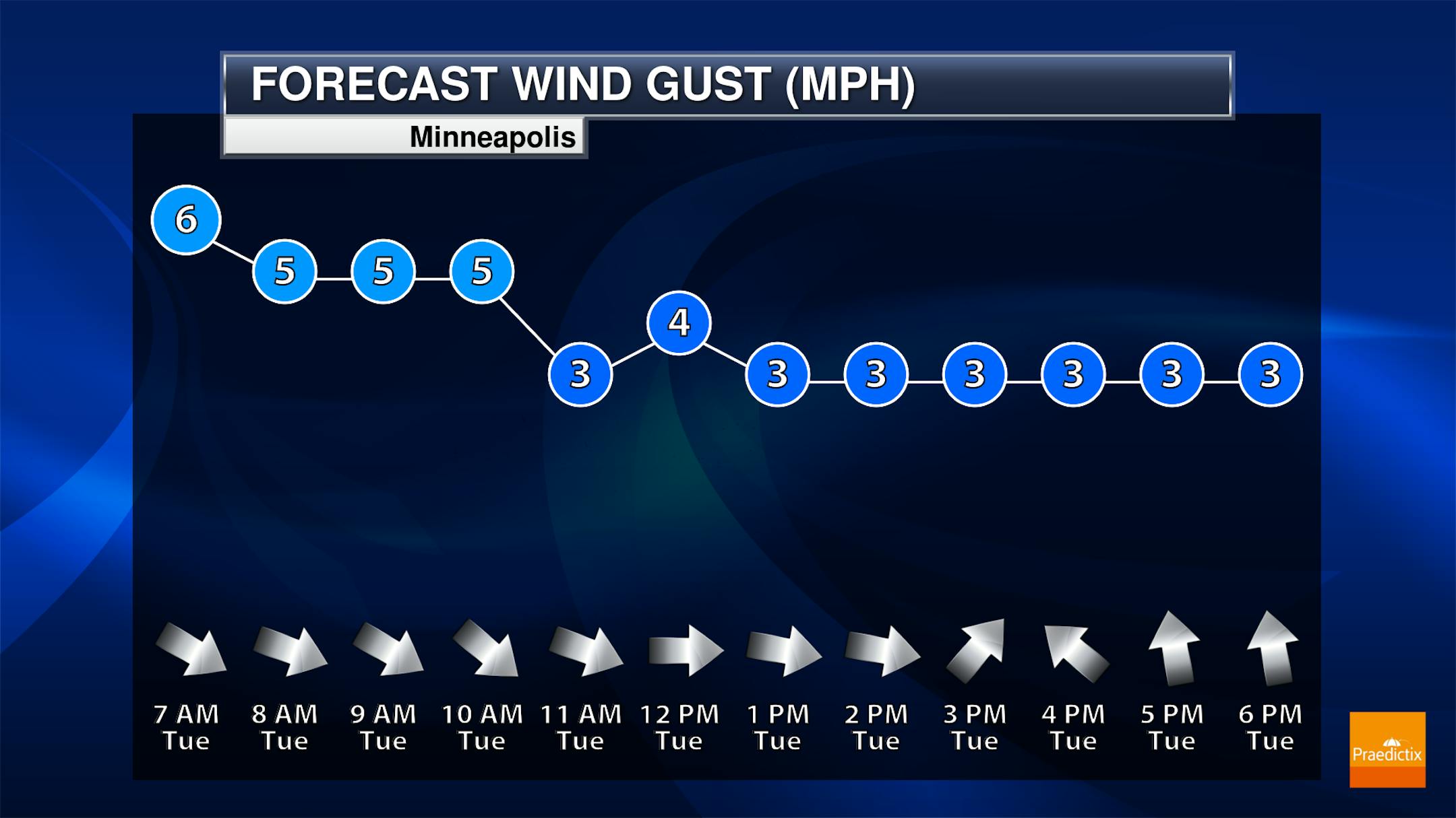 The weather outlook for the Twin Cities on Tuesday, January 8th shows quiet weather in place with a high approaching 30F. Skies will be cloudier with light winds.