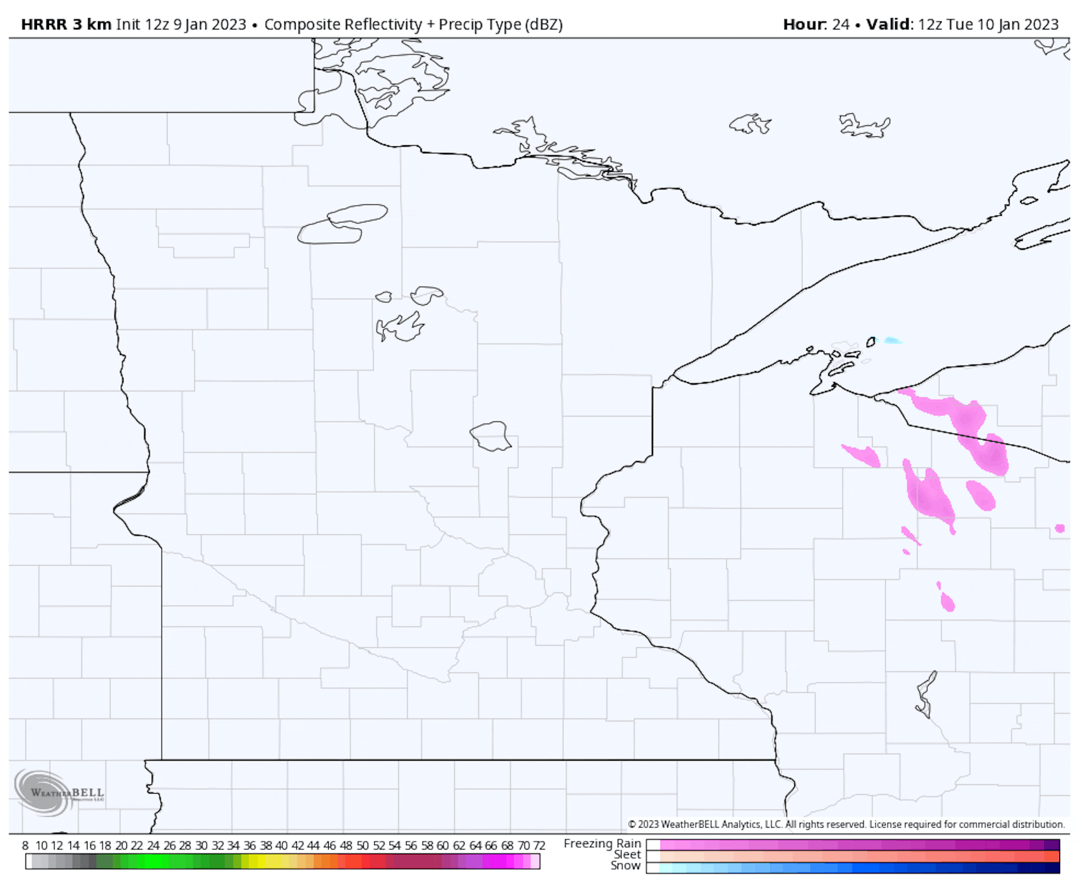 A band of light snow will be possible overnight Tuesday into early AM Wednesday mainly along and north of the I-94 corridor with up to 1" possible. Folks along the MN North Shore could see a couple/few inches through AM Wednesday. These minor snow accumulations could be responsible for slick/slippery roads for the Wednesday morning commute.