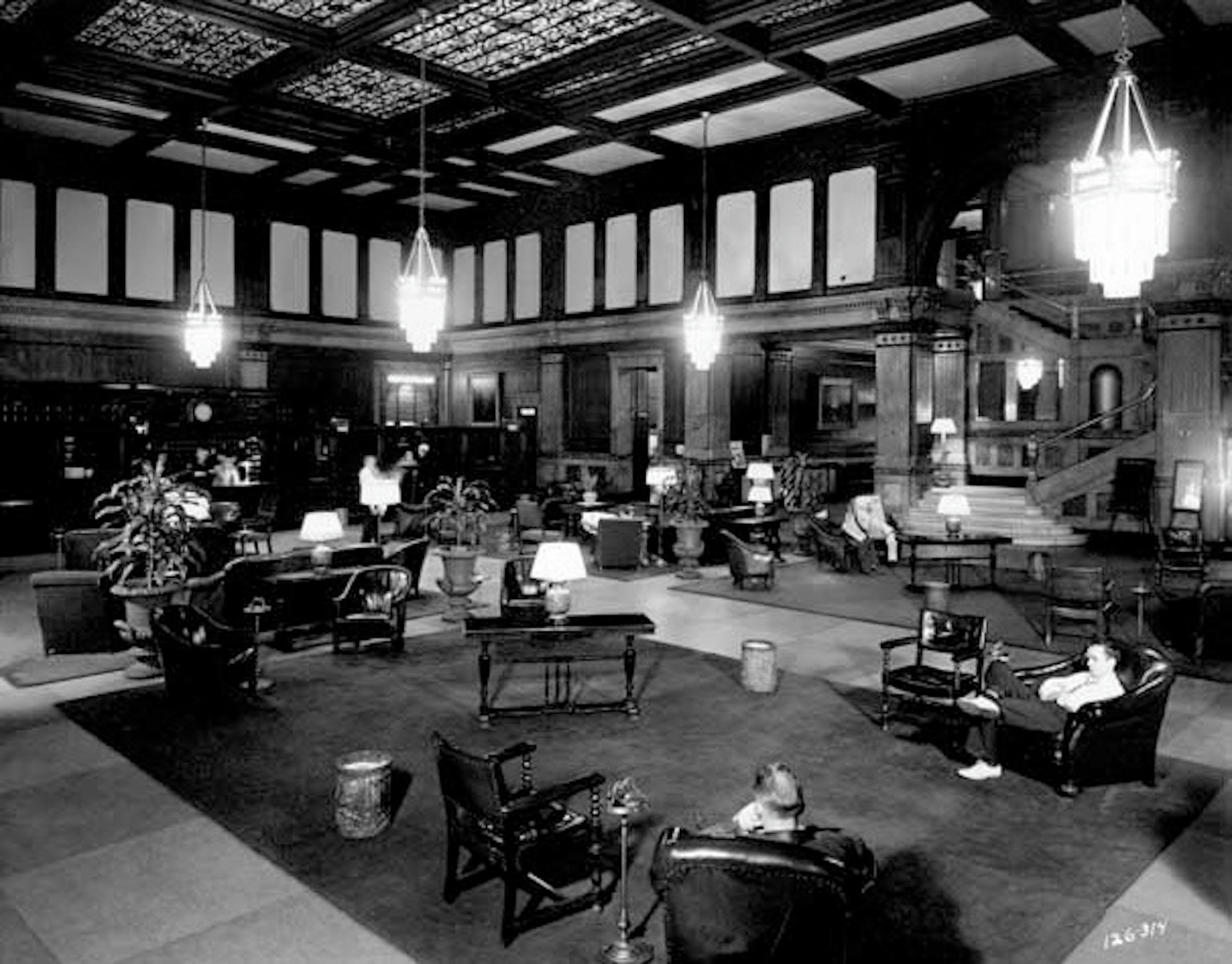 Here's a glimpse at the lobbies of two long-gone hotels. Above: West Hotel, Hennepin Avenue and 5th Street in downtown Minneapolis. Photo from September 1930. The hotel, named for its owner, Benjamin West, was demolished in 1940. Most of the site has been a parking lot ever since, although part of it is now occupied by the Cowles Center.