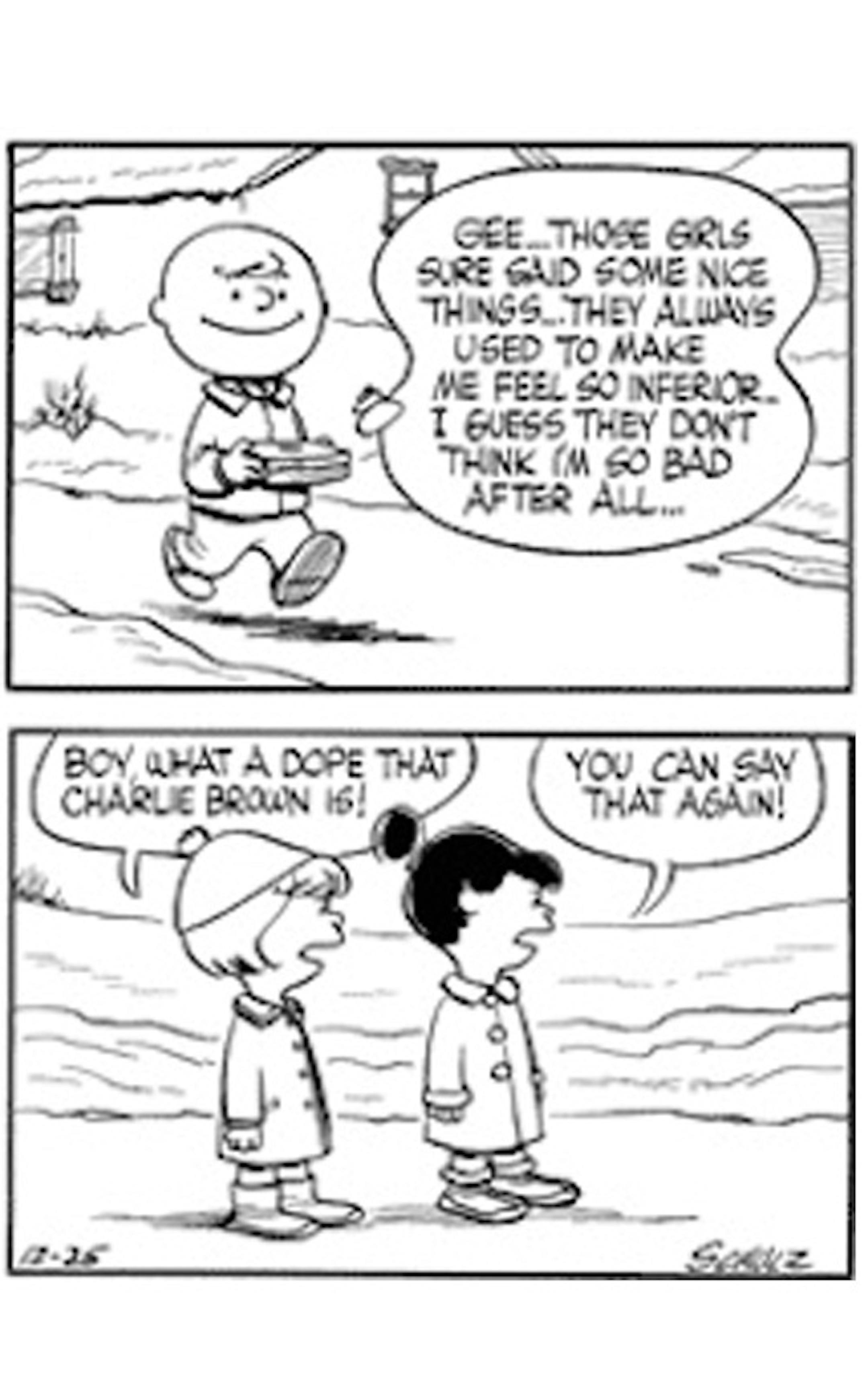 It's just cruel. It's funny only if you want side with the girls' cruelty. Perhaps it was funny at the time because nothing on the comics page revealed human nastiness with such stark frankness As the author notes: "And then there were other strips that were just pitch black, with no happy resolution or redemption. Because sometimes, life isn't fair." Then came Snoopy, and when he started standing up and playing characters it was all warm & fuzzy huggyfests.