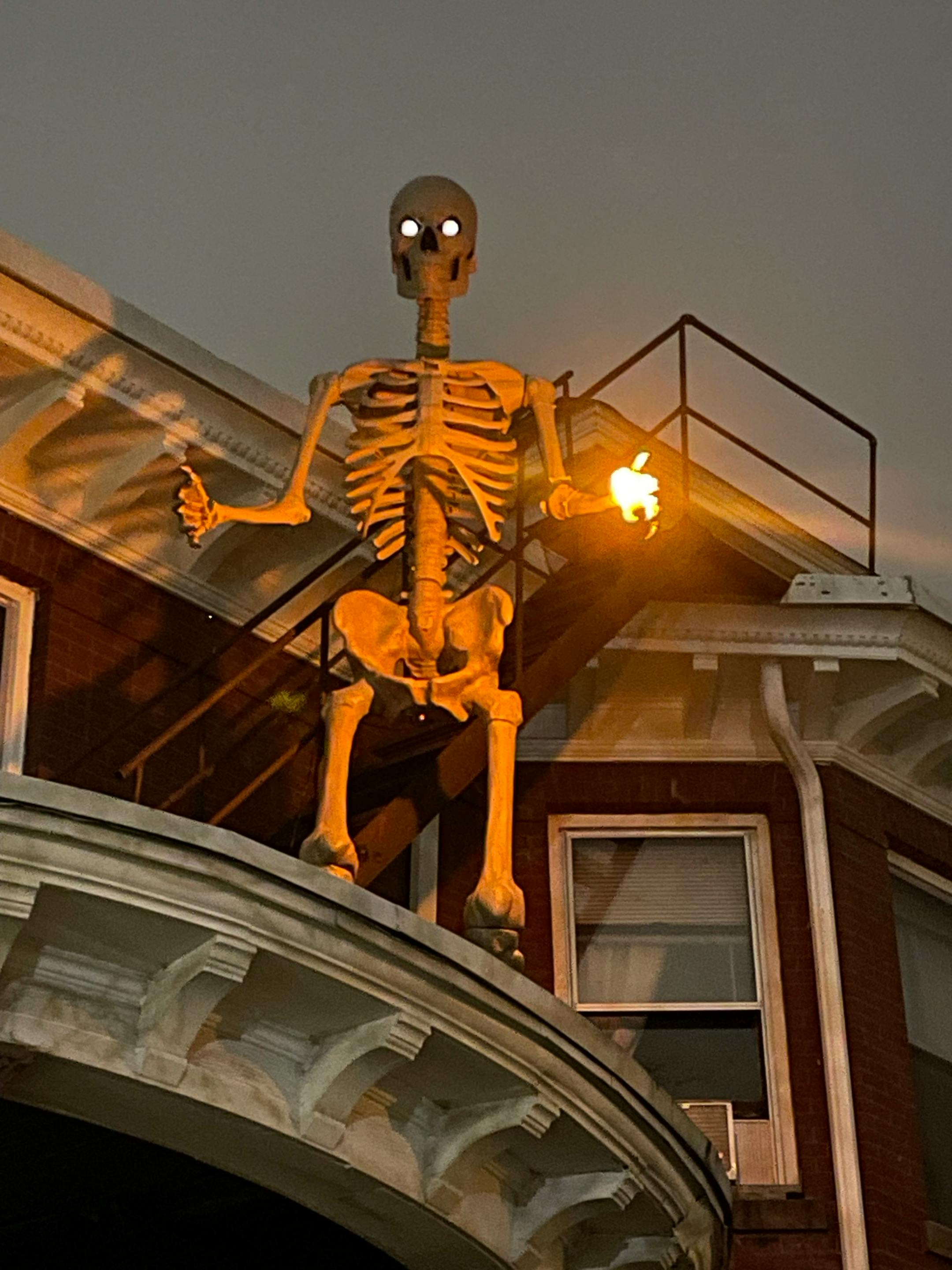 On a rooftop in Minneapolis’ Uptown area, another giant skeleton stands tall, flames glowing in its eyes.