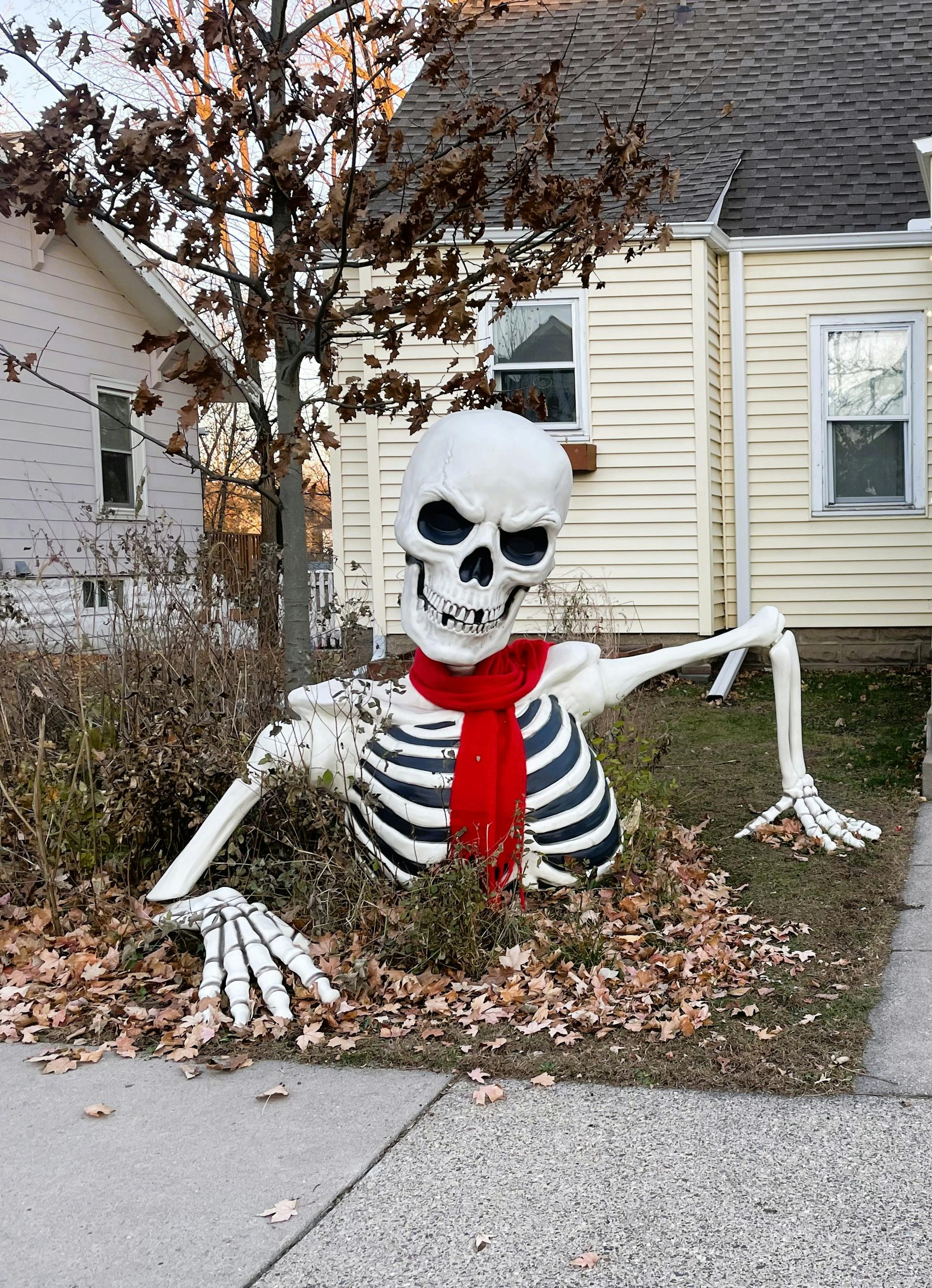 A giant skeleton torso on a south Minneapolis lawn didn’t disappear after Halloween. Instead, it got a huge red scarf.